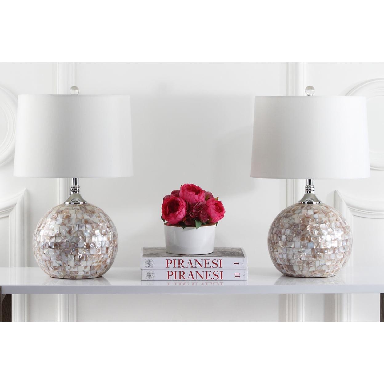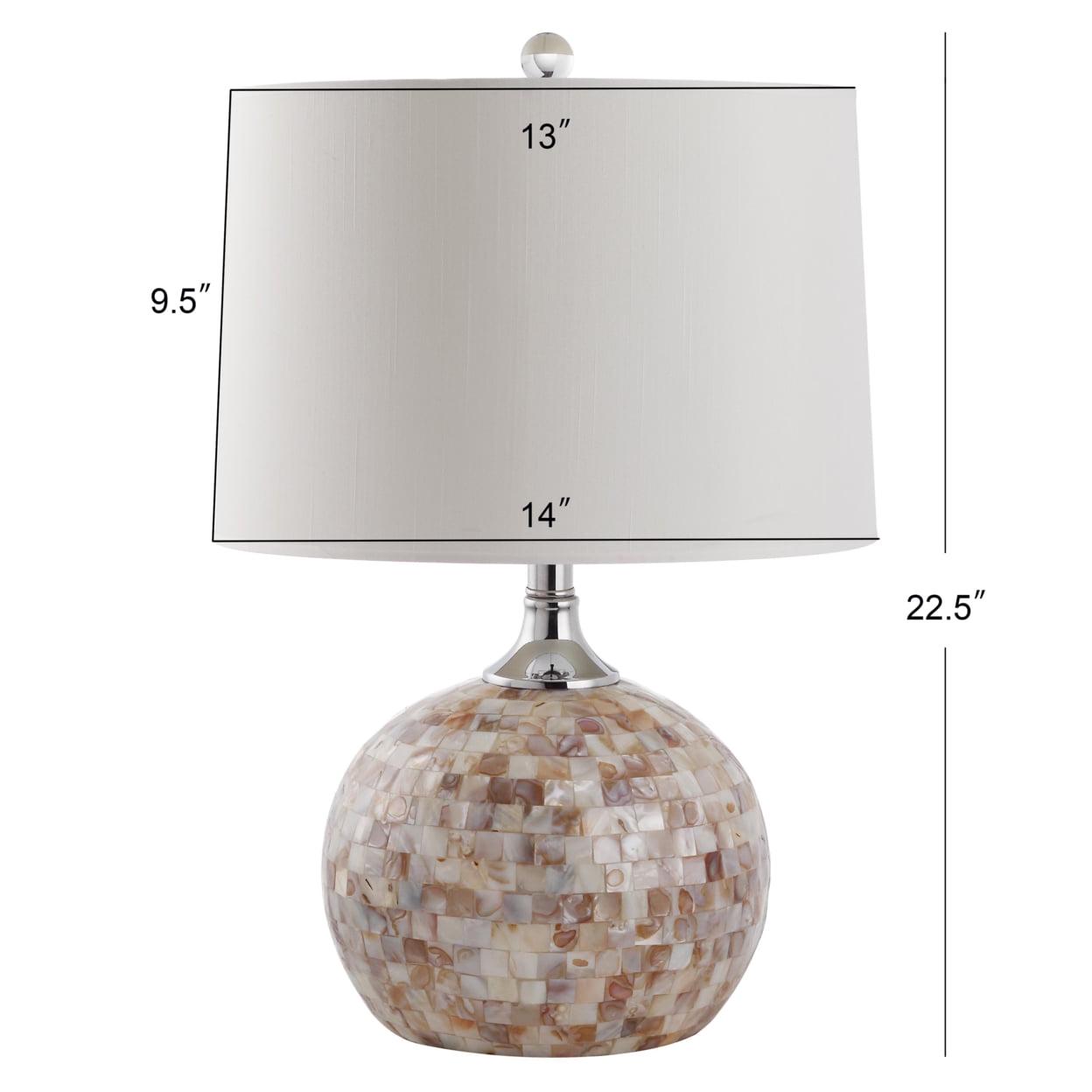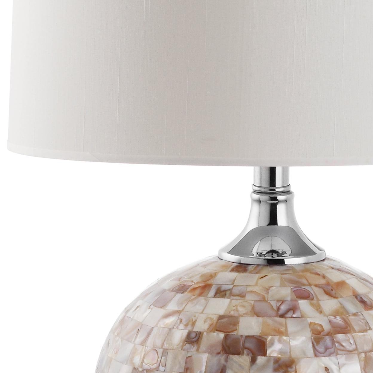 The classic orb shape of this Nikki Table Lamp is updated with the sheen of a capiz shell mosaic in pearly tones from off white to earthy pinks and browns. Topped with a crisp white drum shade that illuminates the room, Nikki is sold in sets of two.