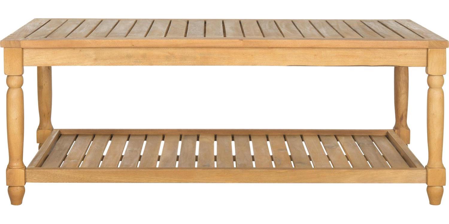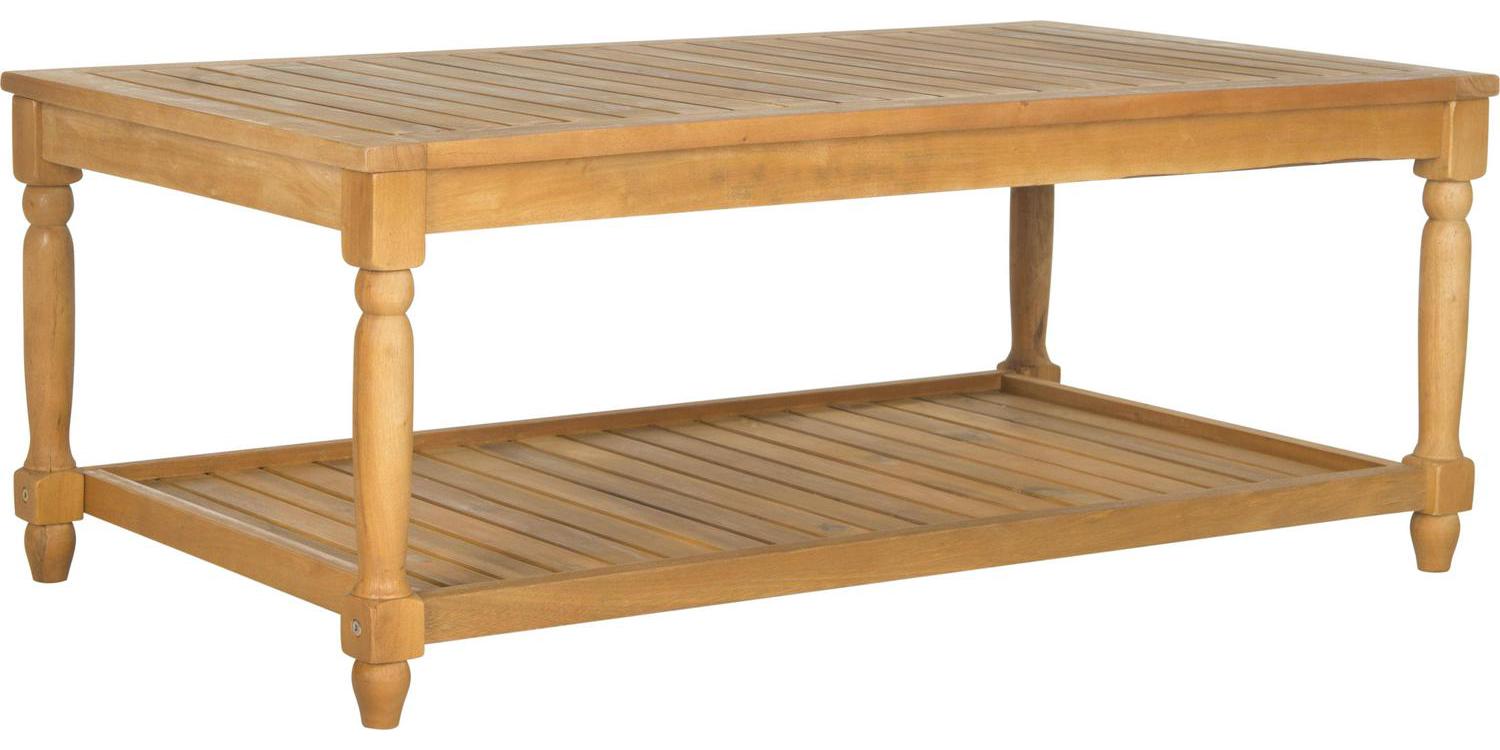 Designed to evoke the charm of coastal cottage style, the Oakley outdoor coffee table combines form and function. Crafted of acacia wood in natural, this piece boasts artfully turned legs, and slats on its tabletop and lower shelf for quick drainage.