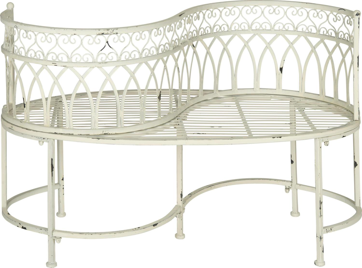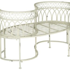 SAFAVIEH Outdoor Collection Lara Kissing Bench Antique White Designed after a Victorian garden staple, this Lara Kissing Bench overflows with vintage charm. Lara’s romantic heart shaped details and flourishing scrolls in antique white iron lend any outdoor space an enchanting ambiance.