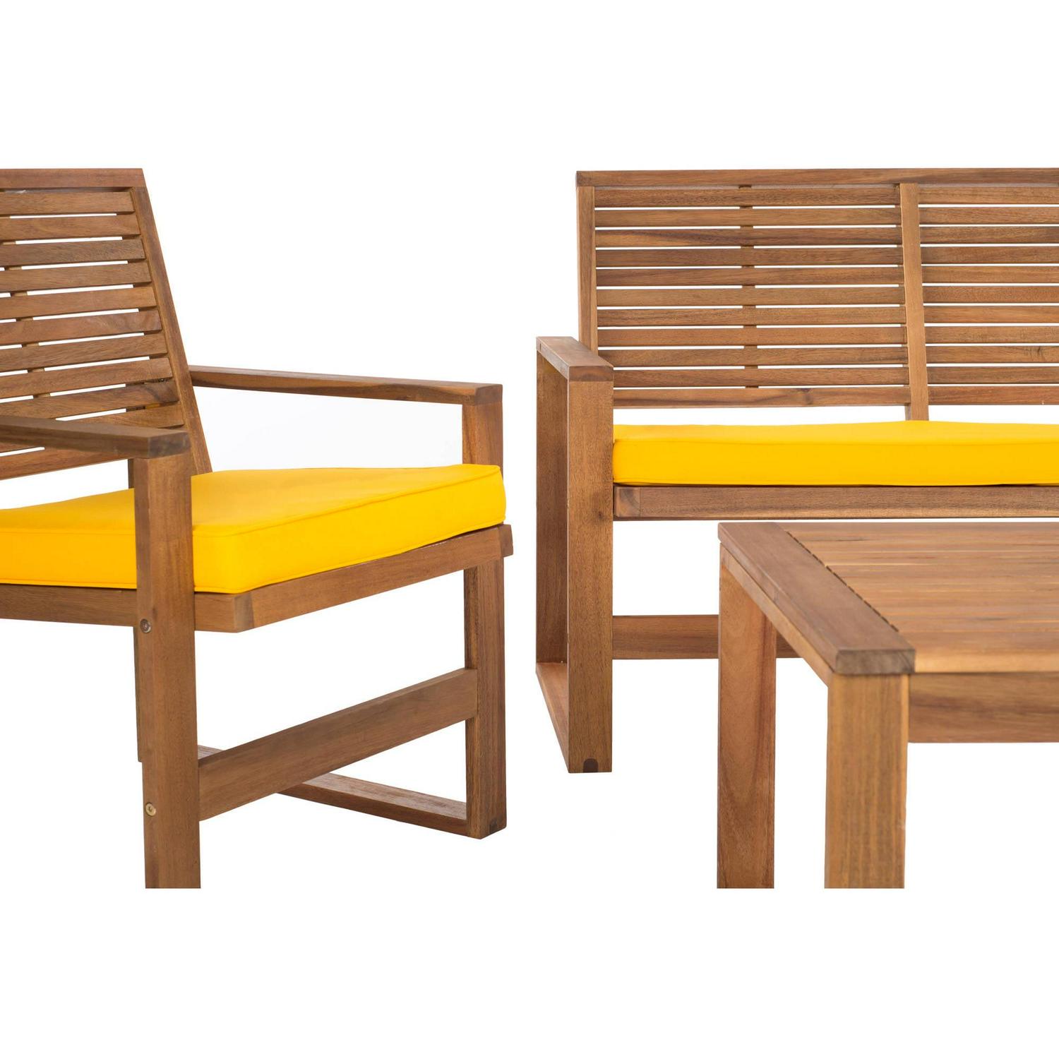 Give your outdoor space a touch of resort-chic comfort and style with the Safavieh Ozark 4-Piece Conversation Set. Crafted of weather-resistant Acacia, the set is extremely durable. Each piece is designed with a transitional update of the classic slatted outdoor furniture beloved in England for centuries. Featuring solid wood and upholstered cushions suitable for the toughest weather conditions, this set is a great choice for your deck or patio. The cushions are made from 100 percent waterproof Terylene materials for exceptional comfort. The chairs have a weight capacity of 440 lbs., ensuring they can be used by everyone. This outdoor conversation set is easy to assemble and comes with all the needed hardware included. With two chairs, a loveseat and a table, you will have everything you need to entertain family and friends. The 4-piece patio conversation set blends functionality and elegance.