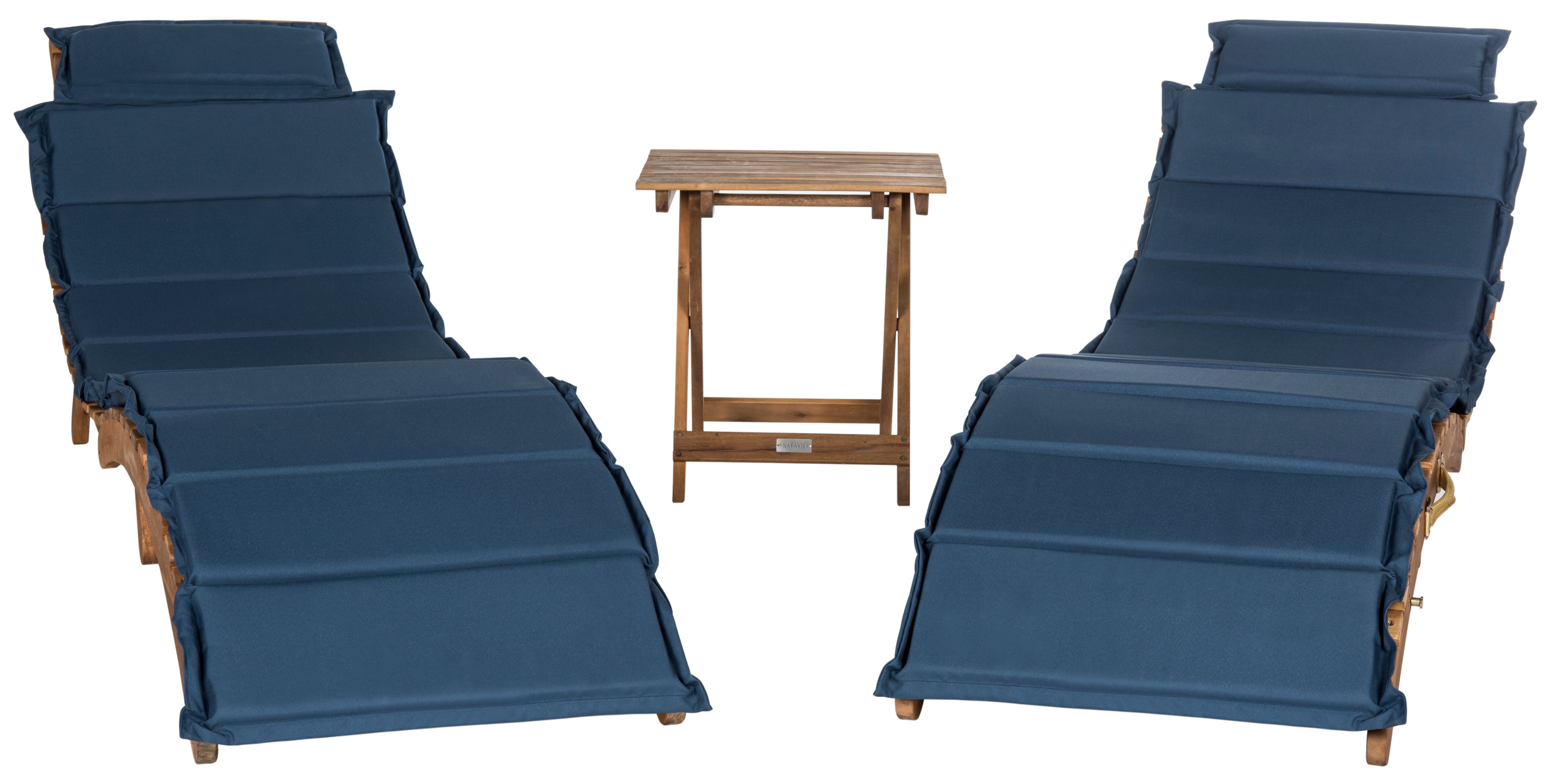 Shop Safavieh at . Save Money. Live Better. Safavieh Pacifica Outdoor Modern 3 Piece Lounge Set with Cushion The nautical look assumes a chic new attitude with the elegant lines of this three-piece outdoor lounge set. Weather resistant, UV-treated navy blue cushions complement natural lounge chairs and coordinating side table in sustainable acacia wood.