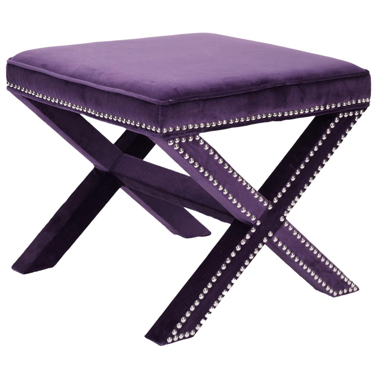 SAFAVIEH Palmer Ottoman Silver Nail Head Purple The Palmer Ottoman offers a designer look that gives your decor a glamorous finishing touch. Its classic form, royal purple wool blend fabric, and silver nail head trim make Palmer versatile enough for any interior.