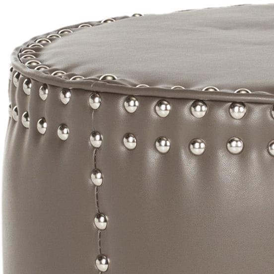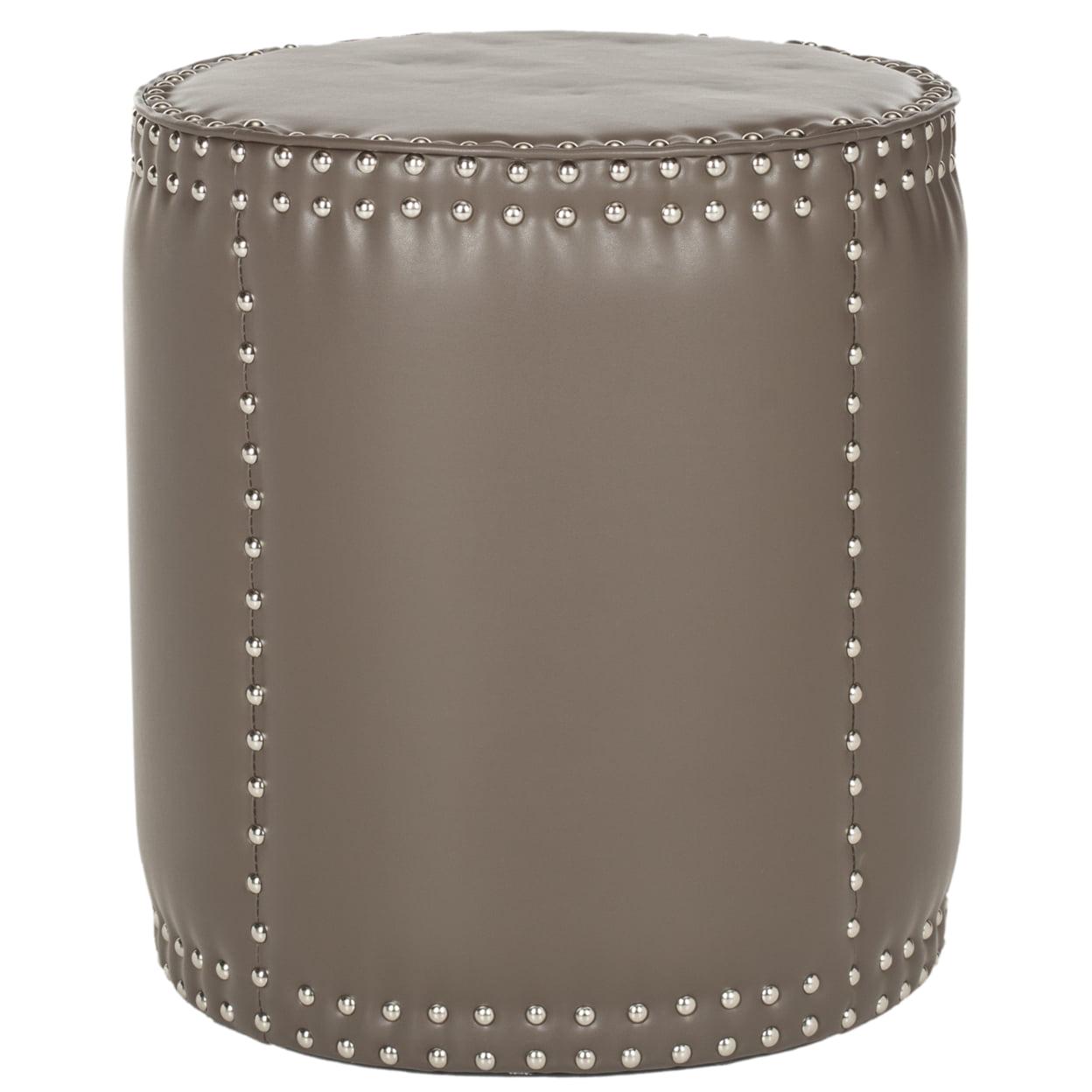SAFAVIEH Paula Ottoman Silver Nail Head Clay The rustic chic Paula Ottoman complements contemporary and transitional interiors with its tall drum shape, oversized brass nail head trim, and clay toned PU leather. Plush and inviting, Paula is equally fabulous as an extra seat or impromptu tray.