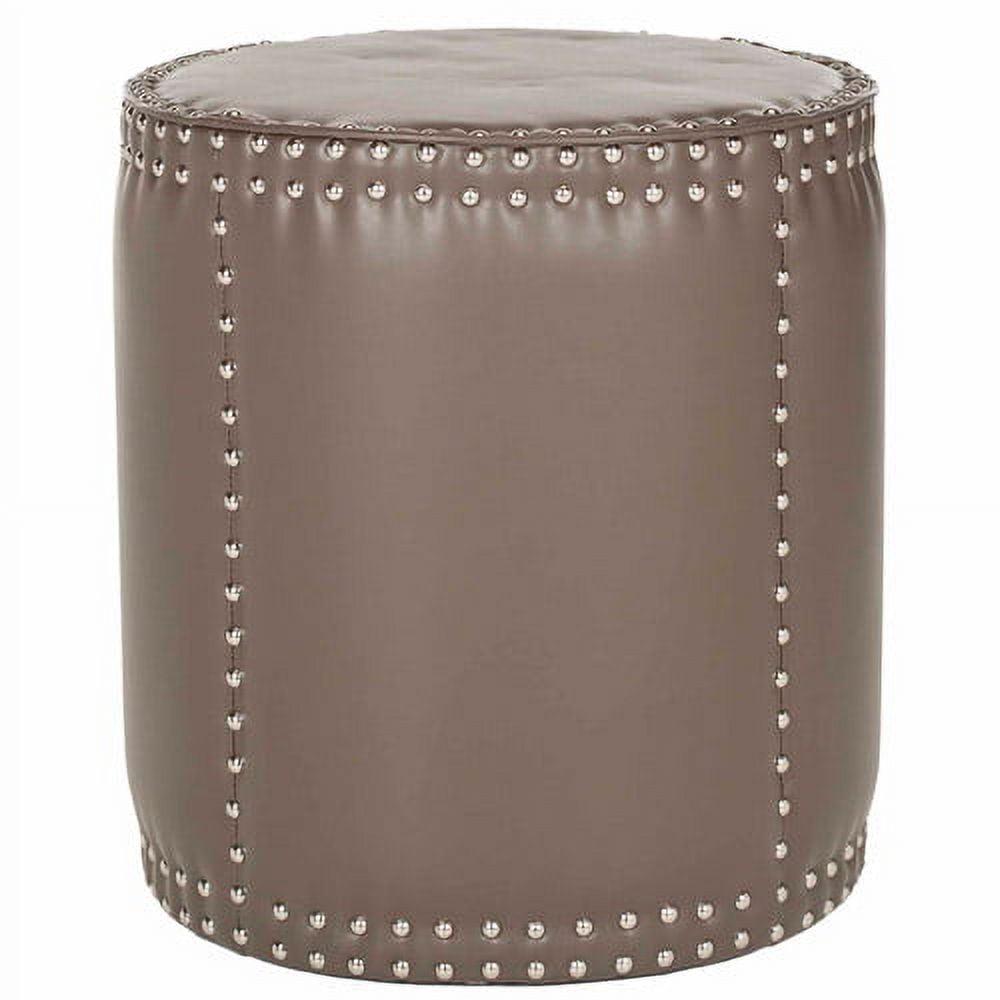 The rustic-chic Paula ottoman complements contemporary and transitional interiors with its tall drum shape, oversized brass nail head trim and easy care clay-toned bicast leather upholstery.
