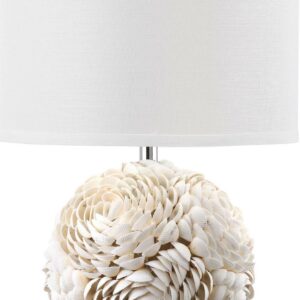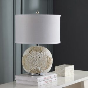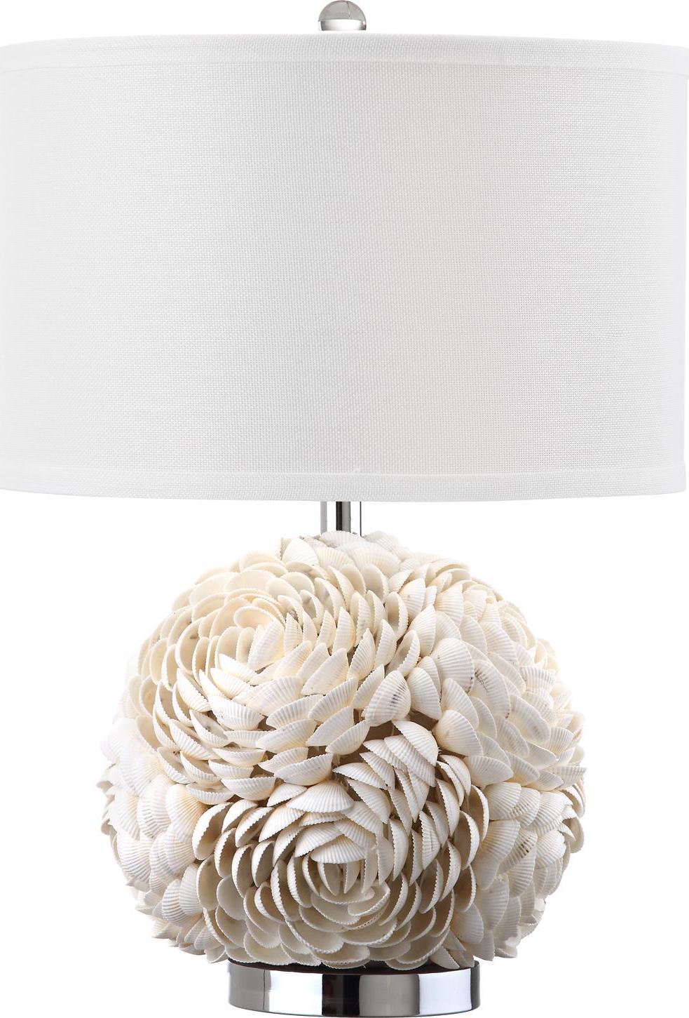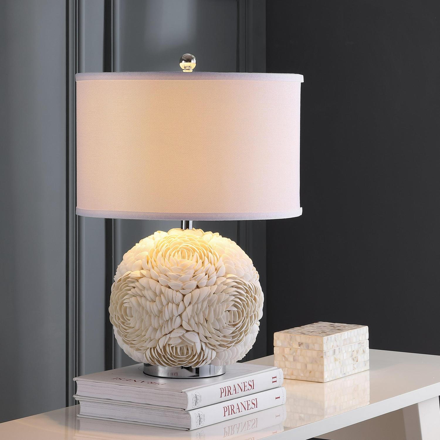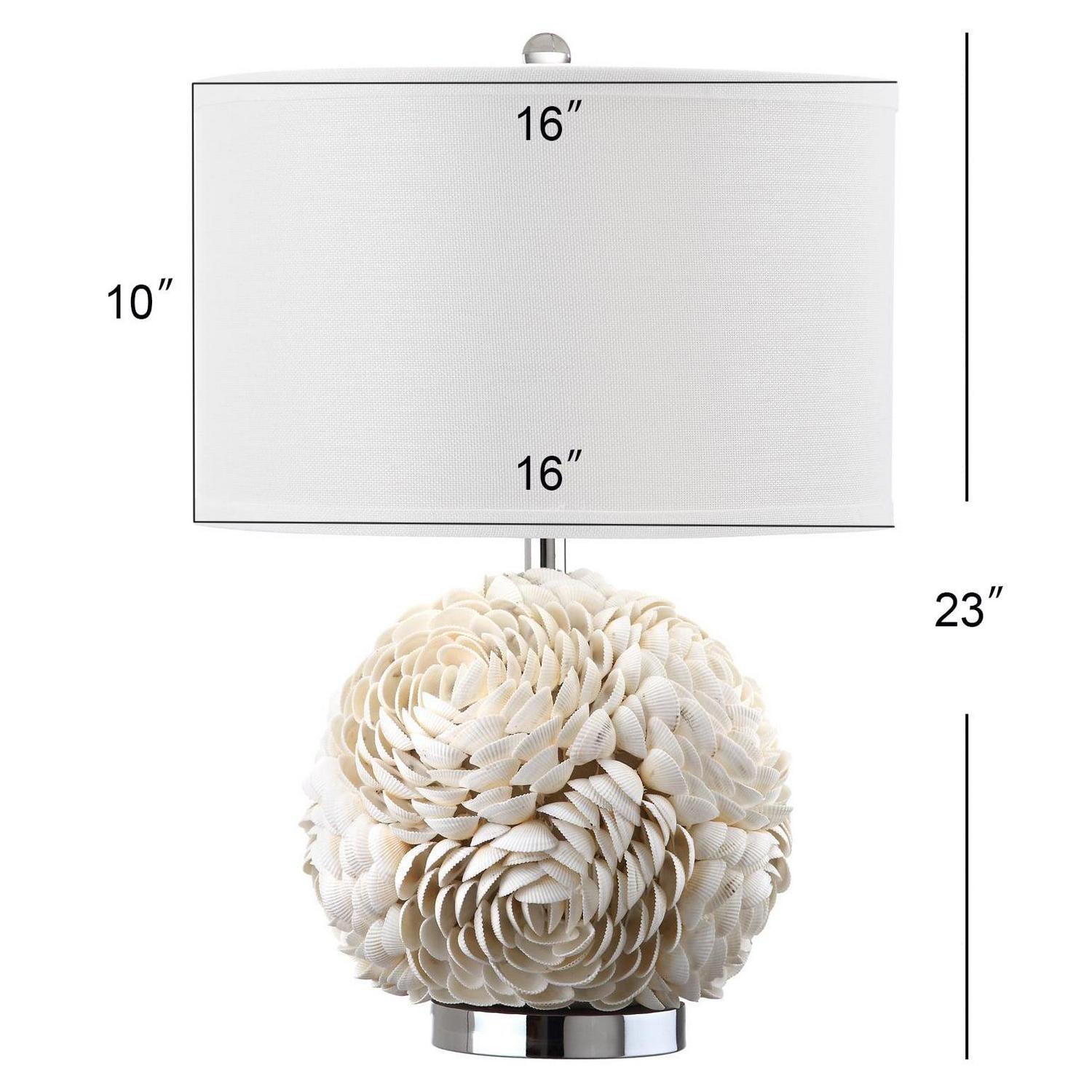 Shell artistry reigns in the distinctive base of the romantic Pauley table lamp. With large open blossoms crafted of individual seashells, this unique transitional lamp comes with a white textured cotton drum shade, and an acrylic pedestal and finial.