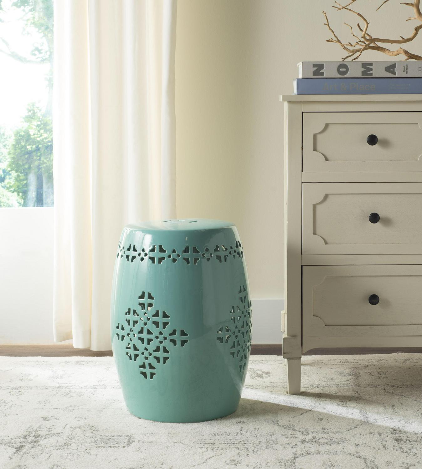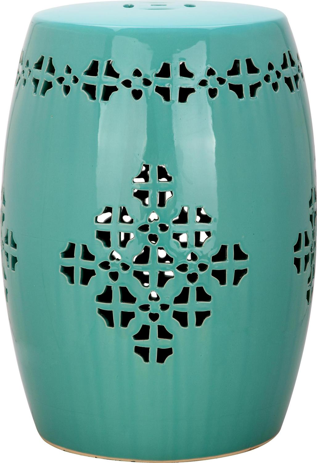 A global blend of Moroccan and Asian influences, the Quatrefoil indoor-outdoor garden stool in deep aqua is replete in boho-chic style. It four pierced medallions and decorative border are comprised of quatrefoil elements crafted from glazed ceramic.