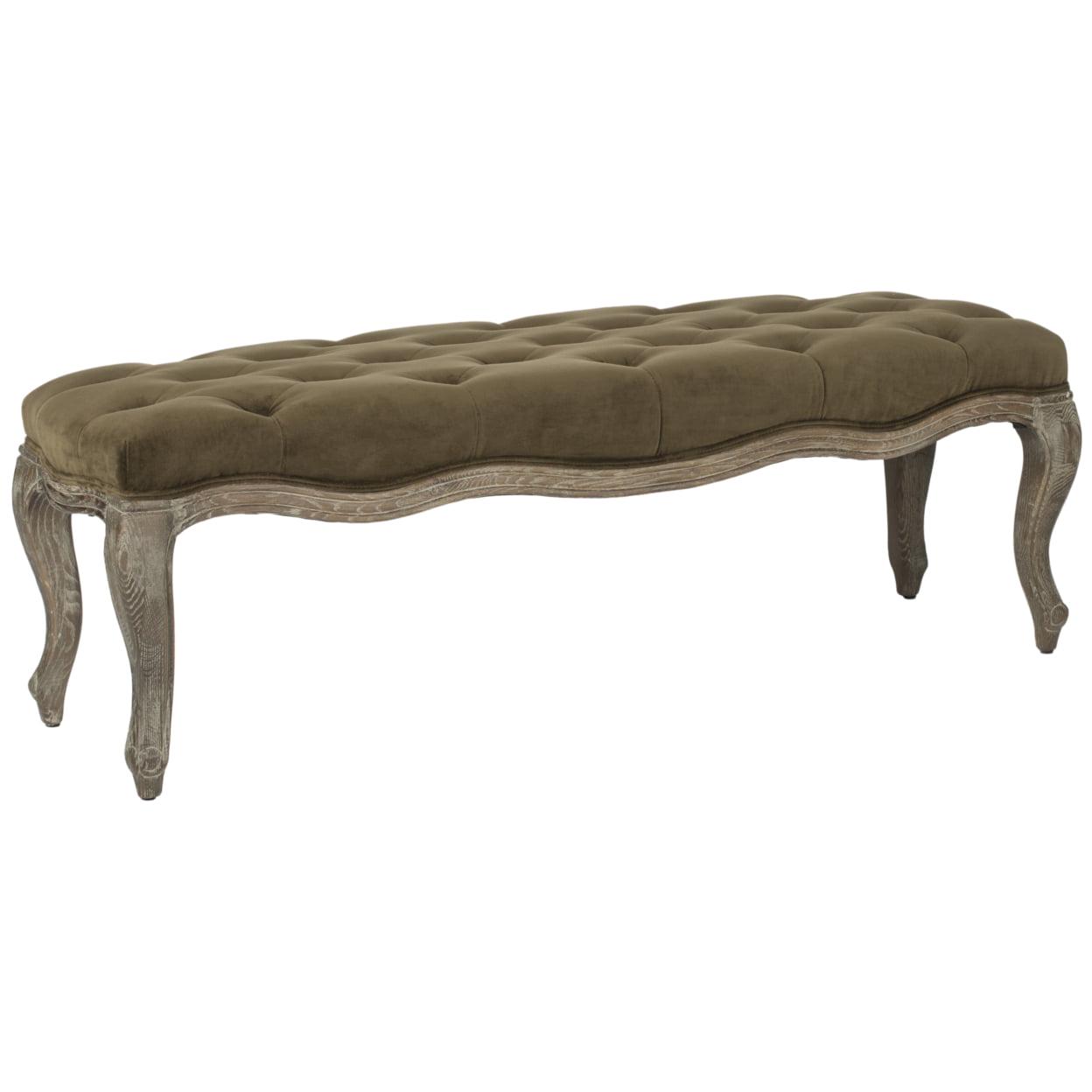 SAFAVIEH Ramsey Bench Spruce Exuding Country French charm, the Ramsey bench recreates the look of a family heirloom with beautifully carved distressed oak frame and timeless cabriole legs. Upholstered in spruce colored cotton velour, Ramsey makes a welcoming statement in an entry hall, and inviting one in bedroom or living room.