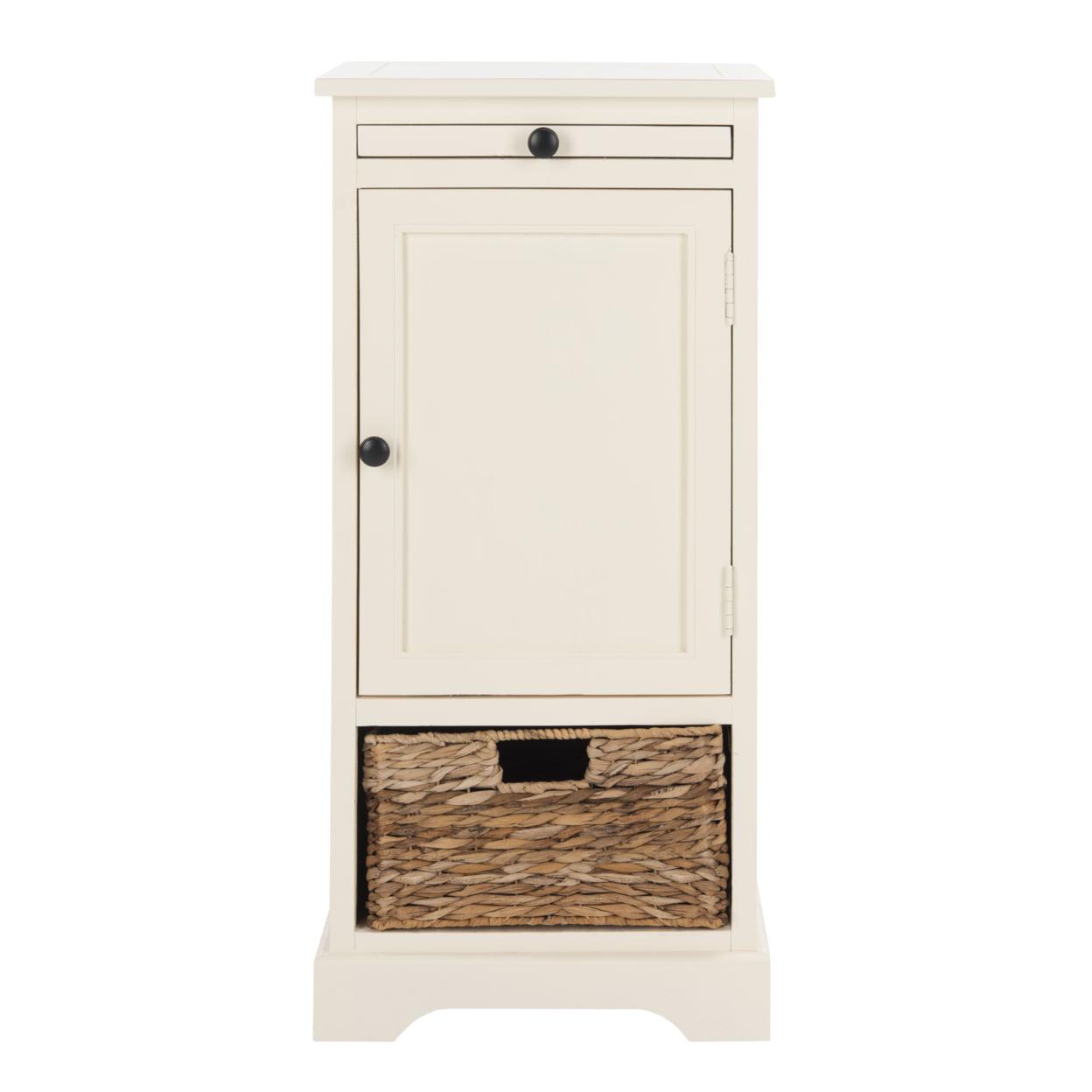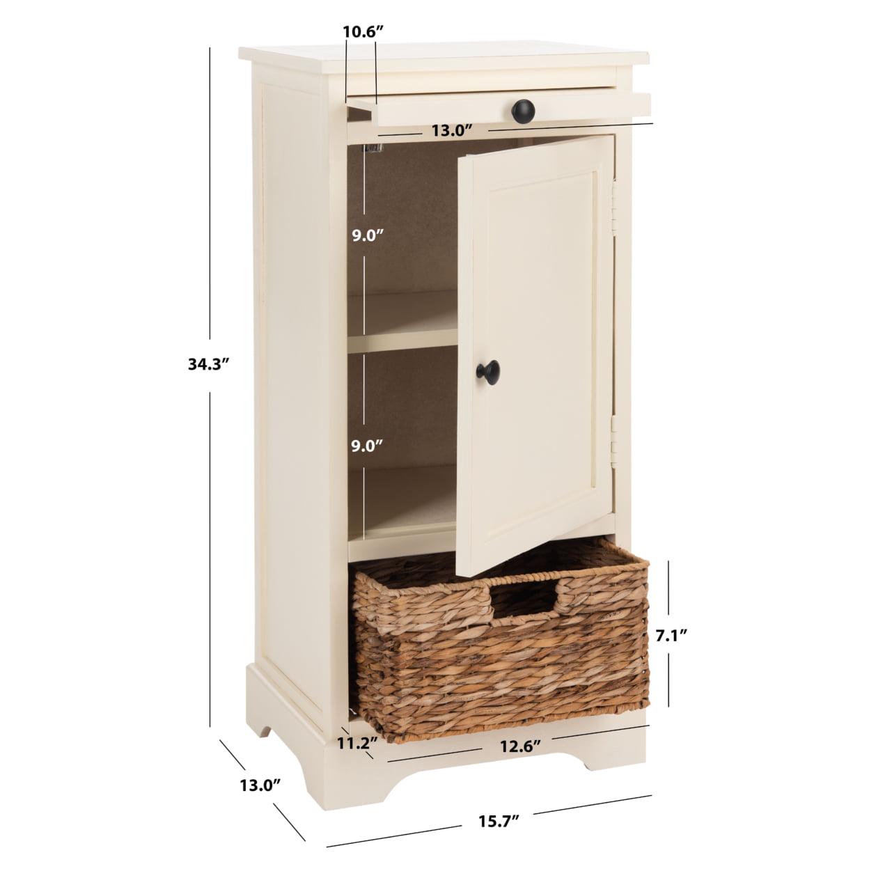 SAFAVIEH Raven Tall Storage Unit Distressed Cream This Raven Storage Unit is a stylish storage solution in any classic contemporary or farmhouse d cor. A two shelf cabinet in distressed cream and woven basket provide ample space for stashing away life’s miscellany, and a pull out writing surface makes Raven perfect for writing last minute notes in the entryway.