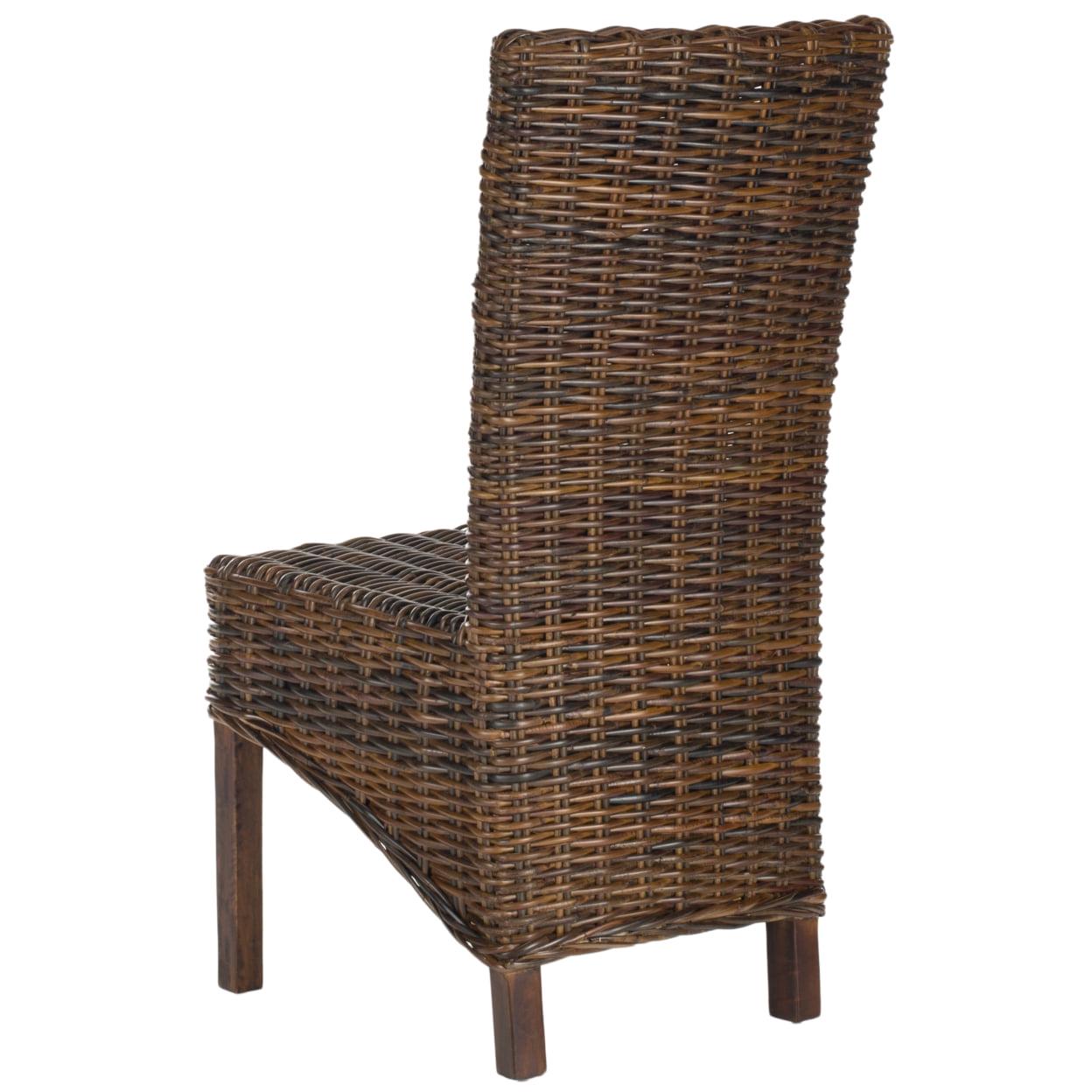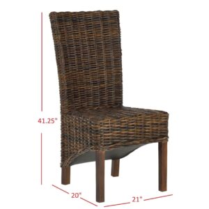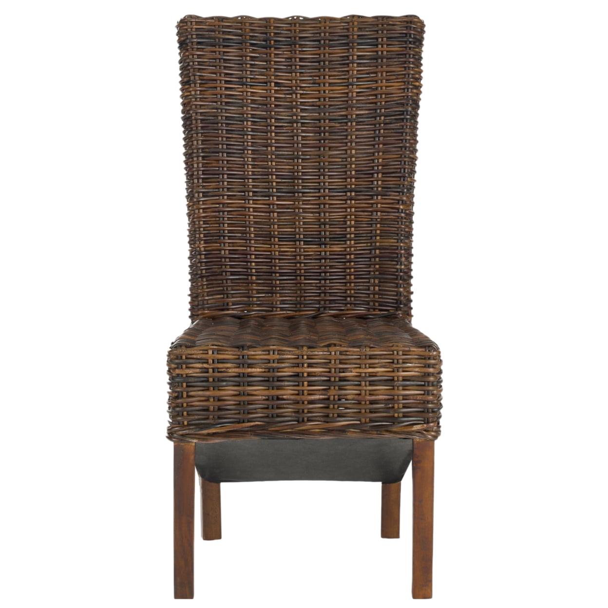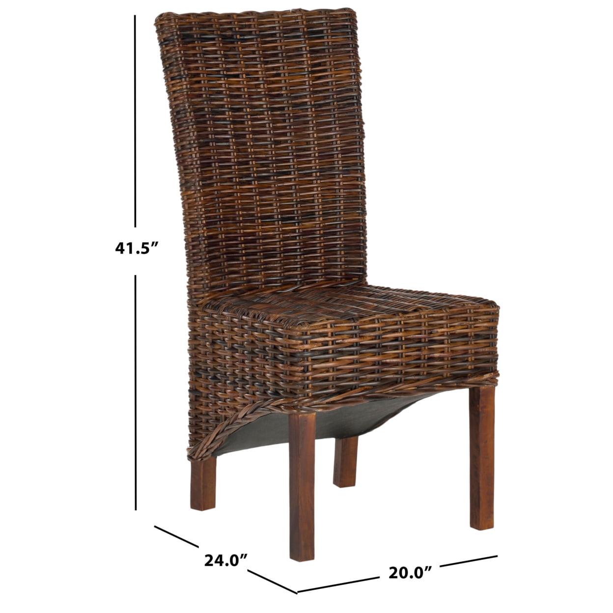 SAFAVIEH Ridge Side Chair Set of 2 Crocodile A familiar, elegant dining room form gets updated in the Ridge side chair, crafted of rattan and sustainable mango wood and shown in tropical dark brown finish. Organic rattan wraps around a tall, gently tapered backrest and seat; shorter rear legs and exposed underbelly offer yet another contemporary twist.