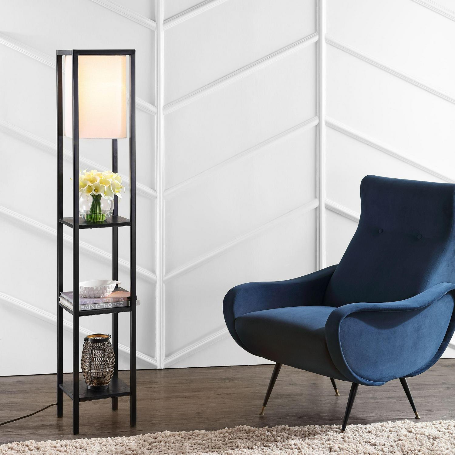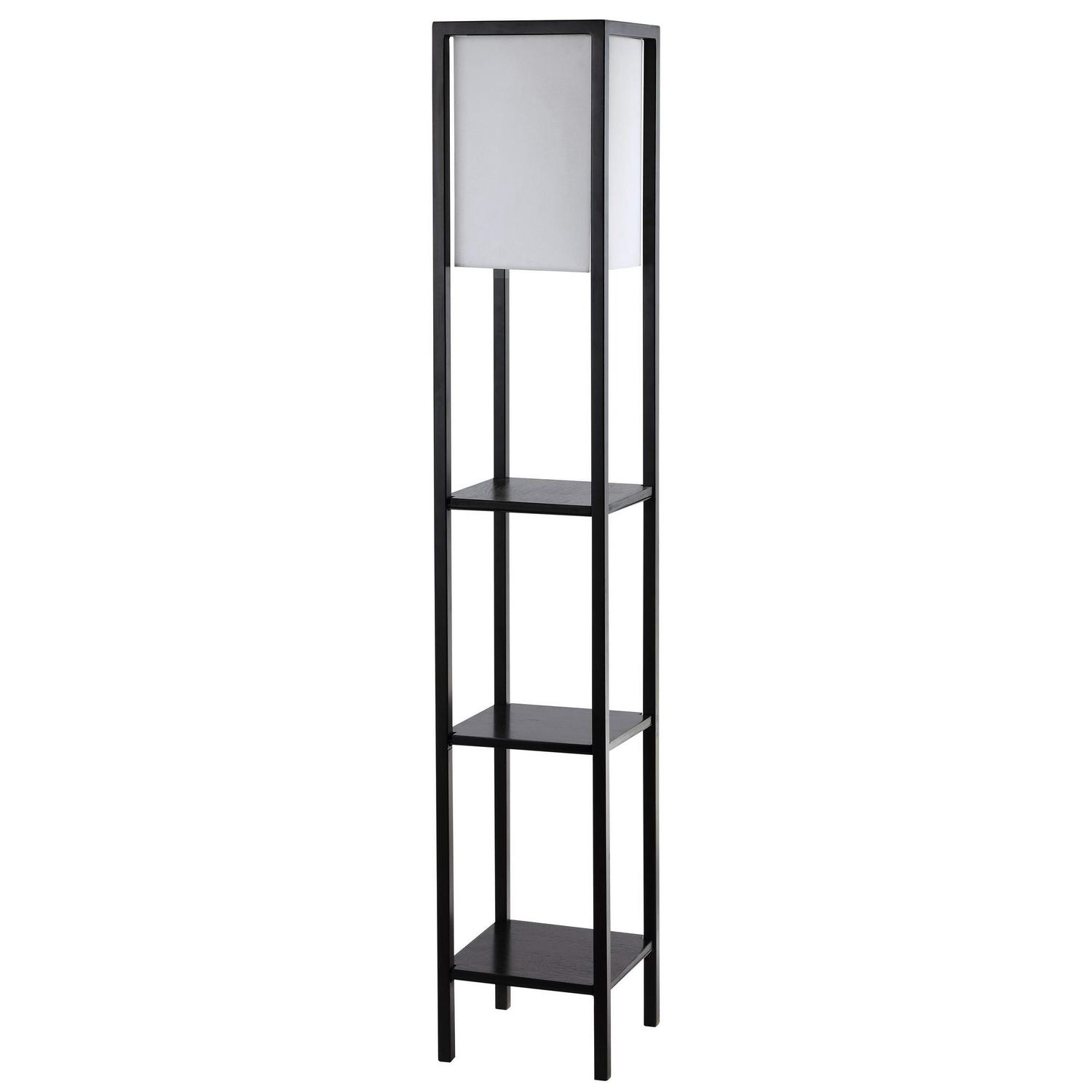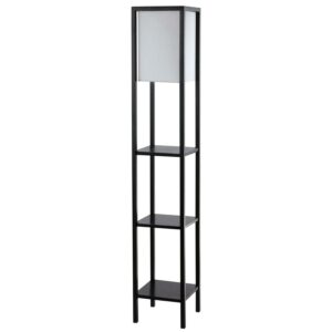 A chic blend of form and function, this shelf floor lamp is a stylish storage solution in any bedroom, living room, or home office. It’s black metal frame features matching black shelves and a sleek off-white shade.