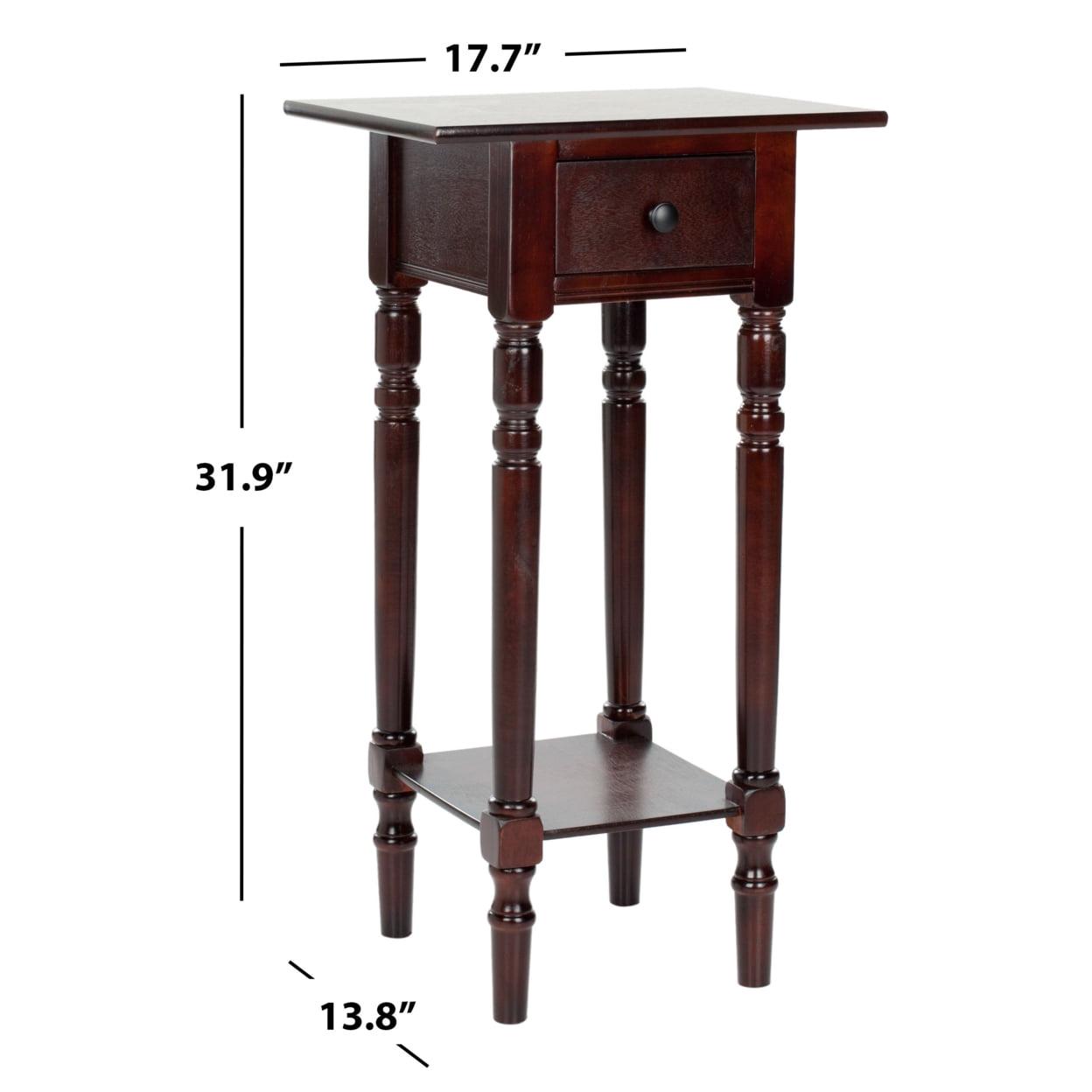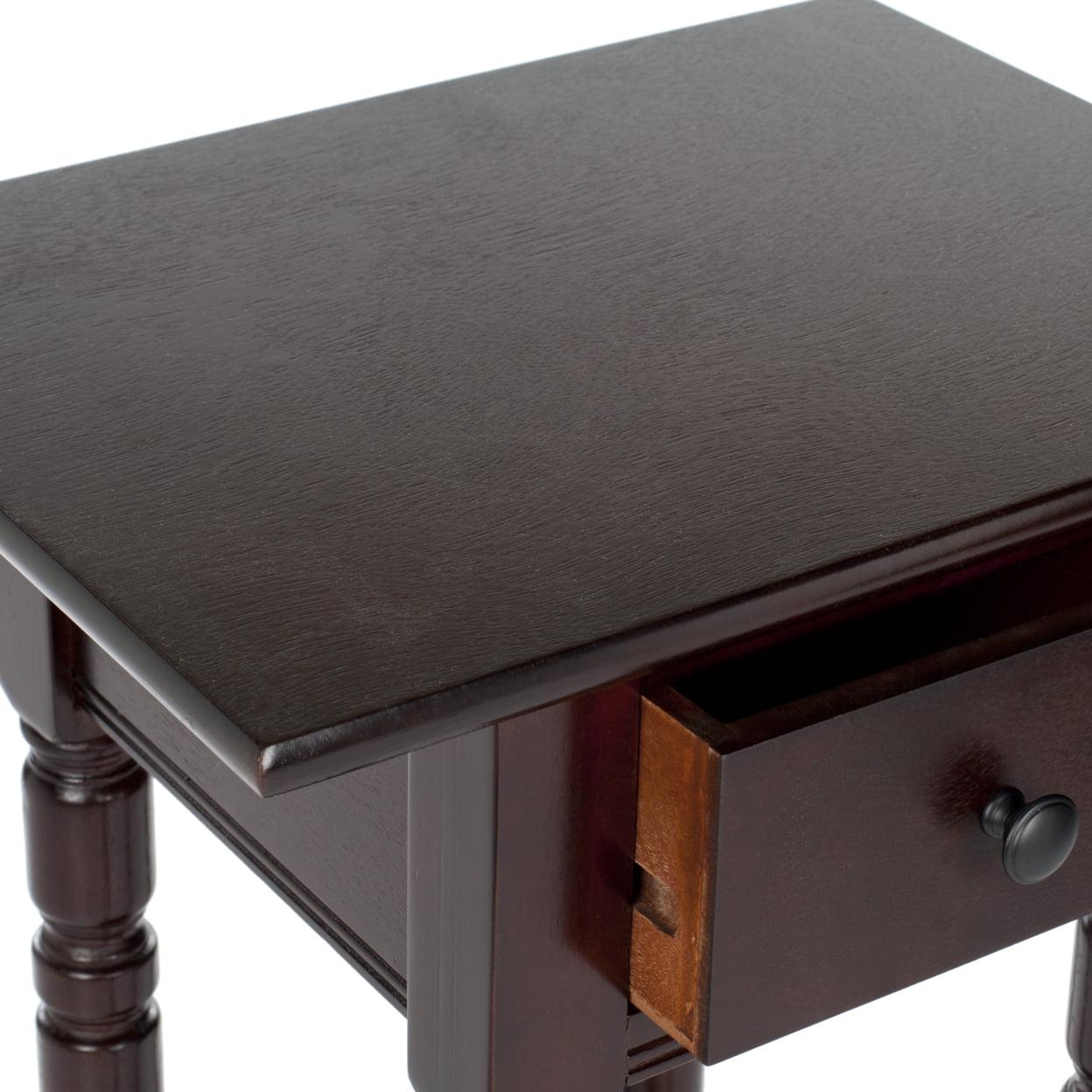 SAFAVIEH Sabrina End Table With Storage Drawer Dark Cherry Highlighting the best of country chic decor, this Sabrina End Table is the ideal small space solution. Sabrina’s classic carved details shine through a pine wood construction in a dark cherry finish, complementing any room’s color scheme with ease and style.