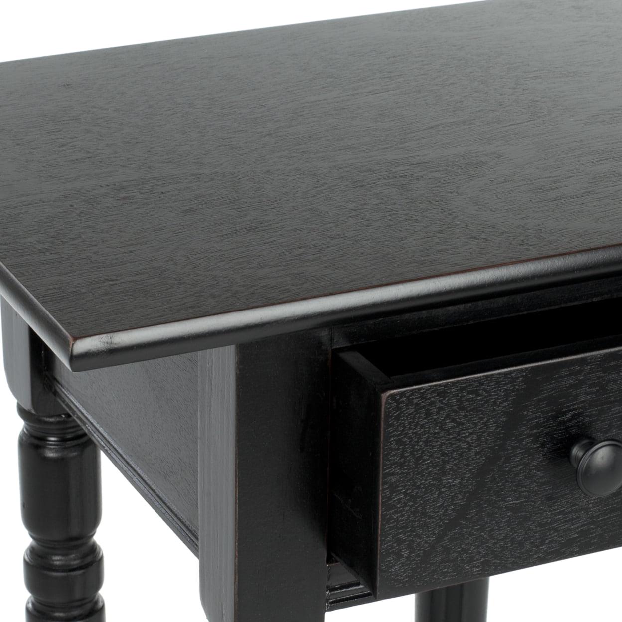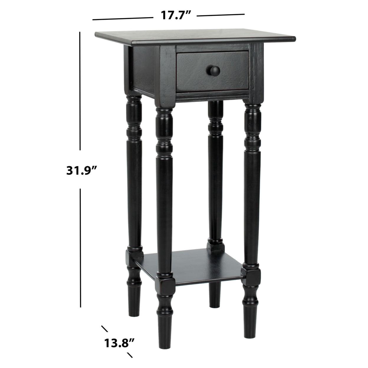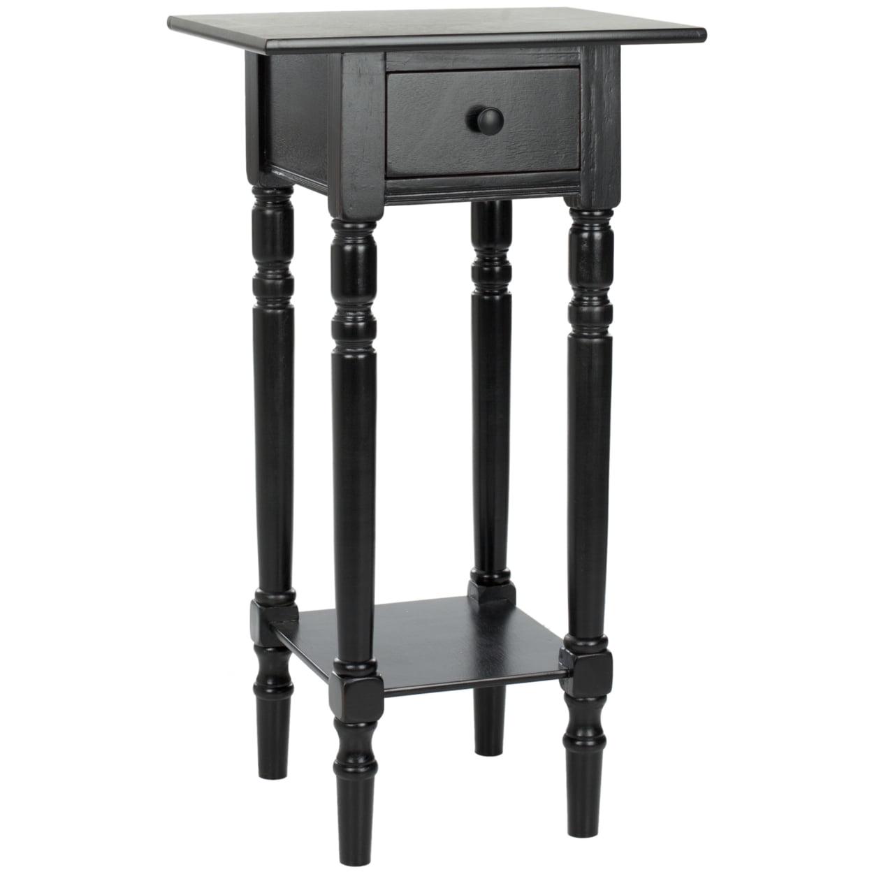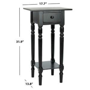 SAFAVIEH Sabrina End Table With Storage Drawer Distressed Black Highlighting the best of country chic decor, this Sabrina End Table is the ideal small space solution. Sabrina’s classic carved details shine through a pine wood construction in a distressed black finish, complementing any room’s color scheme with ease and style.