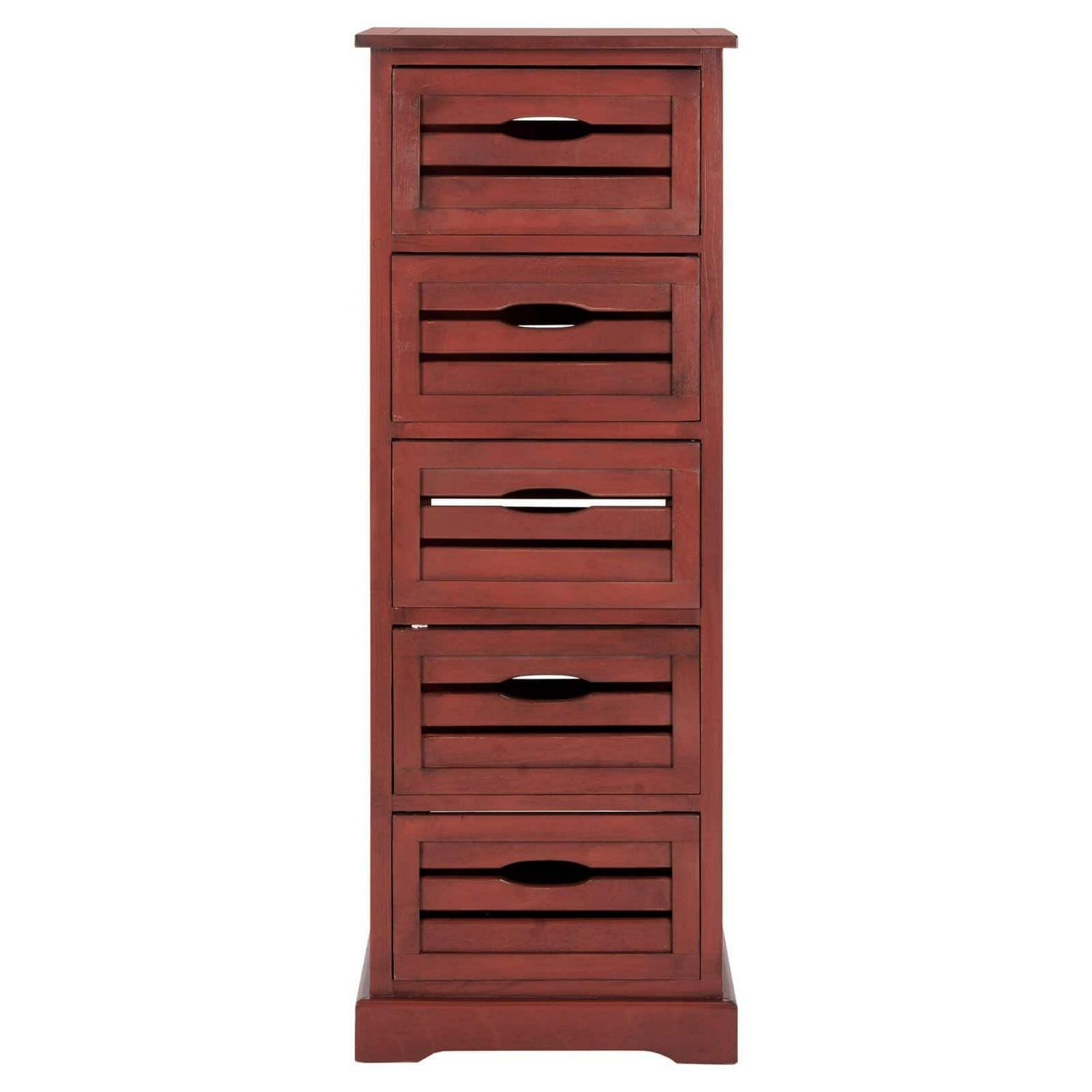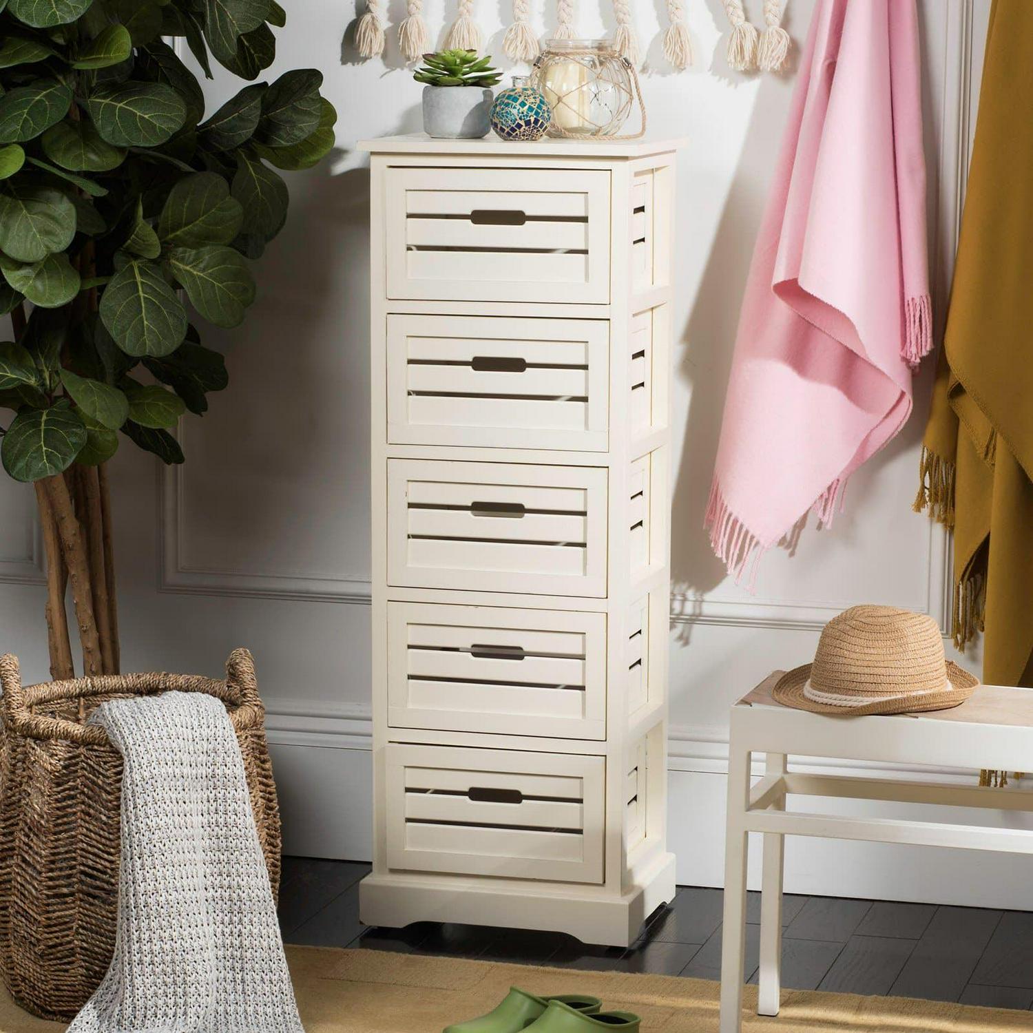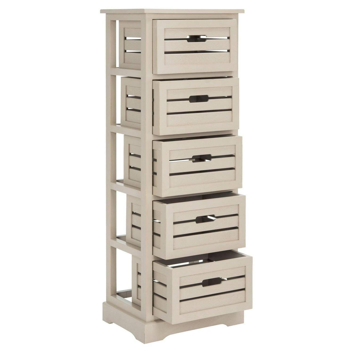 SAFAVIEH Sarina 5-Drawer Cabinet Vintage Grey The classic lingerie chest is treated to a coastal makeover with the Sarina Cabinet. Crafted of pine in a distressed cream finish, the British Colonial frame is updated with open handles on its five slatted drawers inspired by old fashioned fruit crates.
