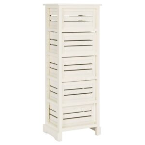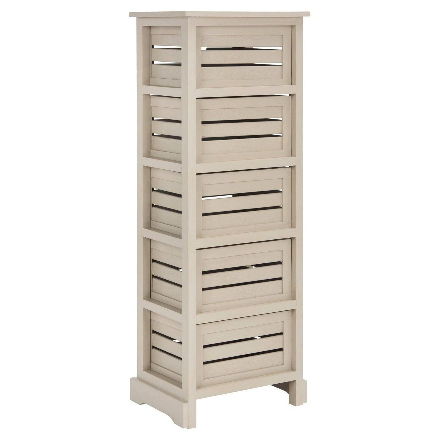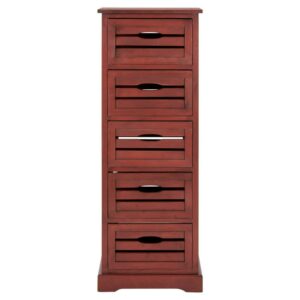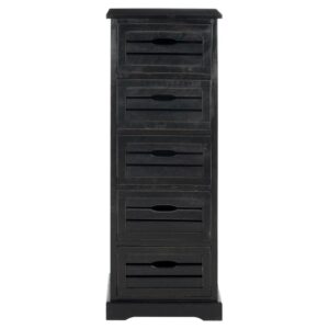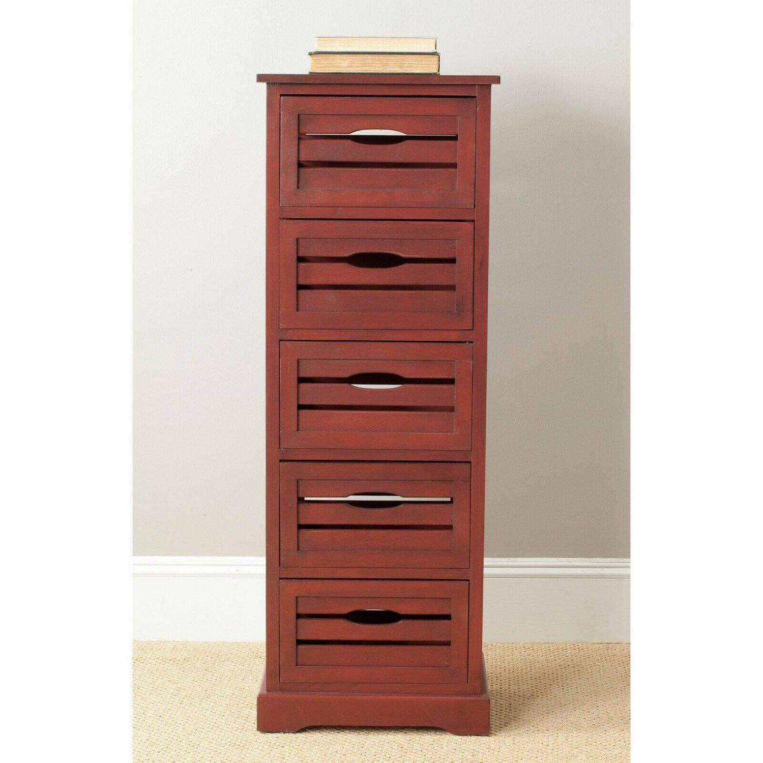 SAFAVIEH Sarina 5-Drawer Cabinet Vintage Grey The classic lingerie chest is treated to a coastal makeover with the Sarina Cabinet. Crafted of pine in a distressed cream finish, the British Colonial frame is updated with open handles on its five slatted drawers inspired by old fashioned fruit crates.