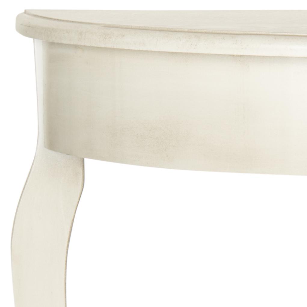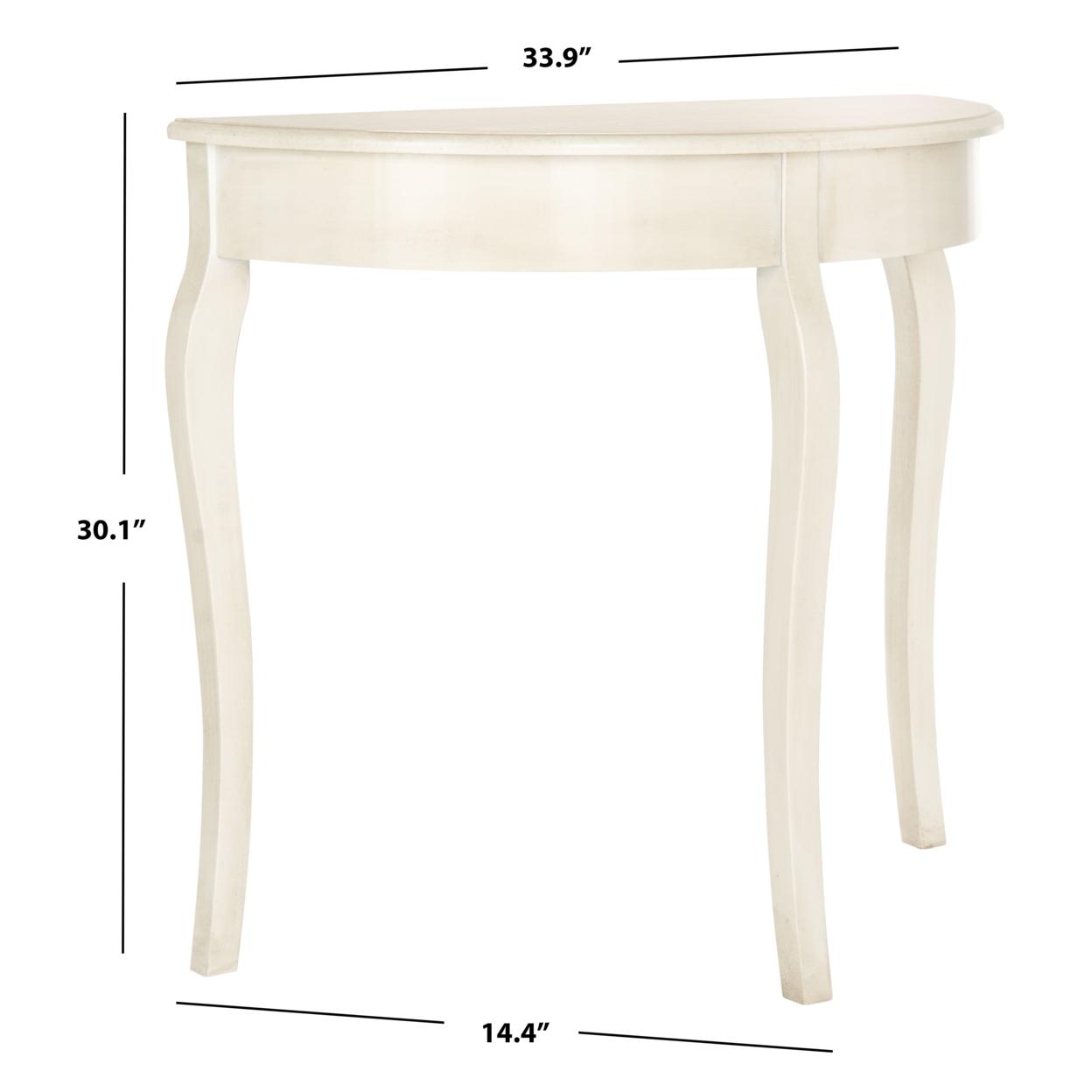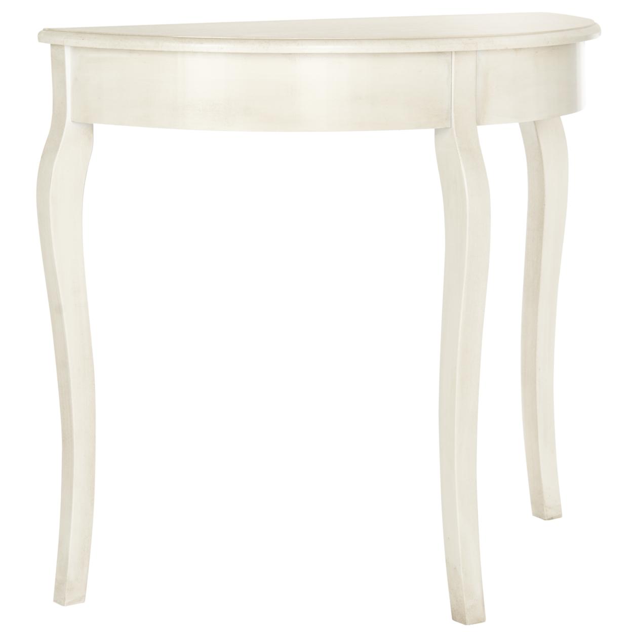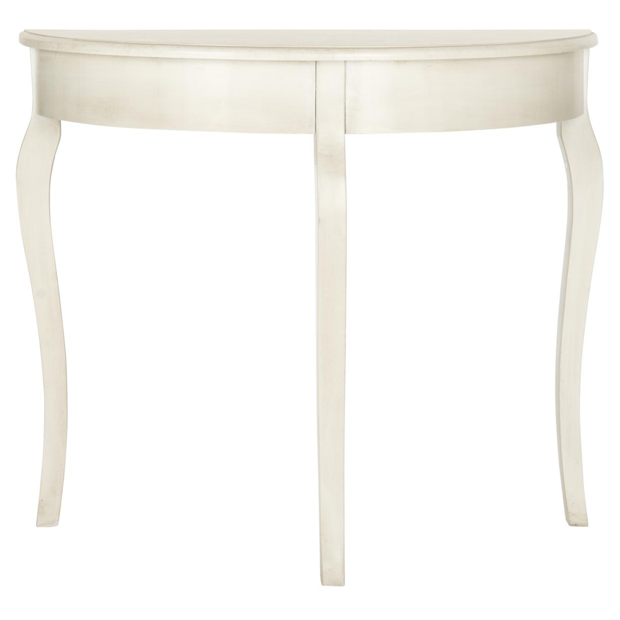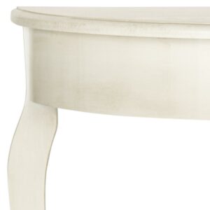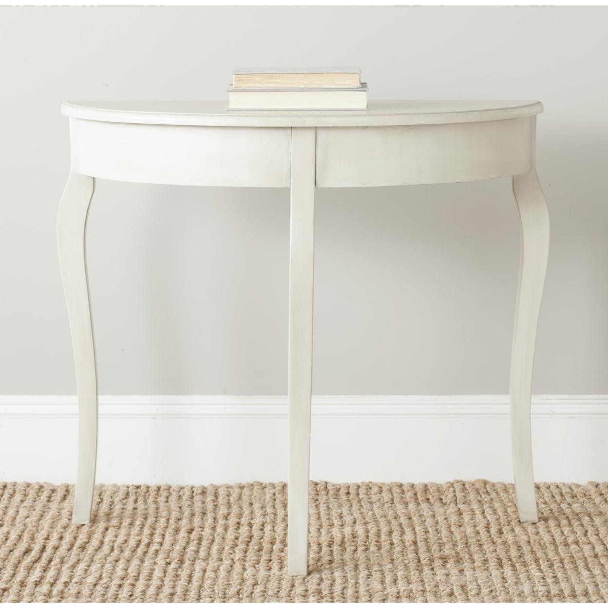 SAFAVIEH Sema Console Table White Washed An elegant silhouette with updated cabriole legs ensures that the whitewashed Sema Console Table complements any interior. Crafted of elm wood, this demilune Console Table enhances the living room or hall with French farmhouse charm. Accent Sema with a pair of lamps or vase filled with flowers for additional appeal.