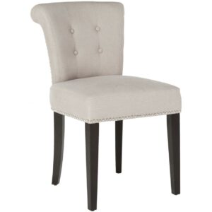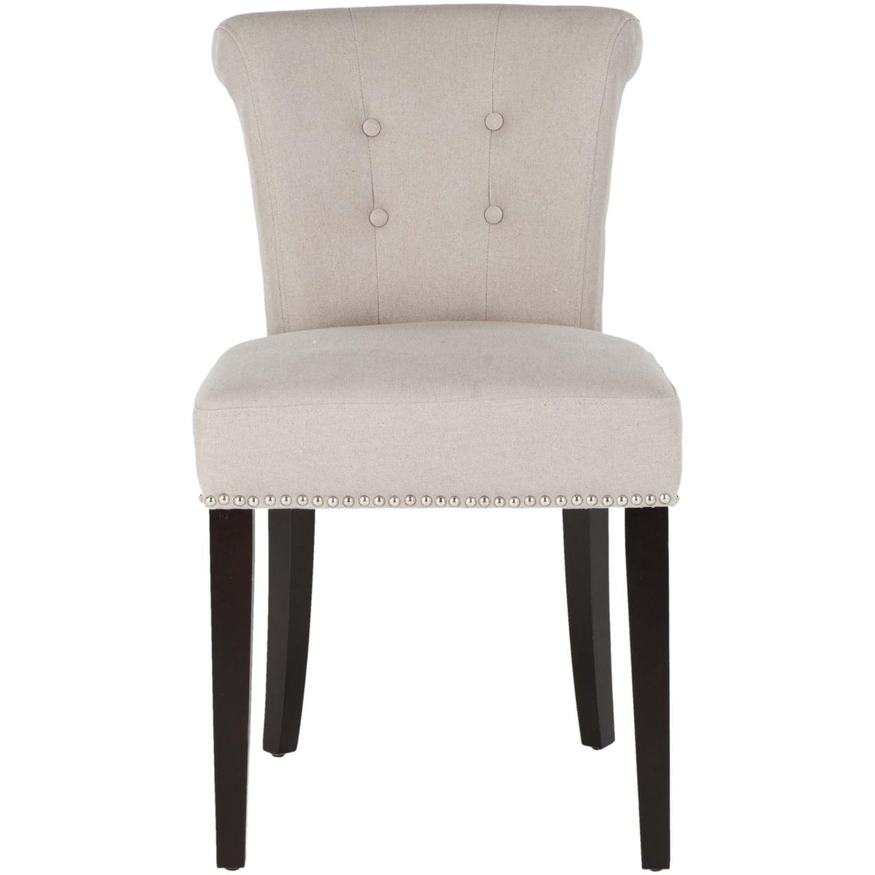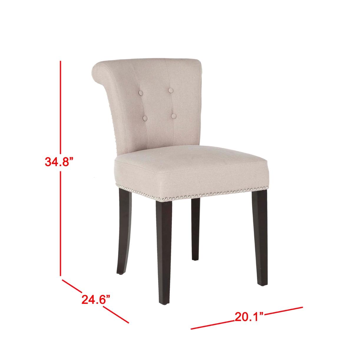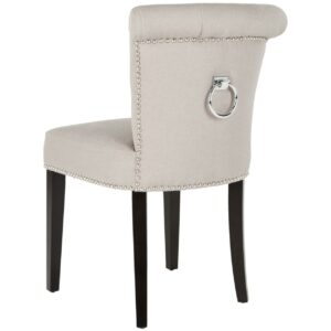 SAFAVIEH Sinclair 21”H Ring Chair Set of 2 Silver Nail Head Taupe The bent back of the Sinclaire dining chair, in taupe fabric with espresso finish on the legs, gets a classic dressed up punch thanks to exposed nail head and cleaver metal ring on its back. Button tufts on the front of the tapered backrest and generous cushions make it a handsome seat.