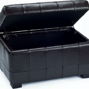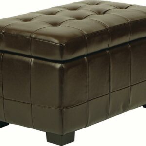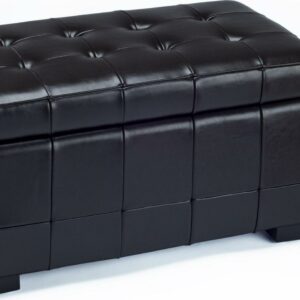 A great space saver in the family room, living room or bedroom, the small Manhattan storage bench is perfect for keeping linens, clothing, even toys and reading material out of sight. What s more, this beautiful piece is covered in brown bicast leather that s quilted with button tufting on top. A perfect perch for extra seating, Manhattan stands on chic black beech wood legs a sturdy dual-purpose must-have for busy families short on space.- Contemporary design adds a chic look to your home