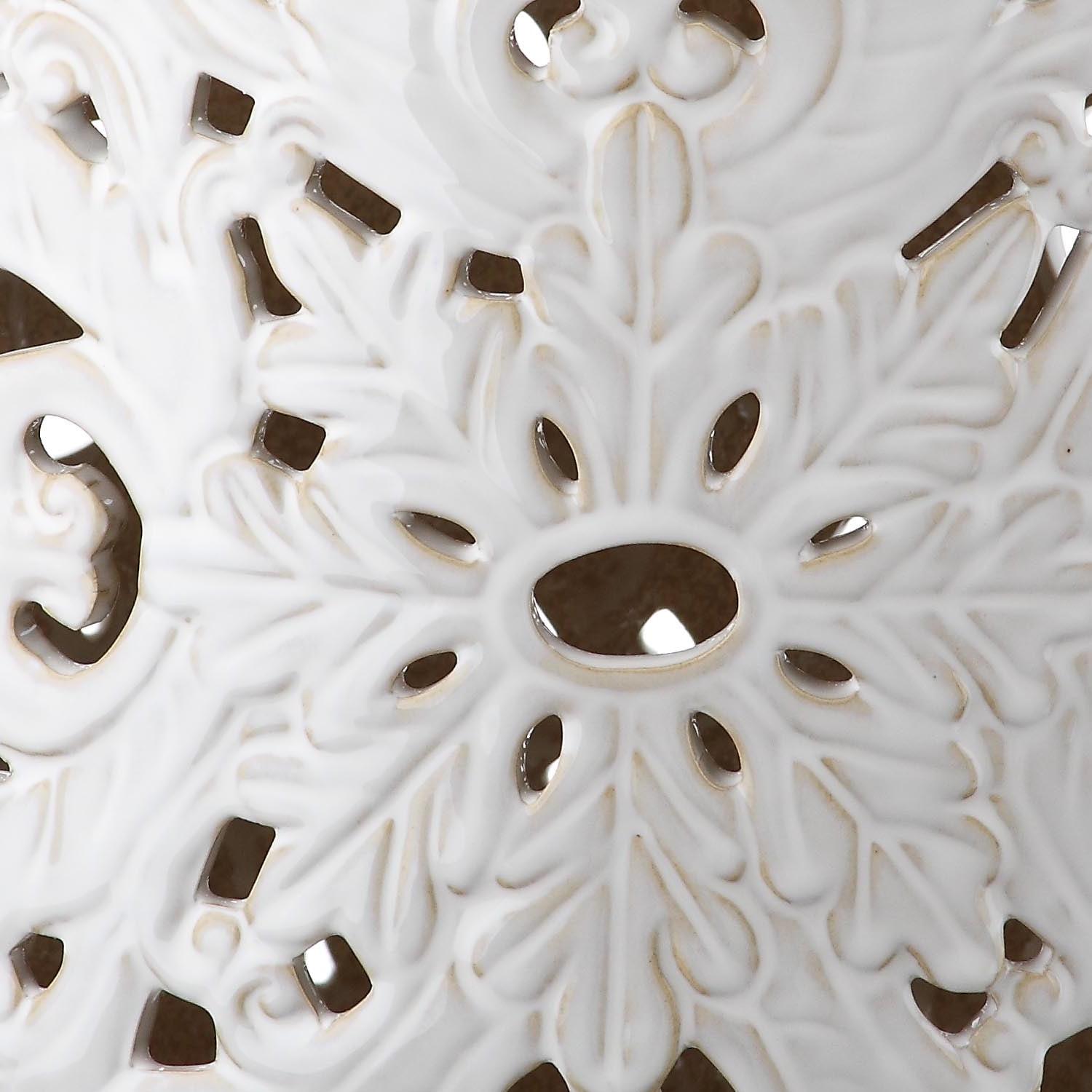 Exquisitely crafted, the Flora light blue ceramic garden stool features a pierced leaf medallion motif of Asian inspiration. Replete with lucky coin top detail and ceramic nailheads, Flora is a timeless beauty.