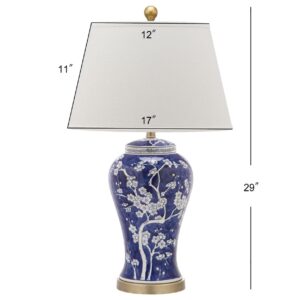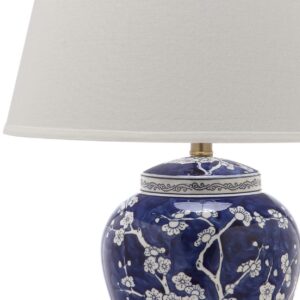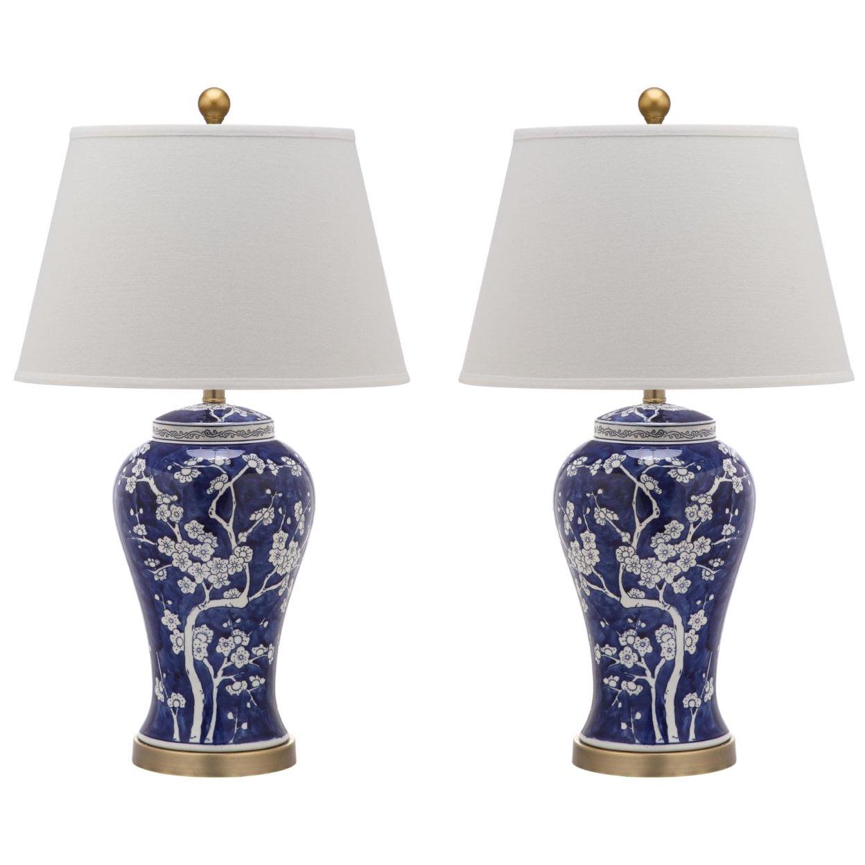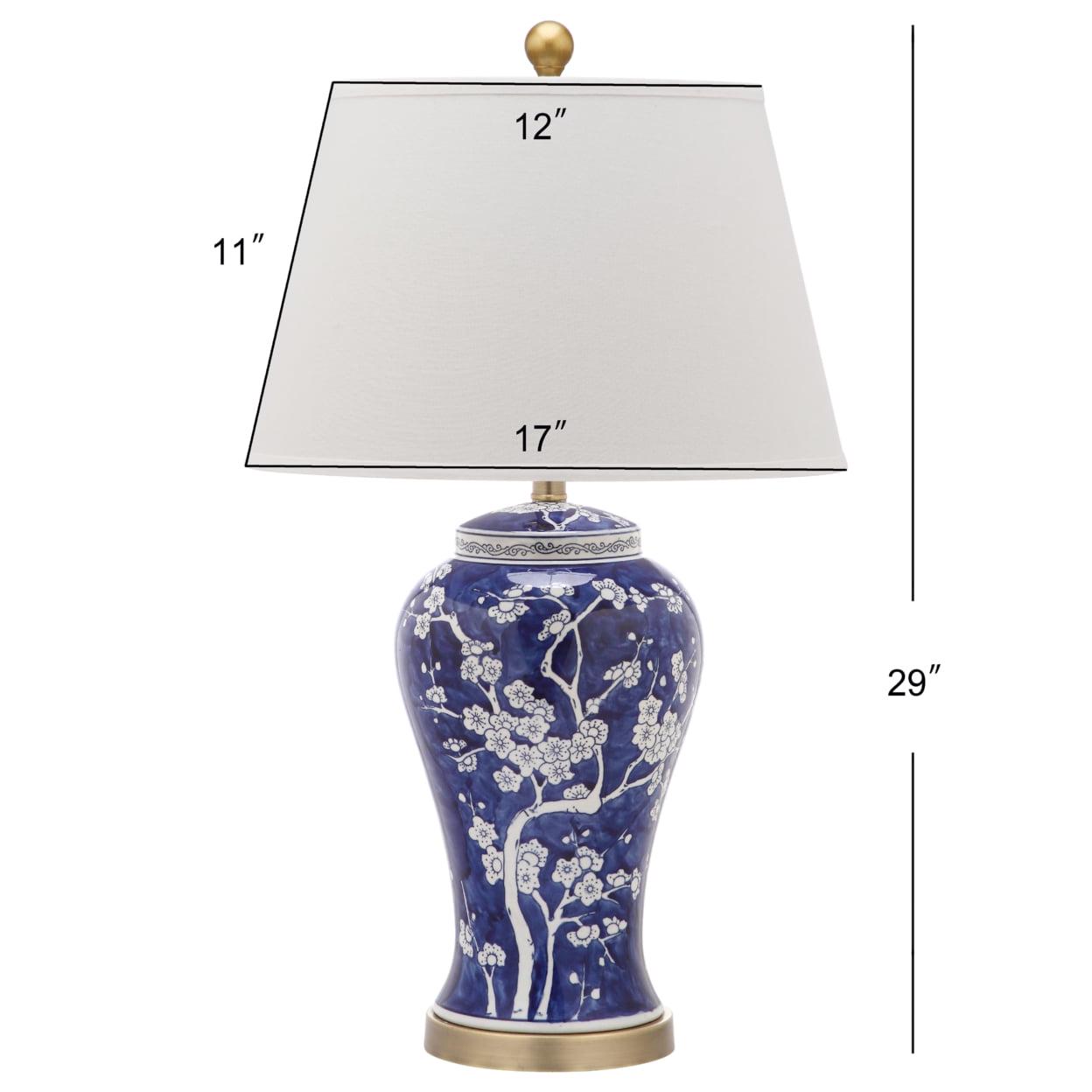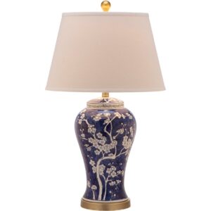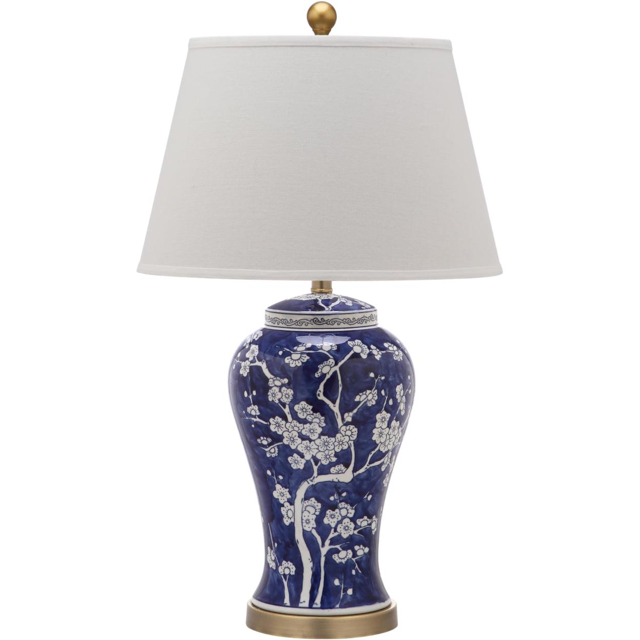 Wandering branches bursting with white flower buds adorn the classically styled navy blue Spring Blossom table lamp. True to its roots in Asian design, this elegant urn shaped lamp is crafted of ceramic with white linen shade, gilded finial and accents.