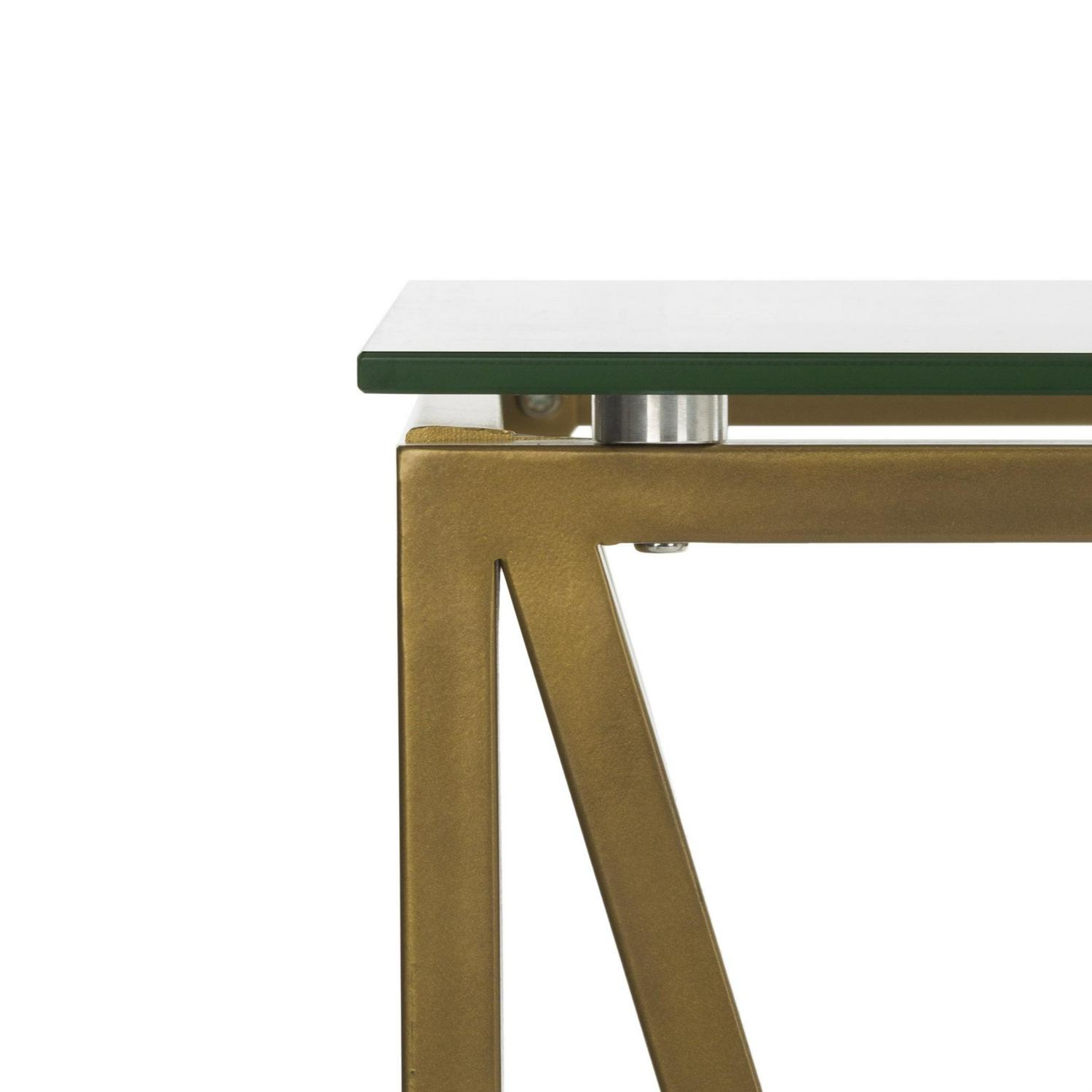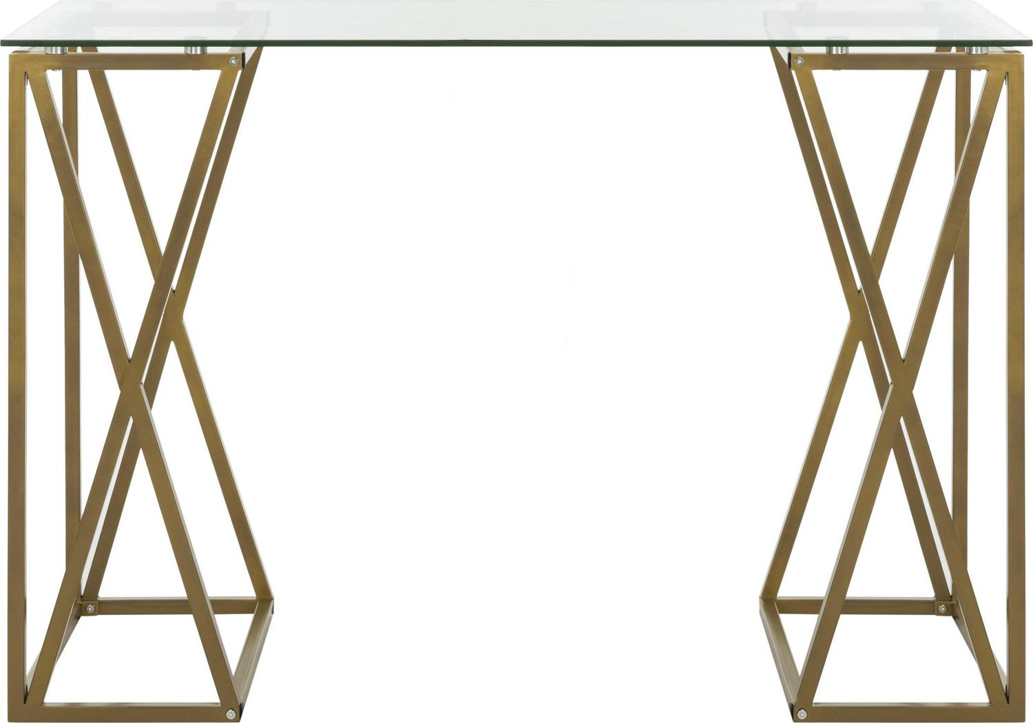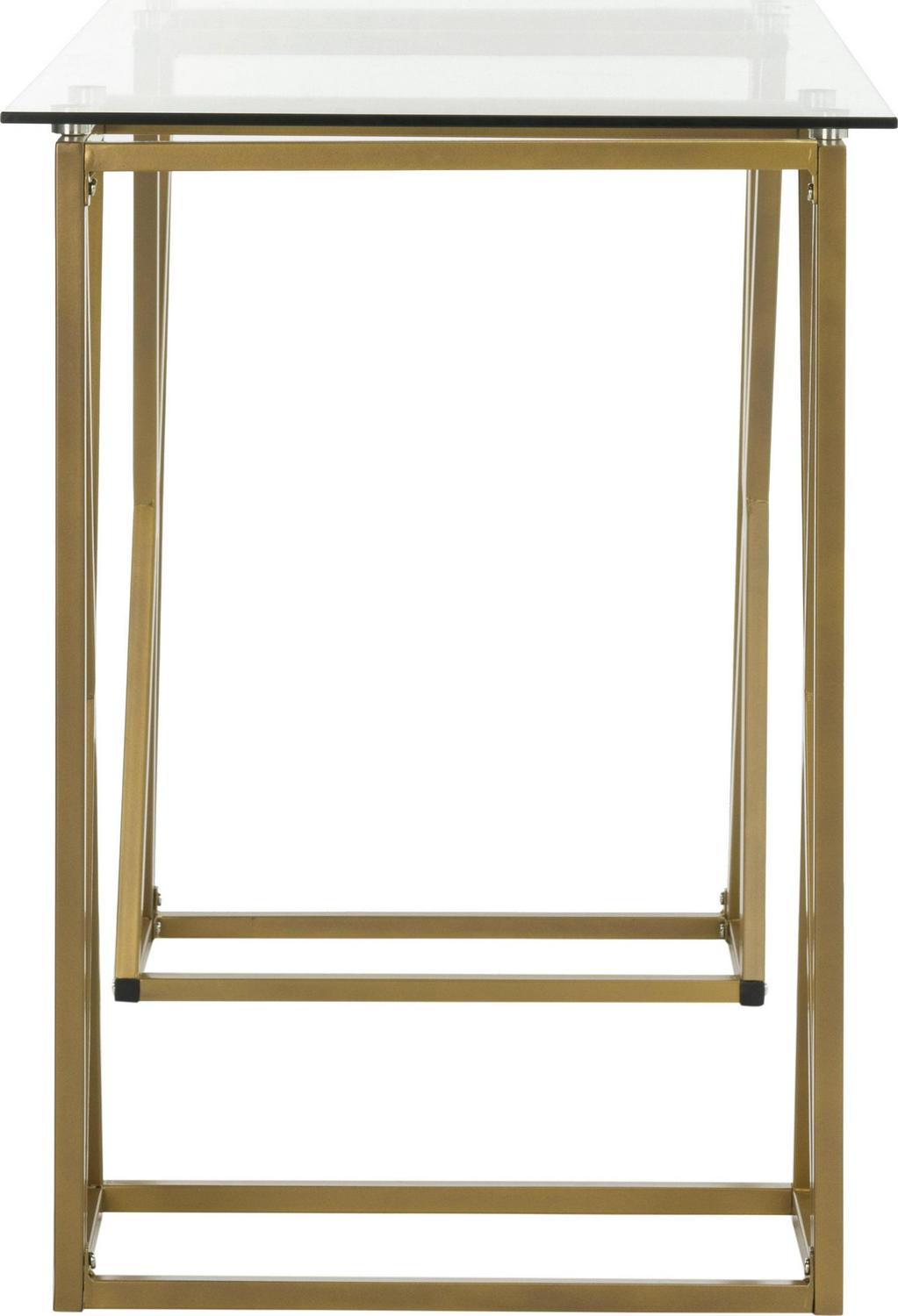 SAFAVIEH Theresa Glass Top Desk Clear / Gold Designed for the minimalist lifestyle, this glass top desk brings sleek modern style to the home office. Topped with a smooth transparent glass surface, its dynamic sculptural metal frame features a sophisticated gold finish that adds instant glamour.