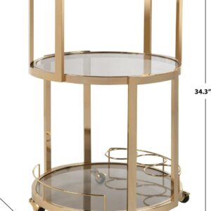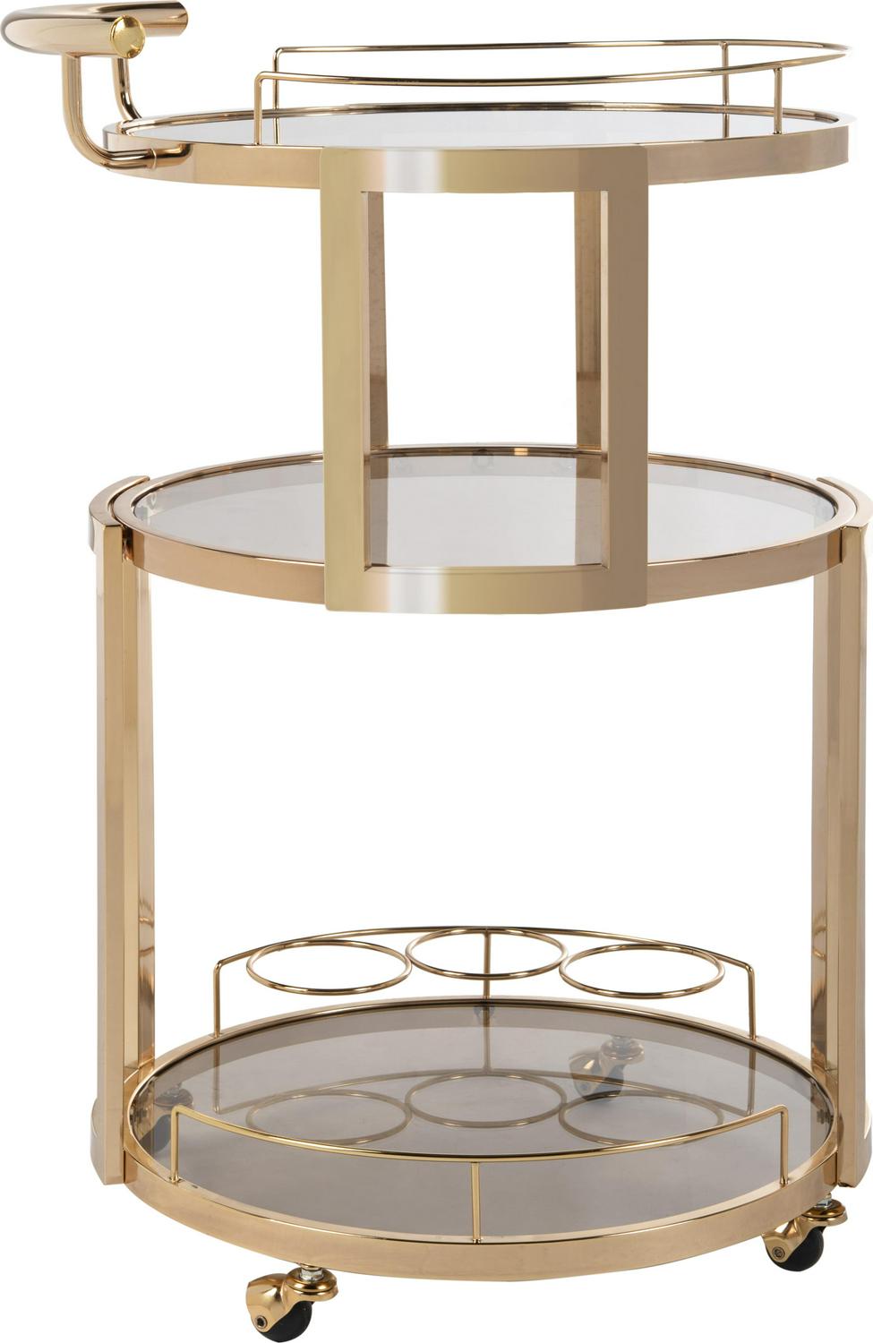 Add instant glamour to any room with this deluxe 3-tier round bar cart and wine rack. Its contemporary design features a shimmering gold finish and tinted glass for depth and drama. Designed for ample storage, it s the perfect way to start any soiree.