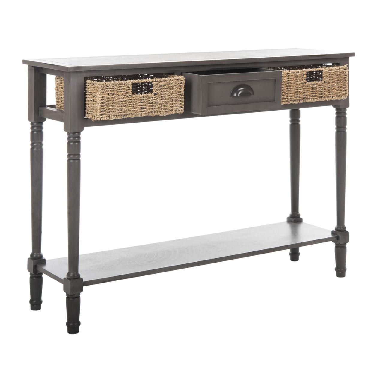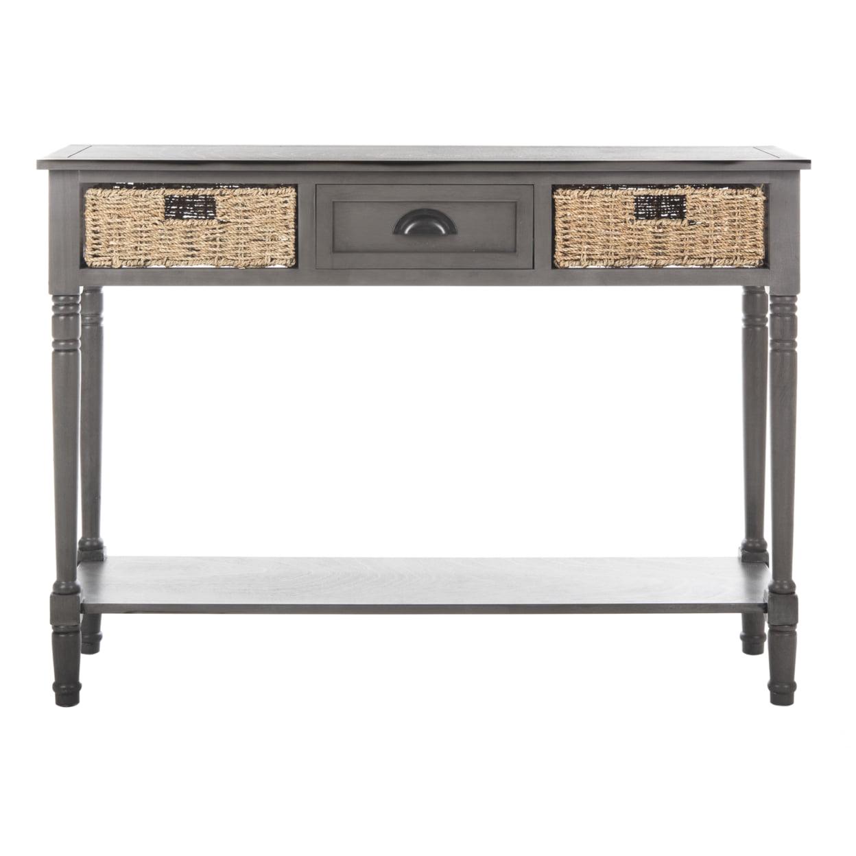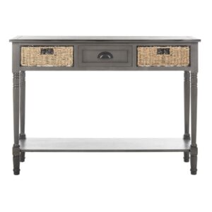 SAFAVIEH Winifred Wicker Console Table With Storage Grey Country chic styling makes the Winfred Console Table a welcoming statement piece for any entry hall. Grey finished pine beautifully highlights two woven rattan pull out baskets flanking a wooden drawer with half moon pull. A lower shelf provides ample storage and display space.