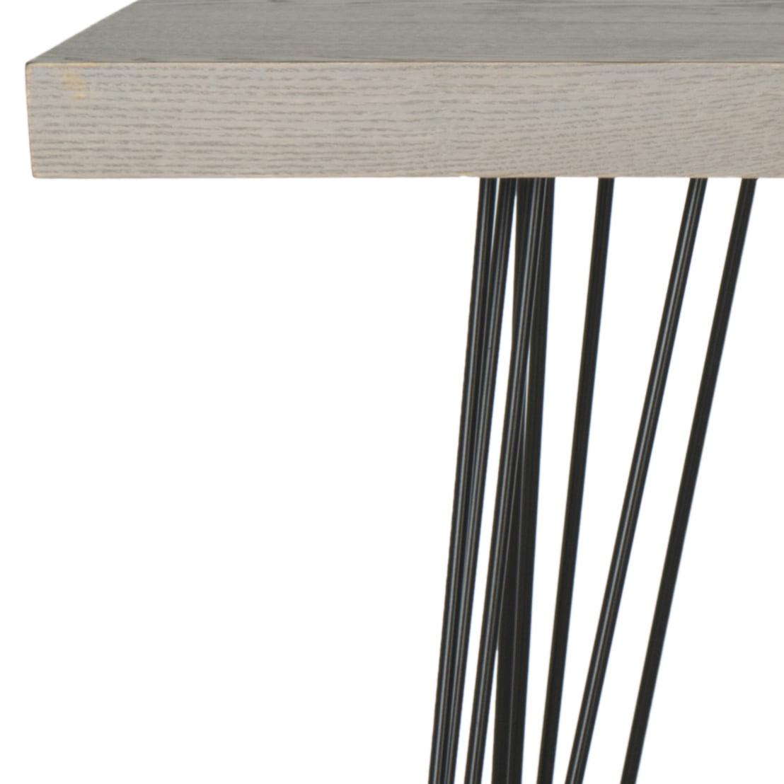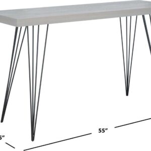 SAFAVIEH Wolcott Retro Mid-Century Lacquer Console Table Grey / Black Sleek and contemporary, the Wolcott Console Table makes for a grand entrance in the front hall and a dramatic statement in the living room. Its rustic chic wood top in a grey wood grained finish appears to float on a base of hairpin legs in black iron.