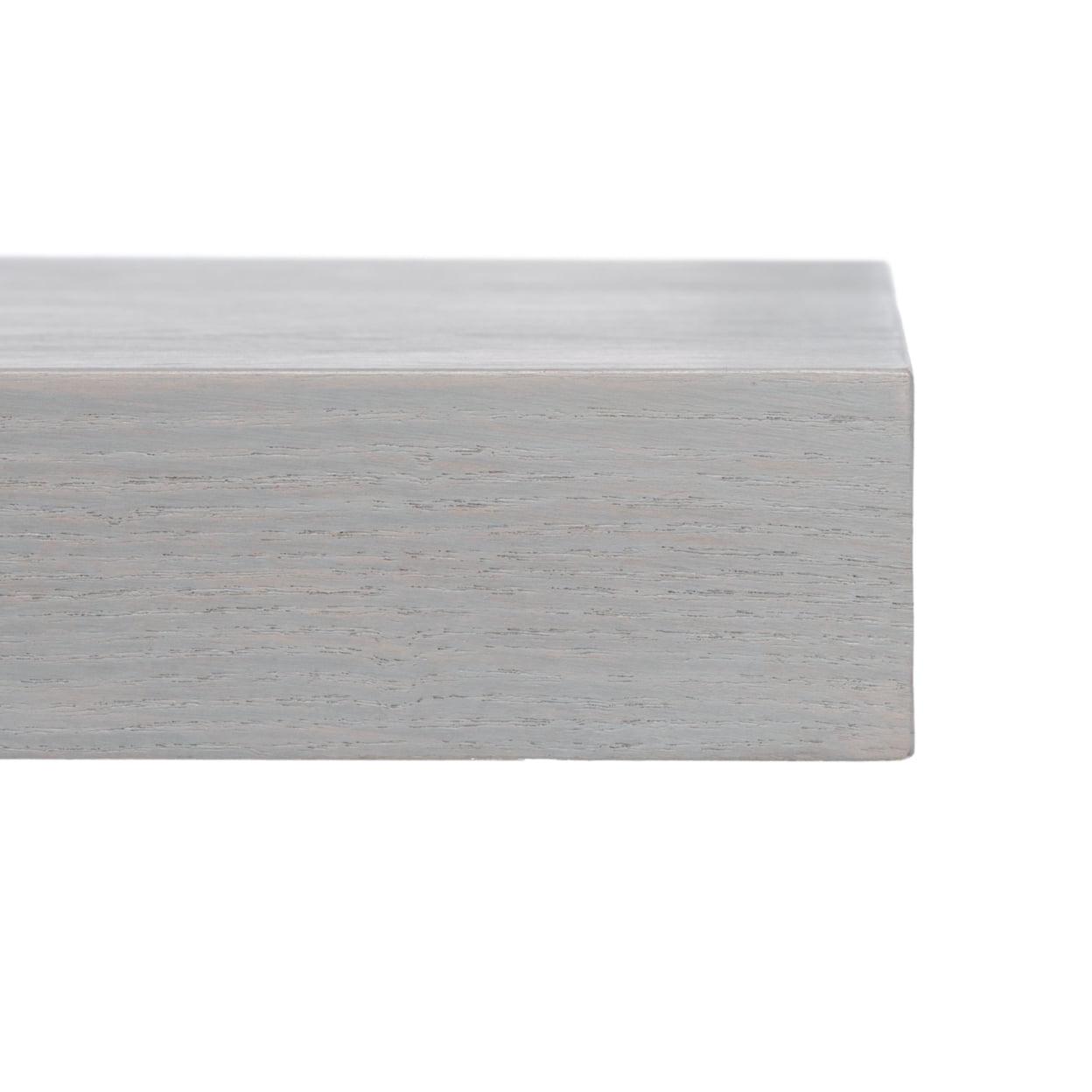 – Its rustic-chic top of MDF with a grey wood-grained finish appears to float on a base of hairpin-thin legs in black iron.
