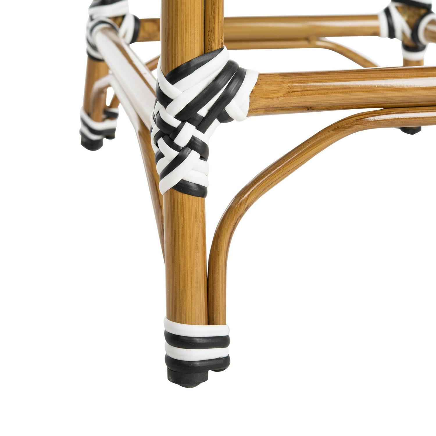 The beloved European bistro chair assumes a coastal update in this black and white counter stool. The cheerfully woven PE wicker seat and back extends to the stylish wrap detailing on a classically styled brown frame.