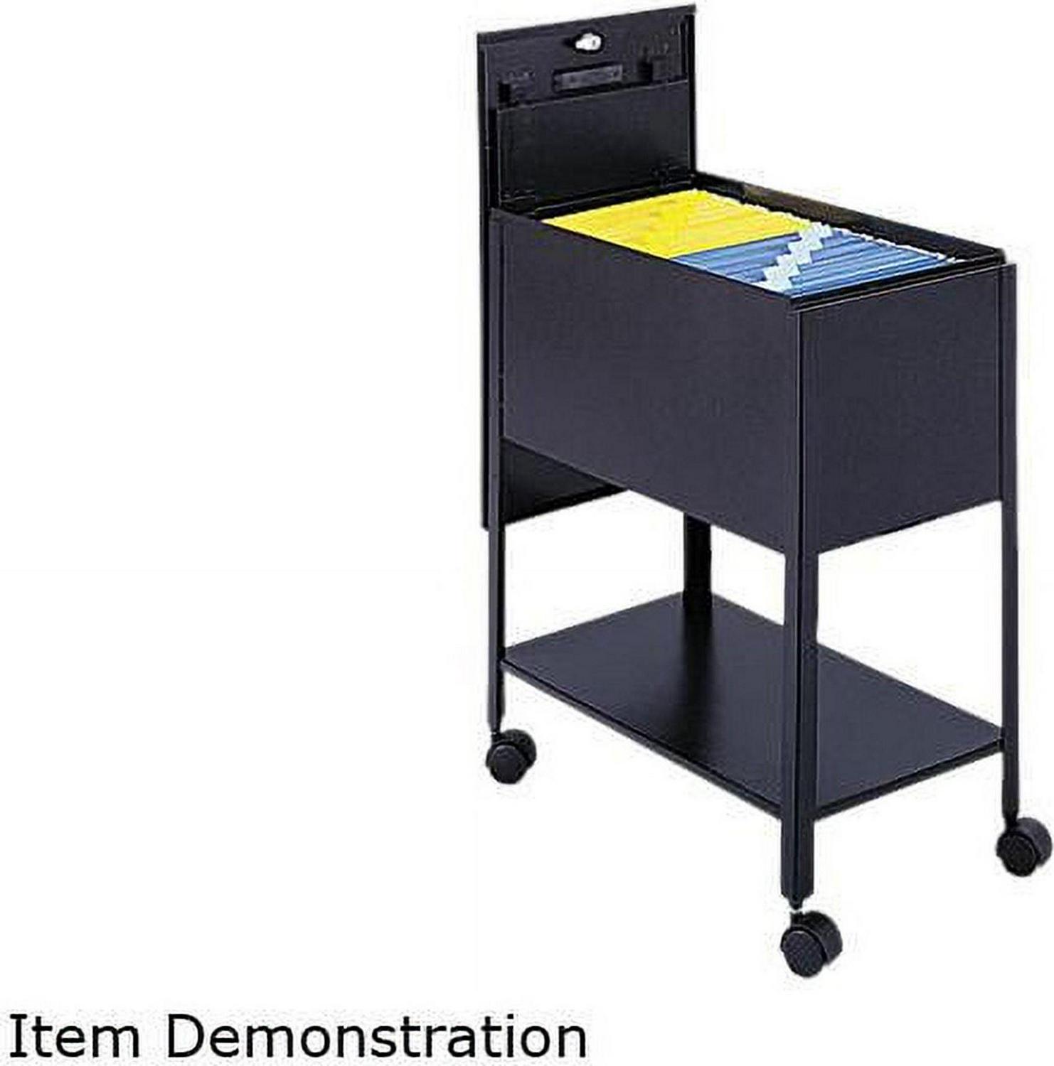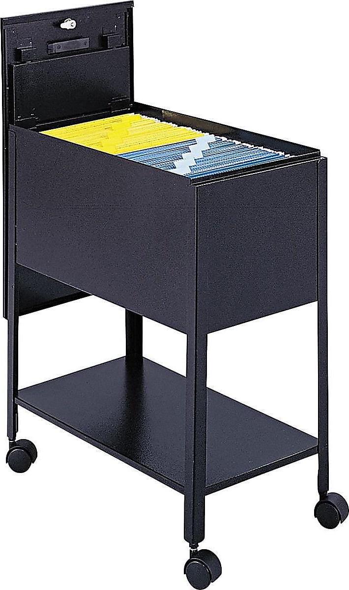 Space-efficient extra-deep design holds more files. Sturdy steel construction with a textured finish. Locking hinged cover keeps dust out while securing files. Four swivel casters (two locking) for easy mobility. Handy bottom storage shelf.