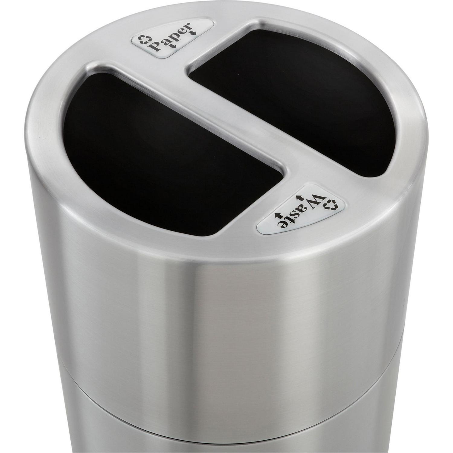 Keep your recyclables separated with this two-bin system. Easily customizable and includes recycling decals: plastic, cans, paper and waste. Removable lid provides set-up versatility. Aluminum body with two 15 gallon, separate plastic liners. Satin finish makes it perfect for use across the workspace.