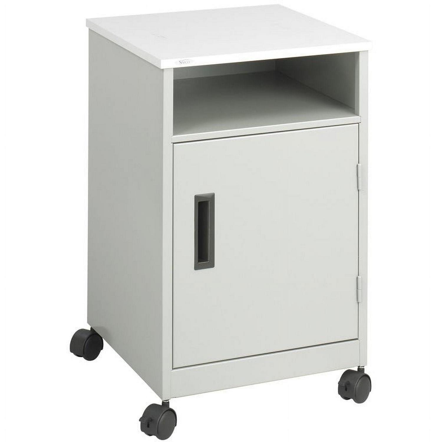 This compact mobile office machine/supply stand fits neatly into small areas. Complete with steel cabinetry and a matching scratch-resistant laminate top. Piano-hinge single door opens to a convenient storage area. Use the open area under the top for frequently accessed materials. Mobile on four swivel casters (two lock).