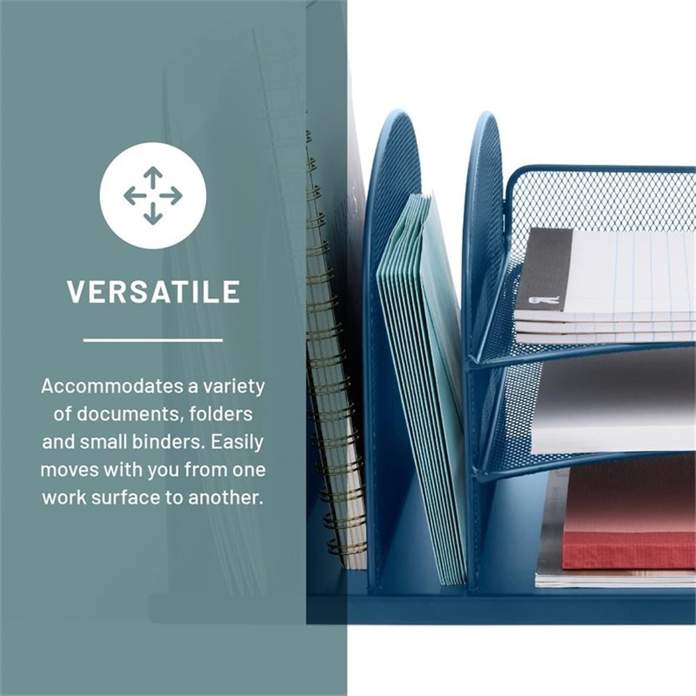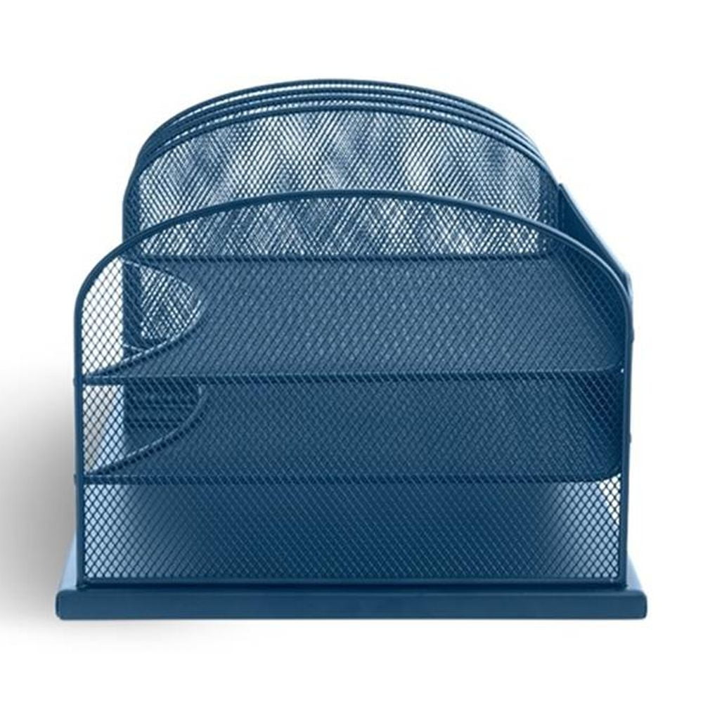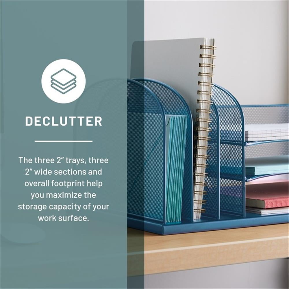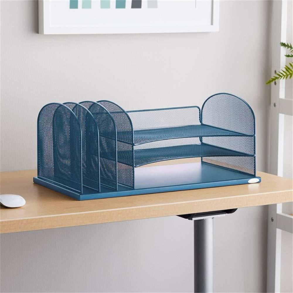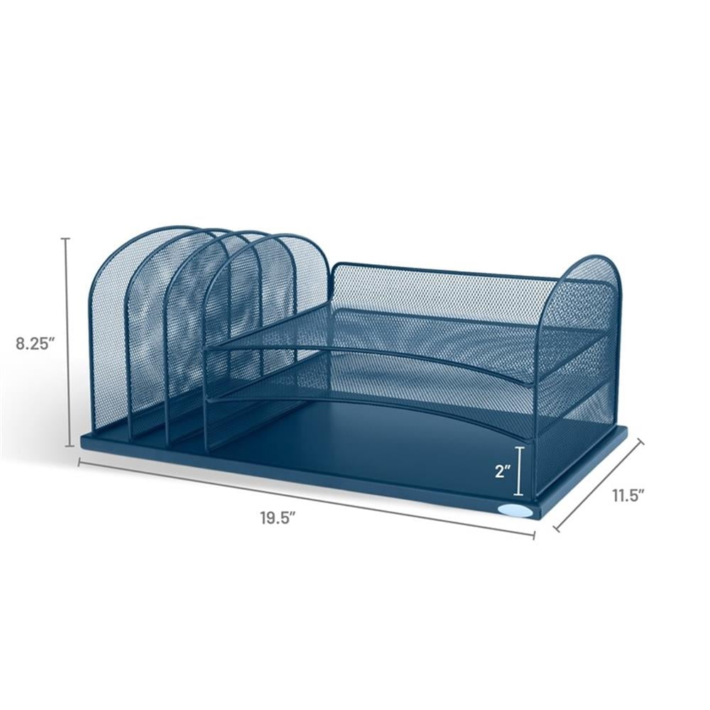 The Onyx wire mesh desktop organizer features 3 horizontal letter-sized trays and three 2″ wide, upright file sections on the left. The durable steel mesh design in office supply organization and file storage. Features: Finish: Blue Three, 2″ wide, upright file sections on the left Material: Pine Wood Wire mesh desktop organizers Office supplies organization and file storage Steel mesh design Three letter-sized trays Specifications: Product Dimensions: 8.25″ H x 19.5″ W x 11.5″ D Product Weight: 7 lbs