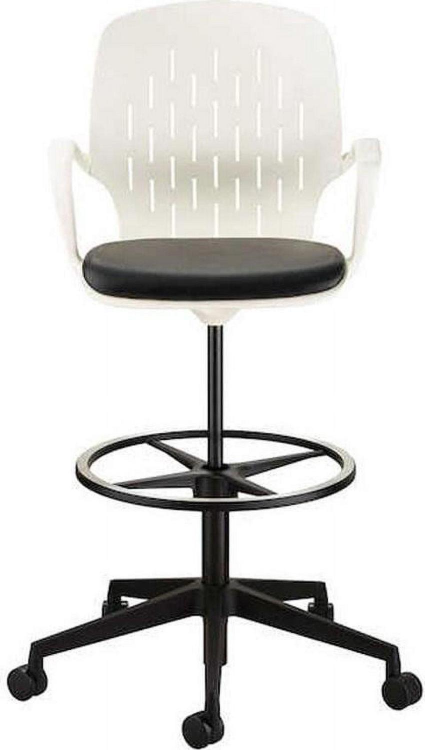 Minimalistic shell chair design offers intuitive adjustments and a sleek design that fits into any space. Features a contoured back for lumbar support. Seat naturally flexes to fit the user comfortably. Upholstered padding on the seat and arms for comfort. Seat height adjustable from 16-20″ to support a wide range of user heights. Holes in the back provide breathability. 360-degree swivel capabilities. Sturdy 5-star base on casters for easy mobility. Vinyl upholstery for easy cleaning. Capacity – Overall: 275 lbs.