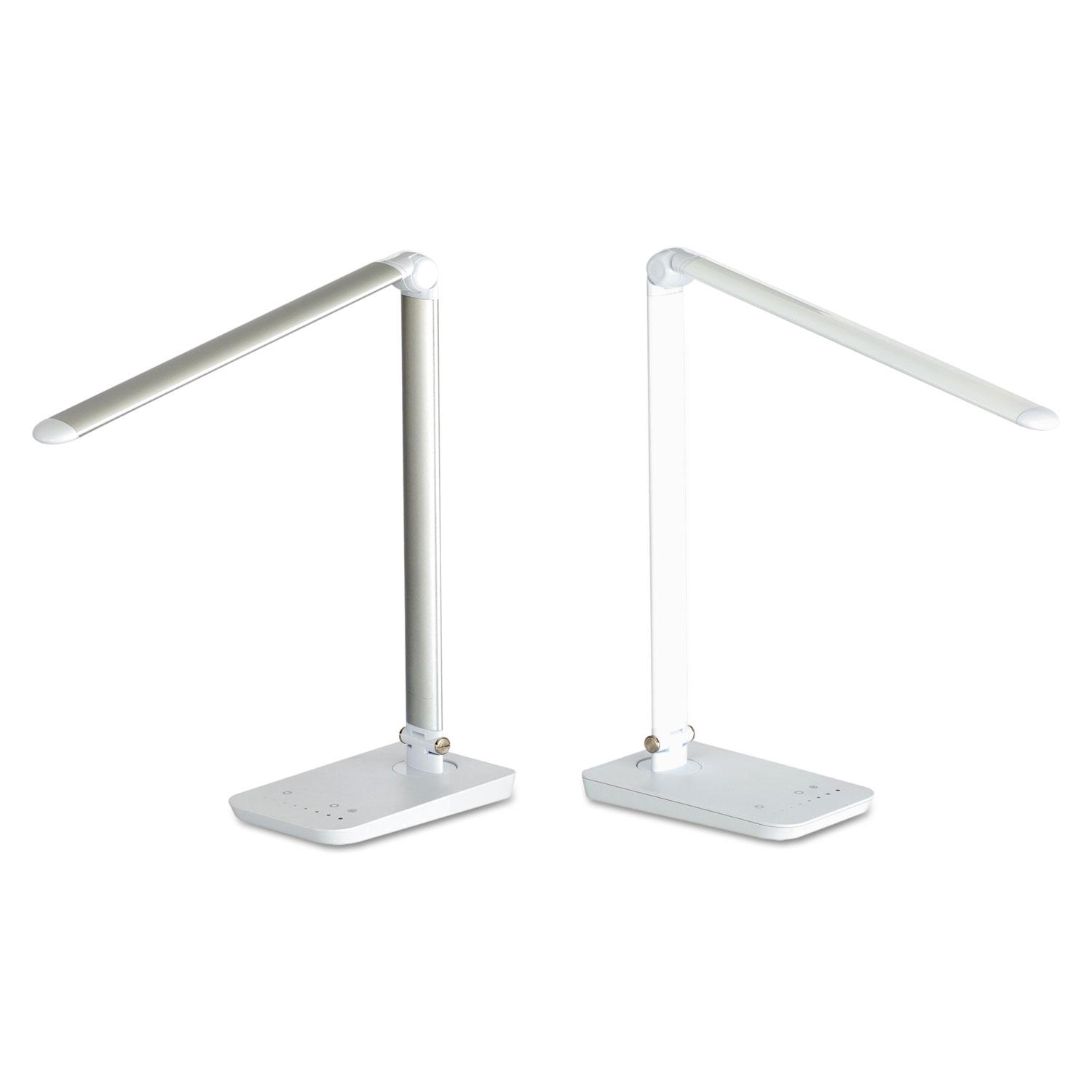 Style meets function in Vamp LED Lighting. This ingenious, flicker-free, energy-saving, practical light features a multi-pivot flexible neck, creating just the right light for every work project. Touch-free dimmer switch with memory button will recall your last setting. Eight brightness settings are available with the swipe of a finger. The eight color settings include four warm and four cool. Reduced glare filter makes viewing electronics easier and may help to lessen eyestrain. Going one step further, the lamp also offers a USB port in the back of the base to recharge digital devices. The 550 lumen lamp is made of ABS plastic and aluminum. It is free of lead, mercury and UV rays with zero pollution. Safco Vamp LED Flexible Light, White