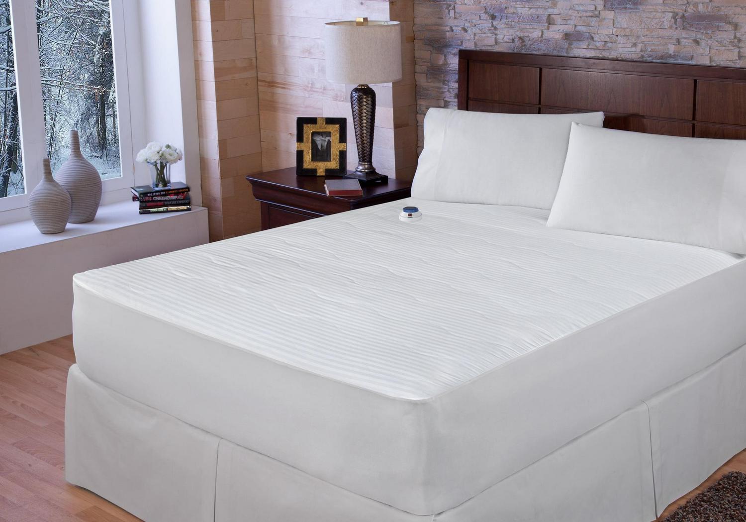 For those who prefer an added layer of warmth while sleeping the Safe and Warm Low Voltage Dobby Stripe Mattress Pad is the perfect solution. Forget about bulky wires and uneven heating seen in most heated mattress pads. The Safe and Warm Technology features thin wires unlike other warming products on the market. The barely there, 5 times finer wires are virtually undetectable. Safe and Warm low voltage technology converts 120 volt AC current to less than 25 volts of DC current. That means this unique mattress pad is safe in the presence of moisture, will not harm pets, and emits no EMFs. Our patented low voltage technology is the only electric mattress pad technology that is certified as non-hazardous. The easy to use controller allows you to find the heat setting that is right for you, with 10 settings to choose from. Queen, King, and California King sizes provide dual warming zones each with its own controller, so everyone can sleep comfortably at their ideal temperature. Smoothing soft and comfortable, evenly heated throughout and created with the safest technology means you will be sleeping in comfort with the world’s safest electric mattress pad”.