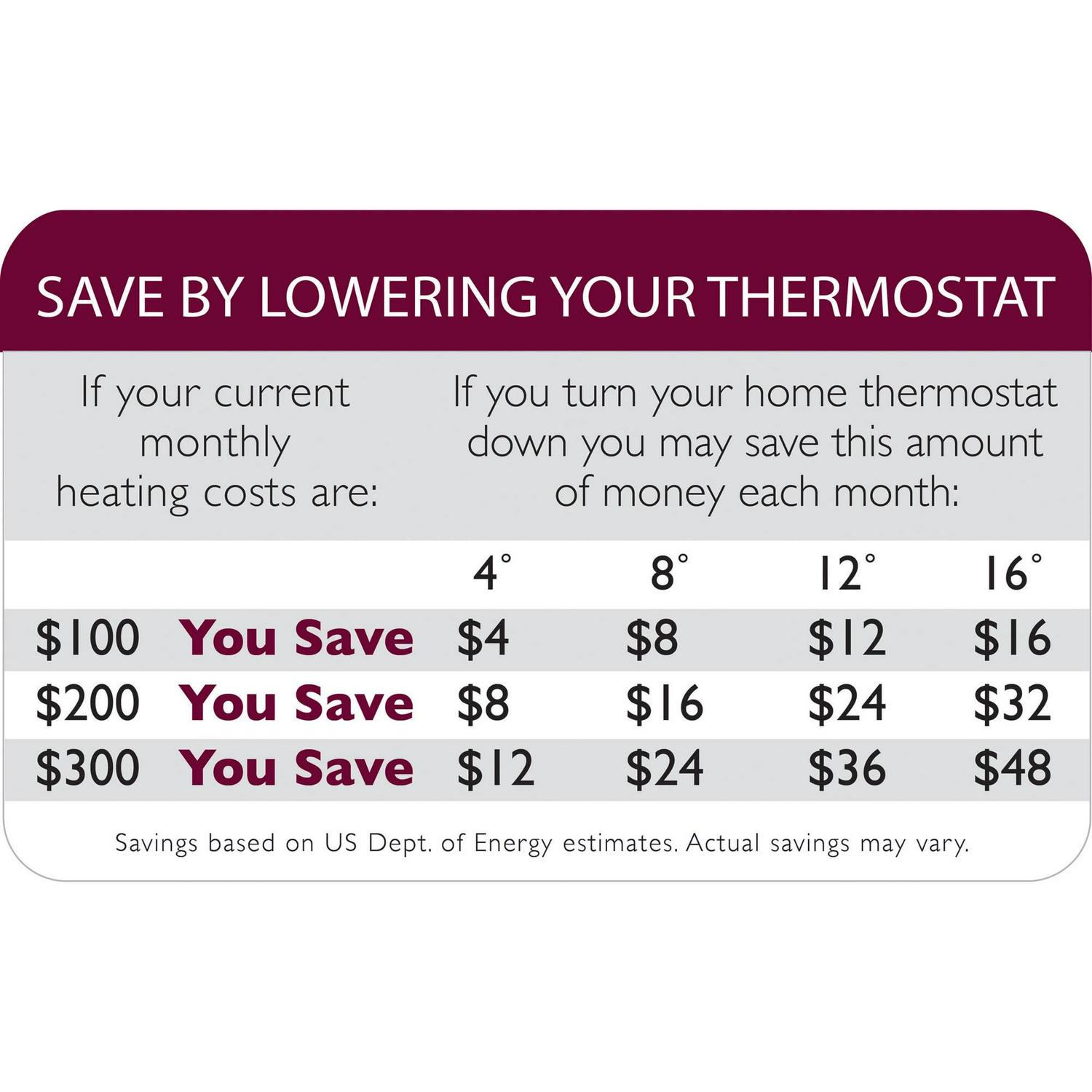– Turning your thermostat down by 10-15 degrees for a minimum of 8 hours is an effective way to lower energy costs by 5-15%.