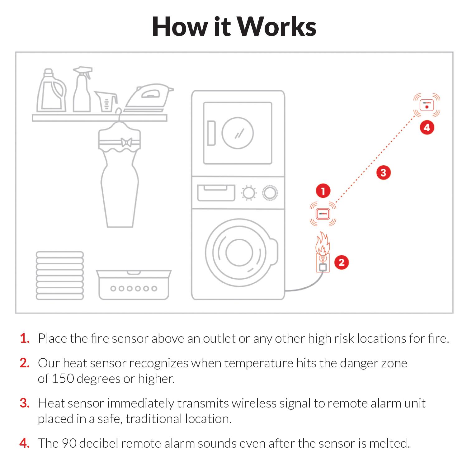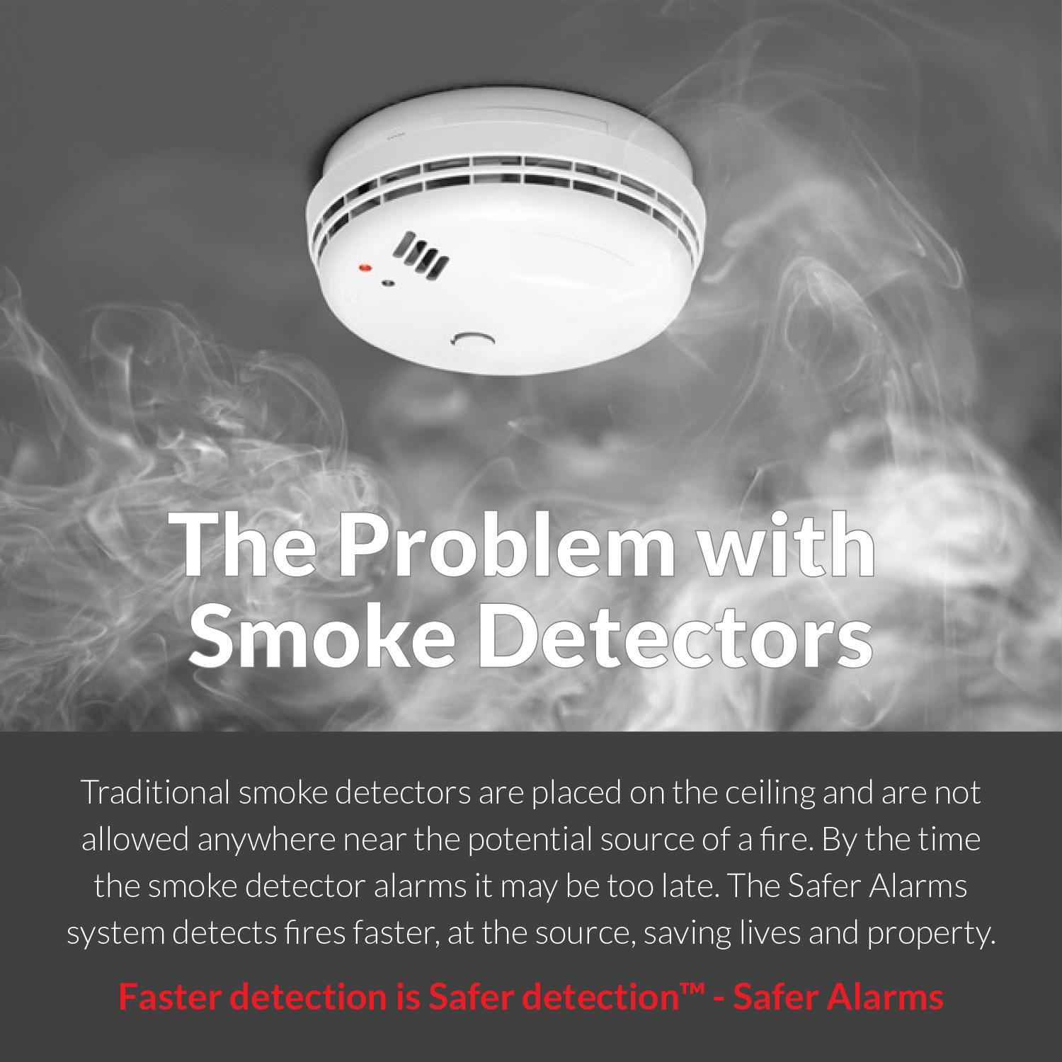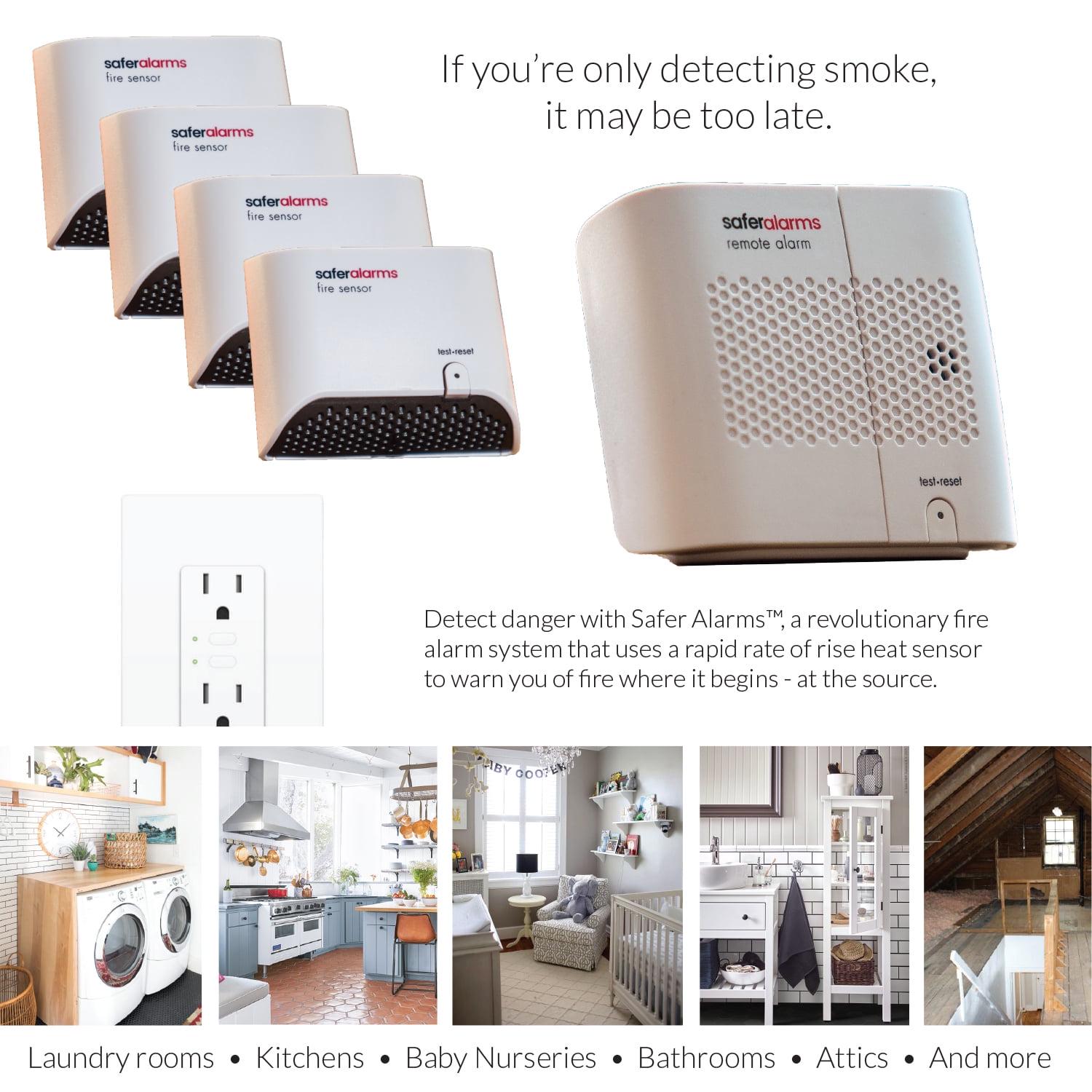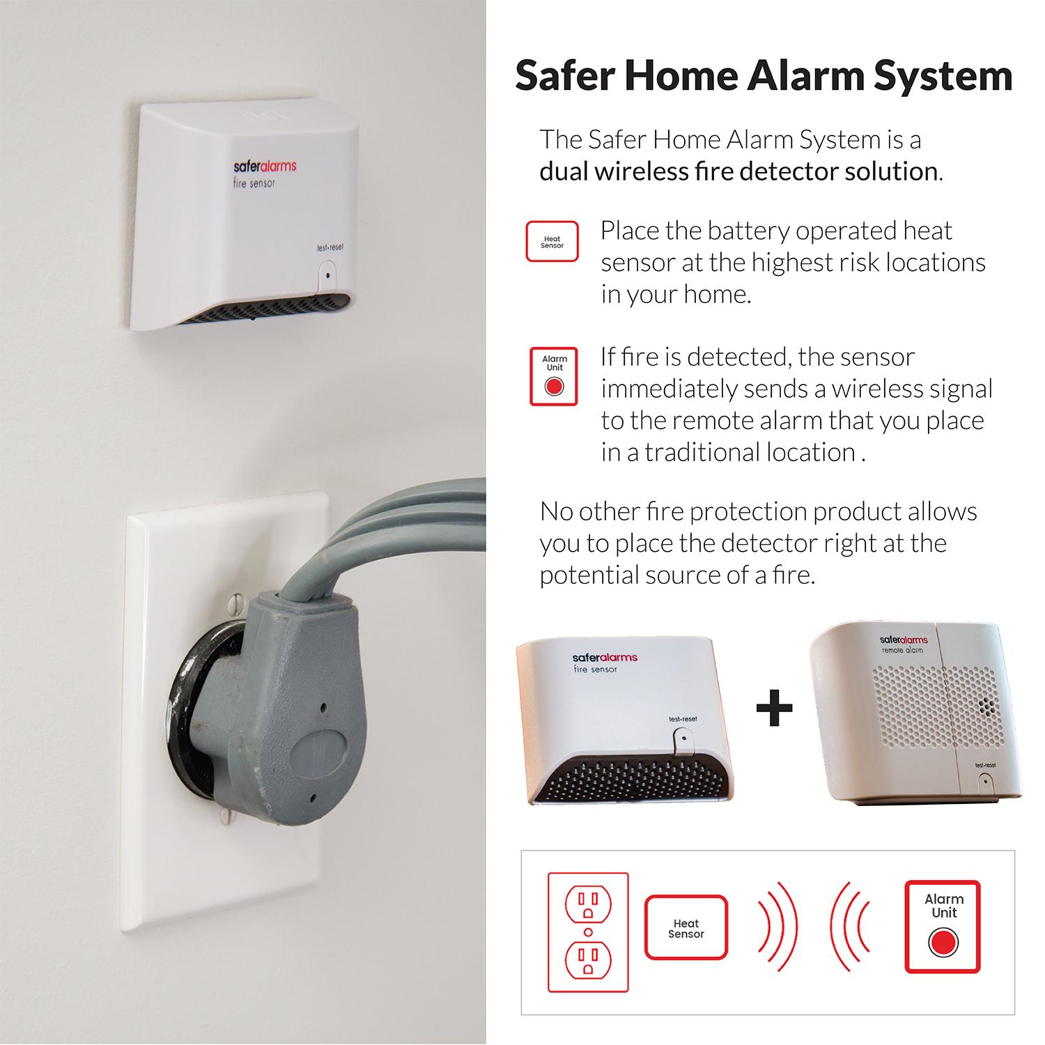 Our wireless fire detector system s intelligent sensor technology detects fire faster because you can place the sensor directly at the source where most home fires begin, at the outlets, in the kitchen, bathrooms, laundry rooms and baby nurseries. No other fire or smoke detector on the market can be placed at the outlet because they would melt in a fire and be rendered useless. Only Safer Alarms patent pending technology allows the detector to be placed this close to the source of a fire. The wireless remote alarm will continue to sound even after the sensor is destroyed in a fire. Many fires begin before you even know it behind the walls in your home. Smoke builds up behind the wall and by the time you can see fire it s too late. Safer Alarms sensors detect the rise of heat even behind the walls and will immediately signal the remote alarm allowing you critical extra minutes to get out of the house. This is the only product on the market that can do this. Simply place the sensor in these high-risk locations and the remote alarm near the bedrooms of your home. Even when the sensor melts in the fire the remote alarm will continue to sound, allowing you to get out of the house faster. Our multi-year battery system means no replacing for years.