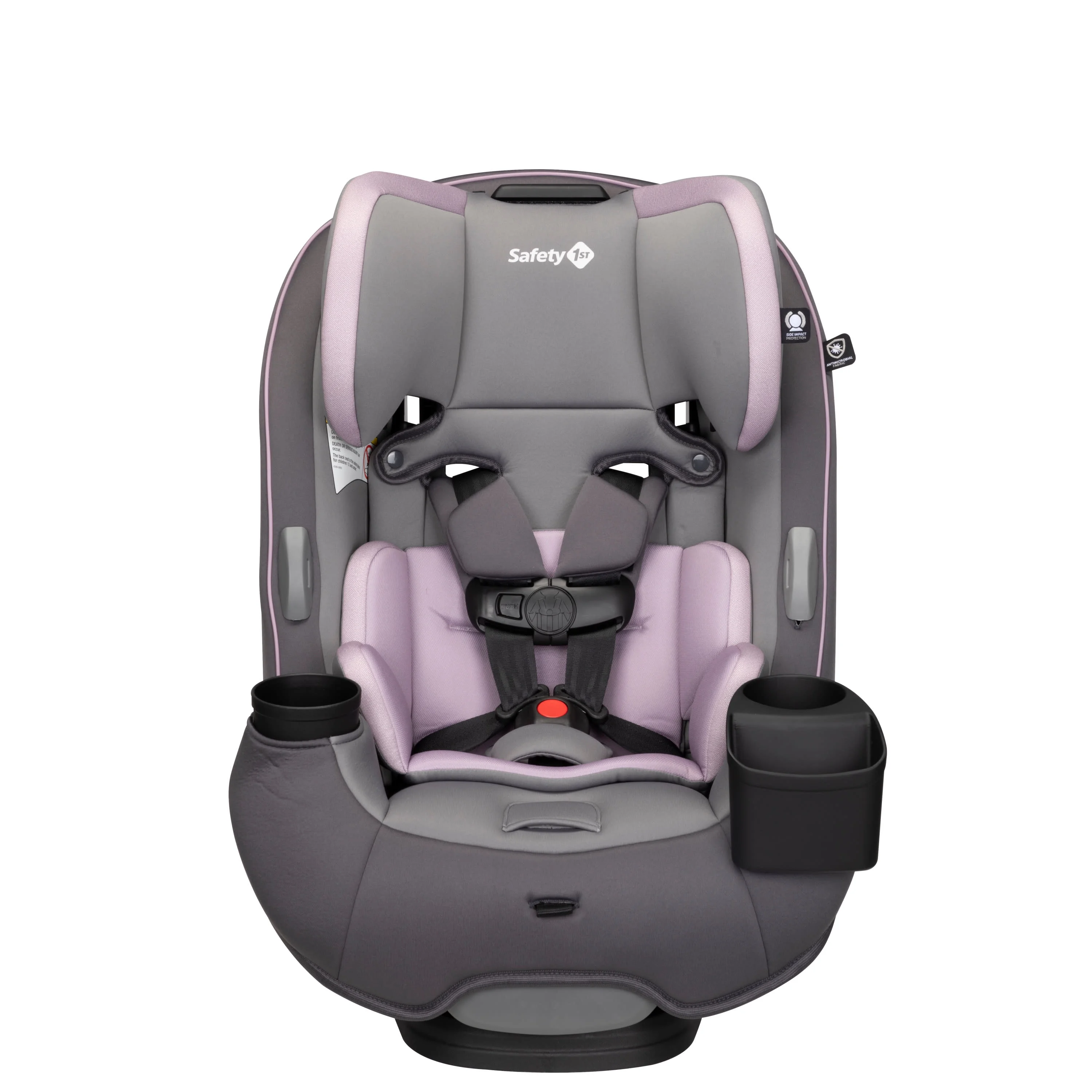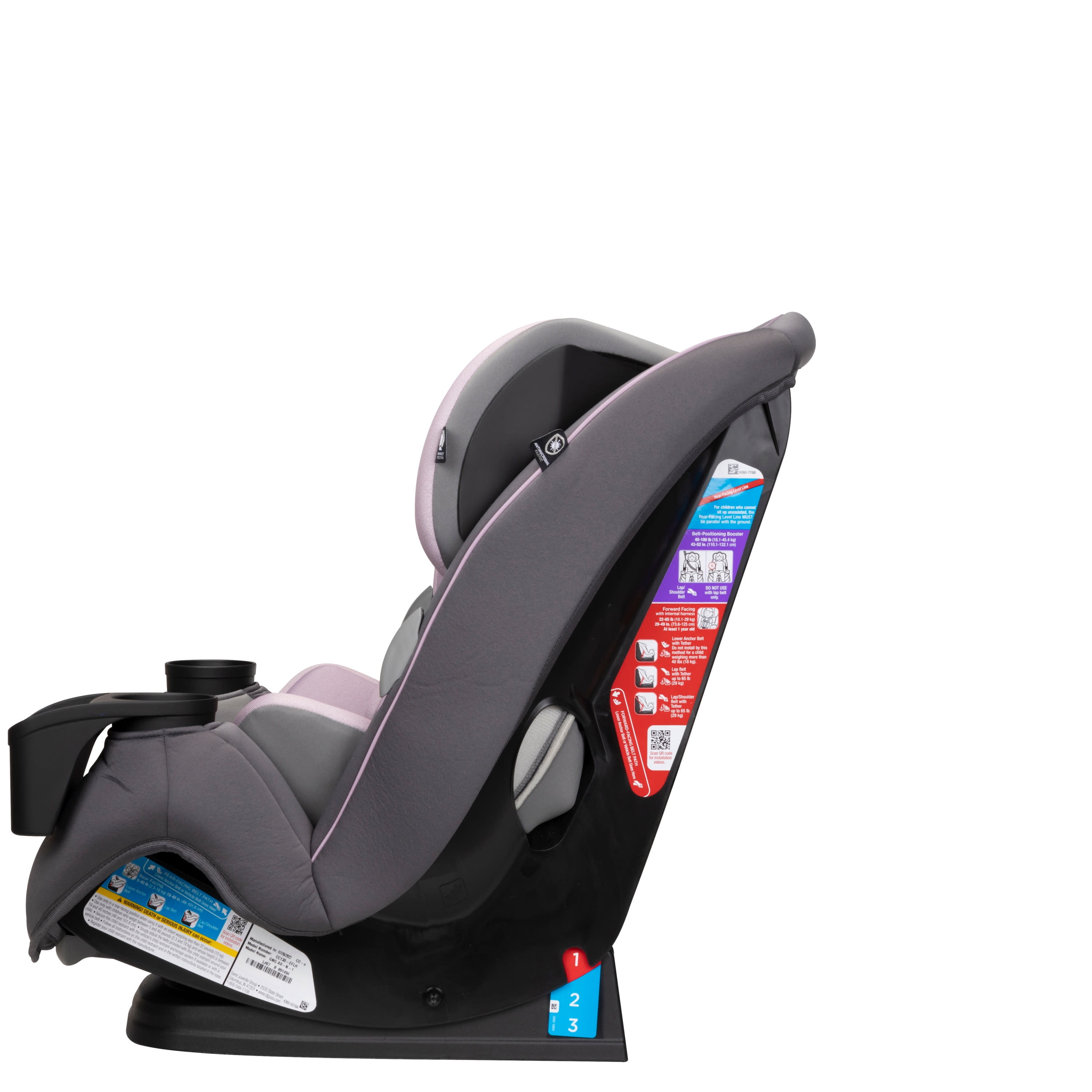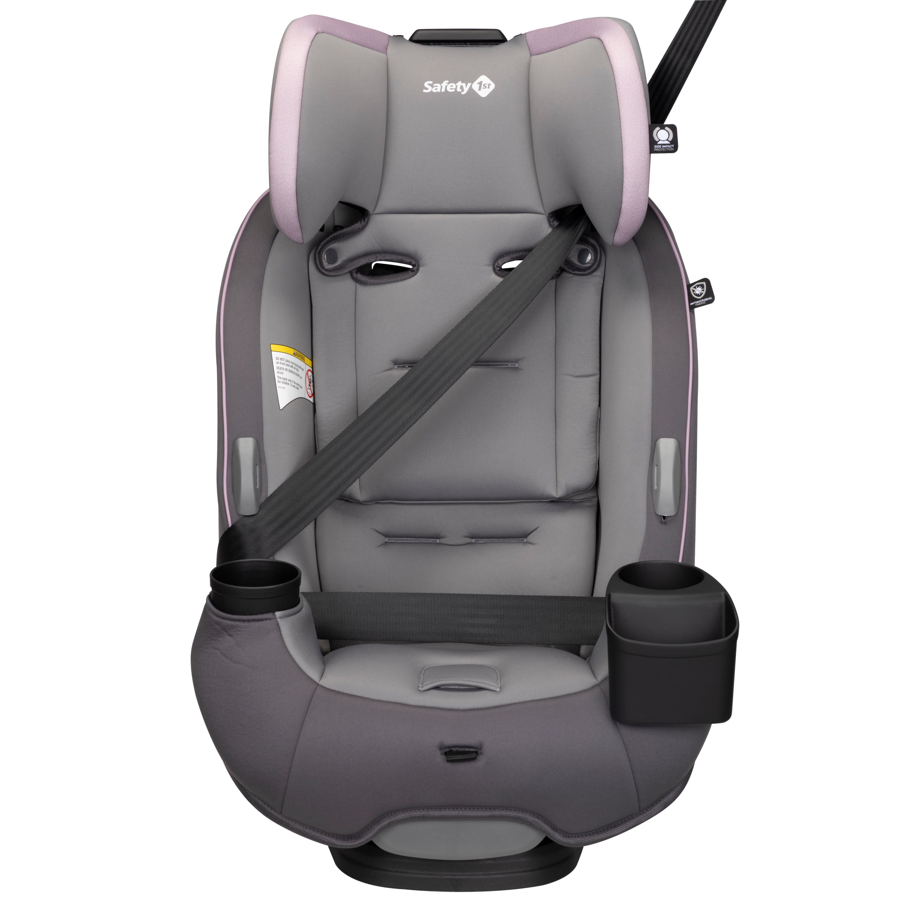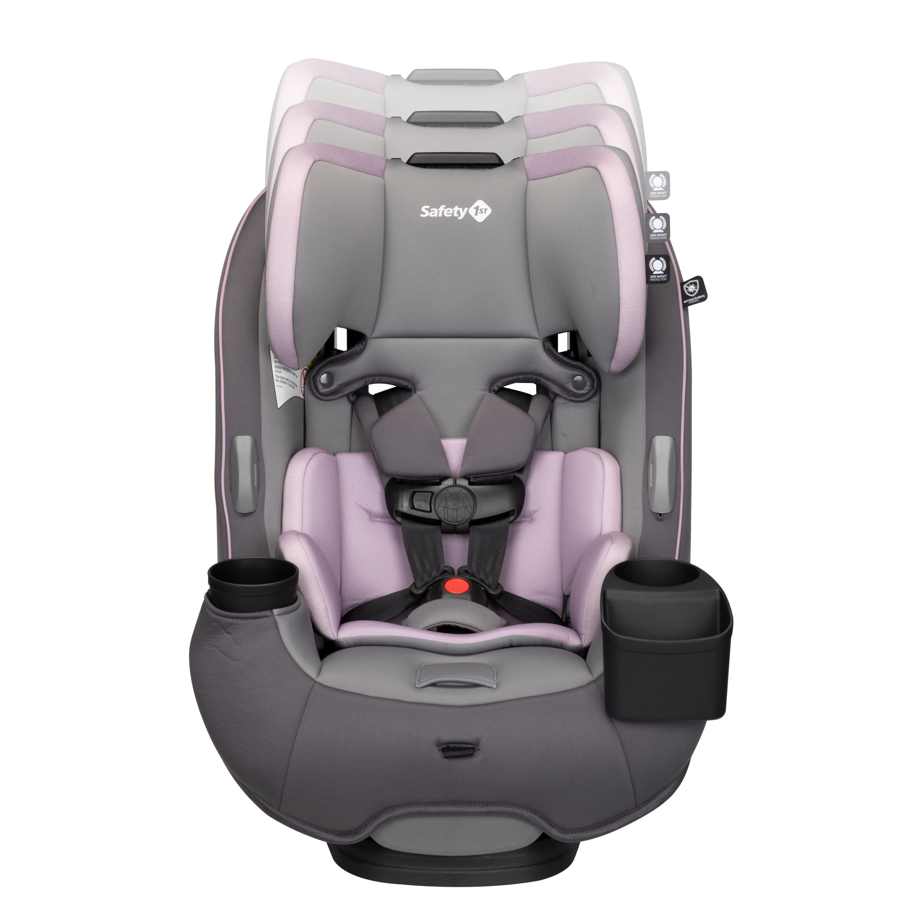 All-in-One Convertible Car Seat, built to GROW for extended use through 3 stages: rear-facing (5–40 lbs., 19″–40″), forward-facing (30–65 lbs., 34.4″–49″), and belt-positioning booster (40–100 lbs., 43.4″–52″). (Actual fit may vary. Not all children will comfortably fit in the seat for the full weight and height ranges listed.) QuickFit™ harness to adjust harness and headrest in one easy step Clearly visible booster belt path for easier buckling 2 removable, dishwasher-safe cup holders 1 device storage area Machine-washable and dryer-safe seat pad; removes smoothly for easy cleaning Seat pad made with antimicrobial fabric to inhibit the growth of bacteria and odor-causing microbes Harness holders for easy in and out of seat 3-position recline for the perfect fit in your car Grow-with-baby pillows for a comfortable ride Meets or exceeds federal safety standards