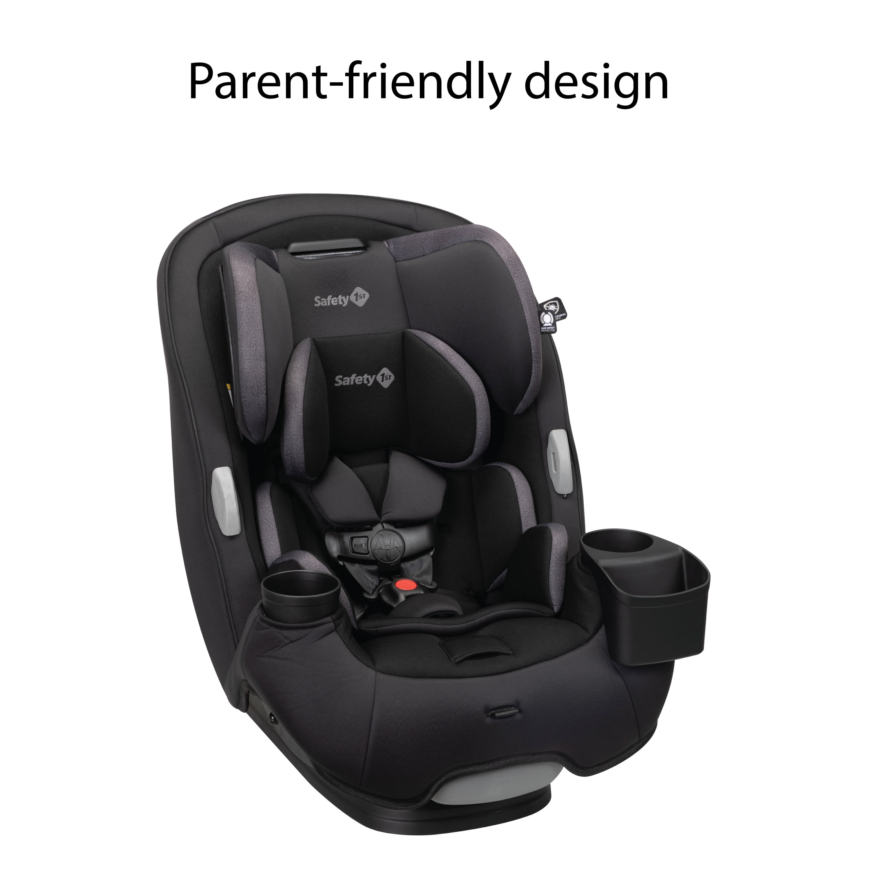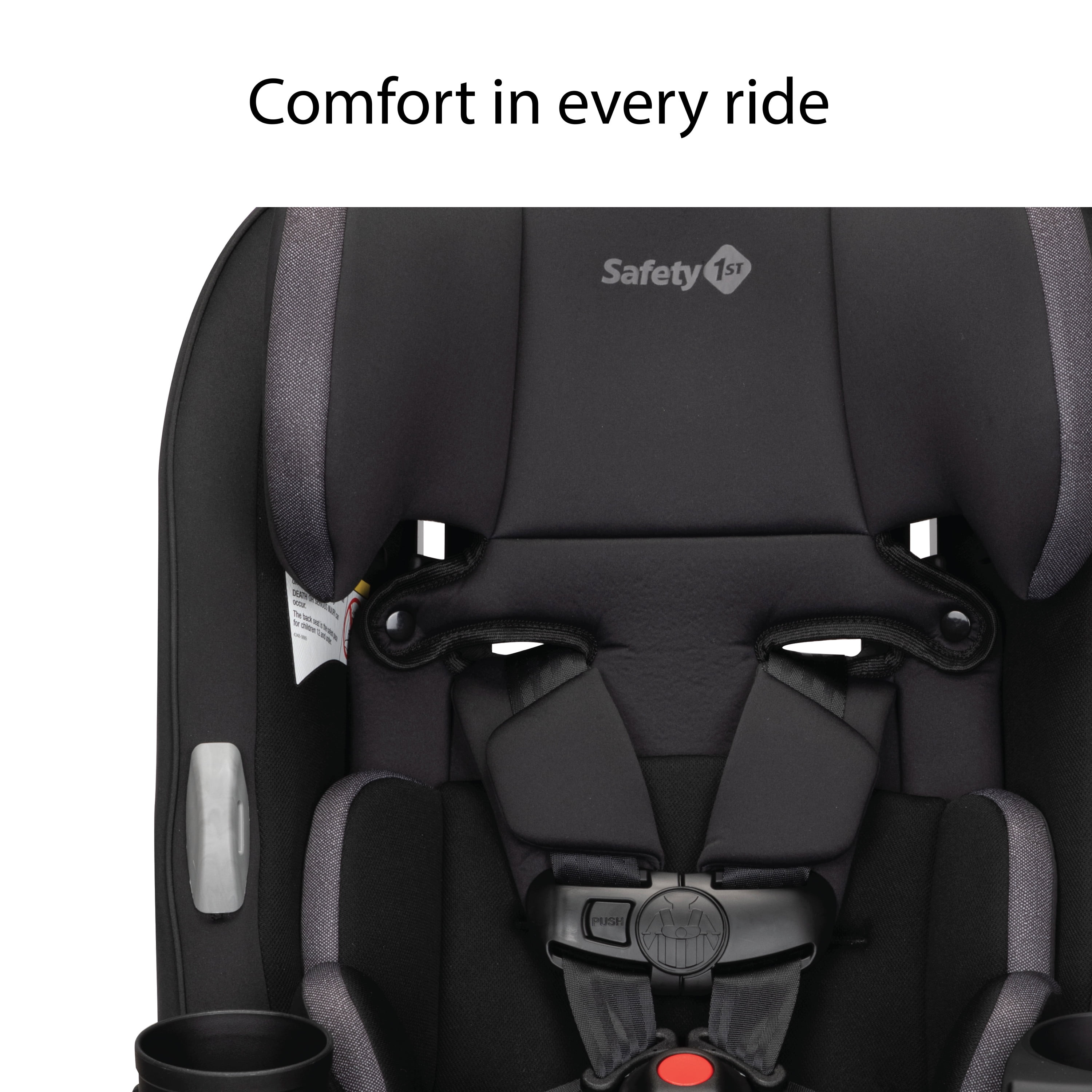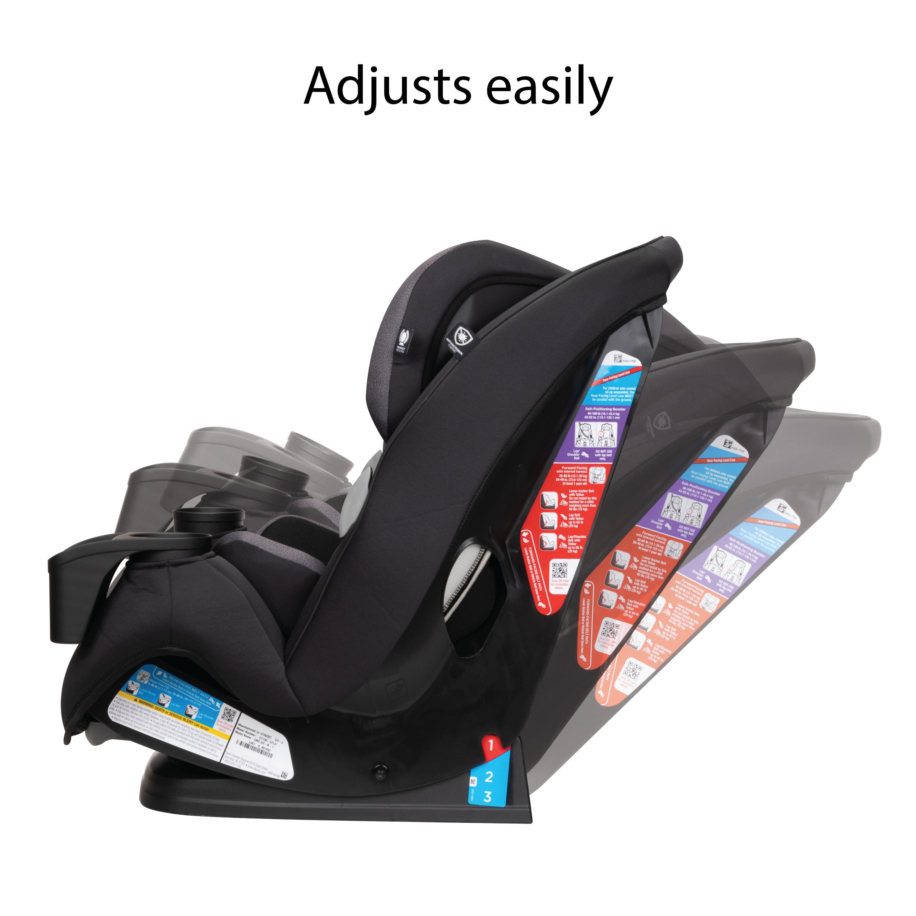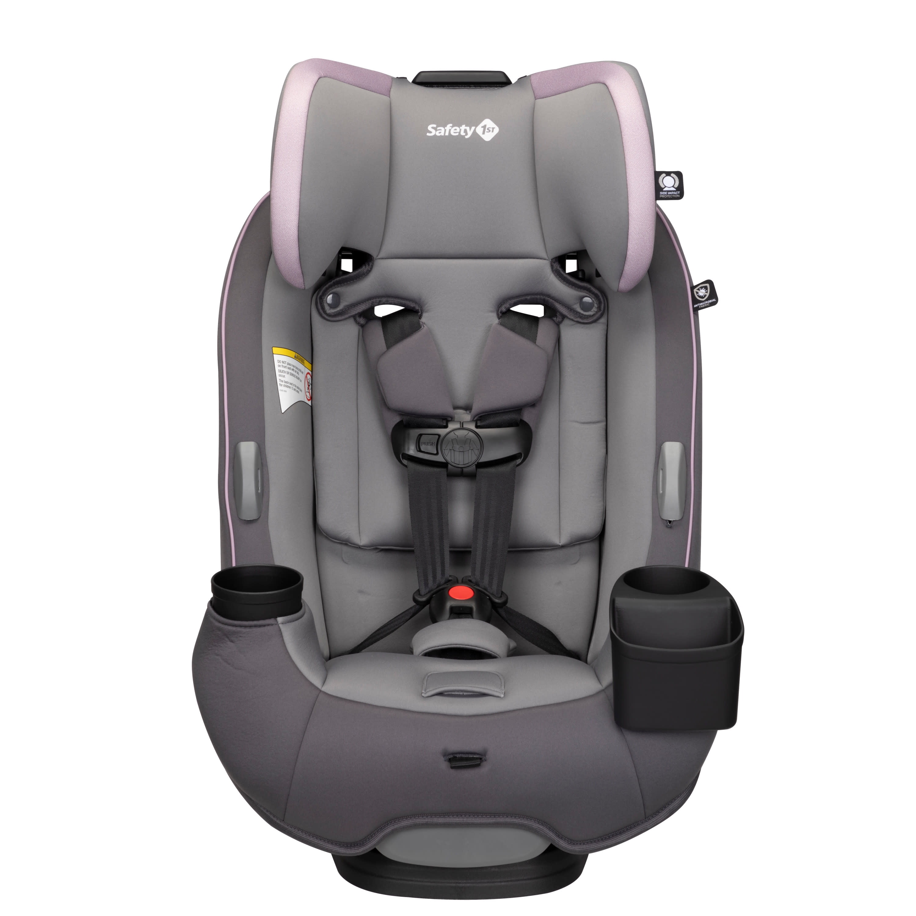 All-in-One Convertible Car Seat, built to GROW for extended use through 3 stages: rear-facing (5–40 lbs., 19″–40″), forward-facing (30–65 lbs., 34.4″–49″), and belt-positioning booster (40–100 lbs., 43.4″–52″). (Actual fit may vary. Not all children will comfortably fit in the seat for the full weight and height ranges listed.) QuickFit™ harness to adjust harness and headrest in one easy step Clearly visible booster belt path for easier buckling 2 removable, dishwasher-safe cup holders 1 device storage area Machine-washable and dryer-safe seat pad; removes smoothly for easy cleaning Seat pad made with antimicrobial fabric to inhibit the growth of bacteria and odor-causing microbes Harness holders for easy in and out of seat 3-position recline for the perfect fit in your car Grow-with-baby pillows for a comfortable ride Meets or exceeds federal safety standards