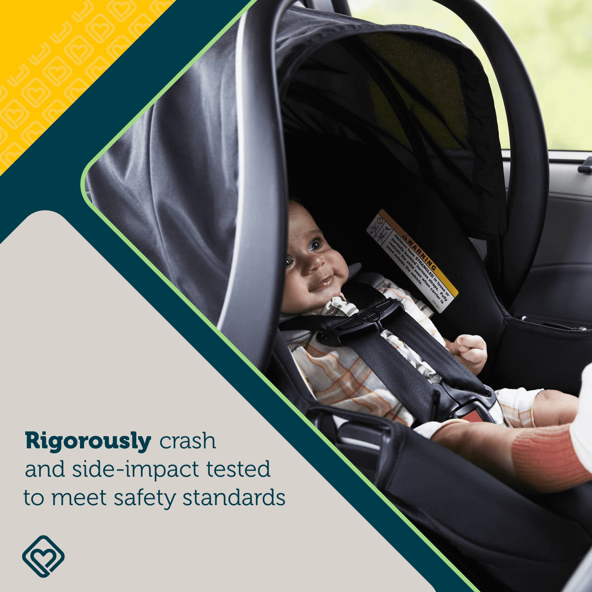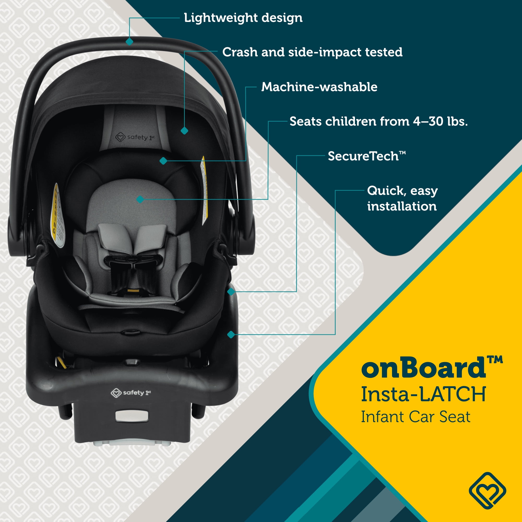 Provide your baby with a secure and comfortable ride with the Safety 1st onBoard Insta-Latch Infant Car Seat. The best part of this car seat is how quick and easy it is to install with the Safety 1st onBoard Insta-Latch connectors––in 3 simple steps, you can quickly attach the car seat base to the vehicle seat with the self-retracting one-click LATCH connectors. SecureTech™ red-to-green indicators on the seat’s base allow you to see when your base is secured from the LATCH or vehicle belt. To give you the confidence of knowing that the base is correctly installed, the tab turns from red to green. Since every car is different, you can also adjust the base height for the right fit to your car. The 4 harness heights are designed to give your child a better fit from 4–30 lbs.(and less than 32″). The harness adjusts easily from the front of the seat with a simple pull to securely fit your child. The buckle adjusts in two ways so that you can customize the length and the buckle’s position on your child. Your baby will be nice and comfortable relaxing in the soft fabrics and plush padding. Smaller babies get the extra support they need with head and body inserts that can be removed as they grow. Safety 1st believes parenting should have fewer worries and more joyful moments. As the first and only leader in child safety, Safety 1st is here to give you peace of mind so you can spend less time worrying and more time enjoying every first you experience with your child.