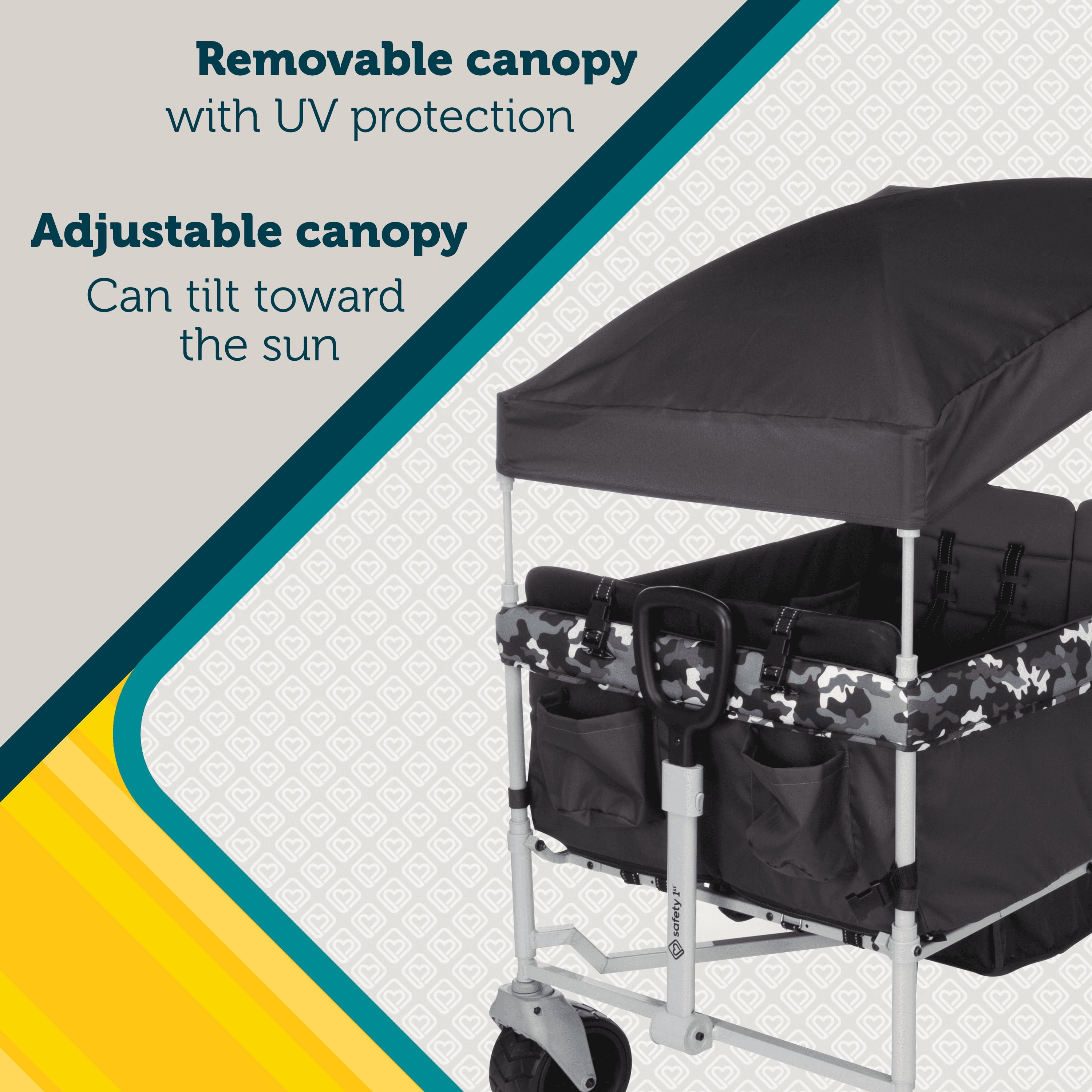 The Summit Sprint Quad Wagon Stroller is designed for more kids, more cargo, and more fun for the whole crew. Parents will love the versatile seating design: all 4 seats fold down individually to make room for gear or fold up to seat up to 4 kids at once. Each seat holds a child up to 40 lbs. and the wagon stroller also holds an additional 20 lbs. of storage throughout its 6 pockets and storage basket, for a maximum weight of 180 lbs. The Summit Sprint Quad Wagon Stroller’s all-terrain tires make it easy to stroll through parks, trails, or sandy beaches. It can either be pulled from the front handle like a traditional wagon or pushed like a stroller with the fold-away back handlebar. There’s plenty of storage with 4 storage pockets on the inside, 2 on the outside, and an extra fold-away basket. The removable canopy with UV protection can be tilted and adjusted as needed. After each adventure, the wagon folds up with 1 hand for quick and easy storage. Safety 1st believes parenting should have fewer worries and more joyful moments. As the first and only leader in child safety, Safety 1st is here to give you peace of mind so you can spend less time worrying and more time enjoying every first you experience with your child.