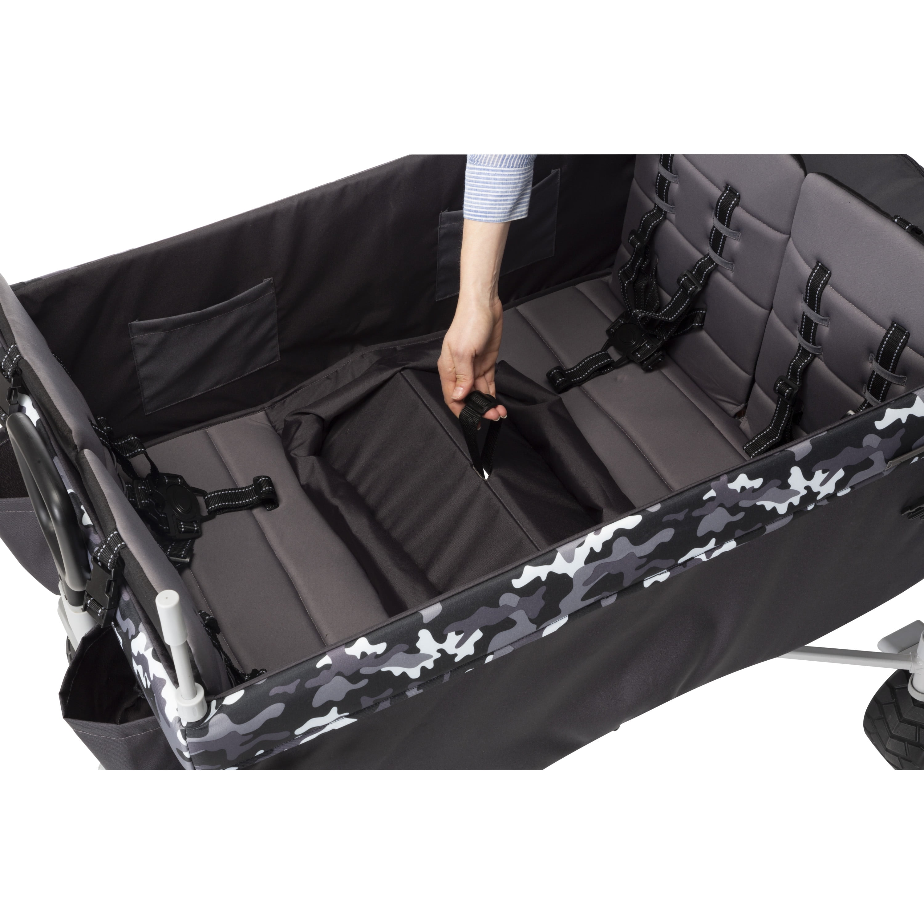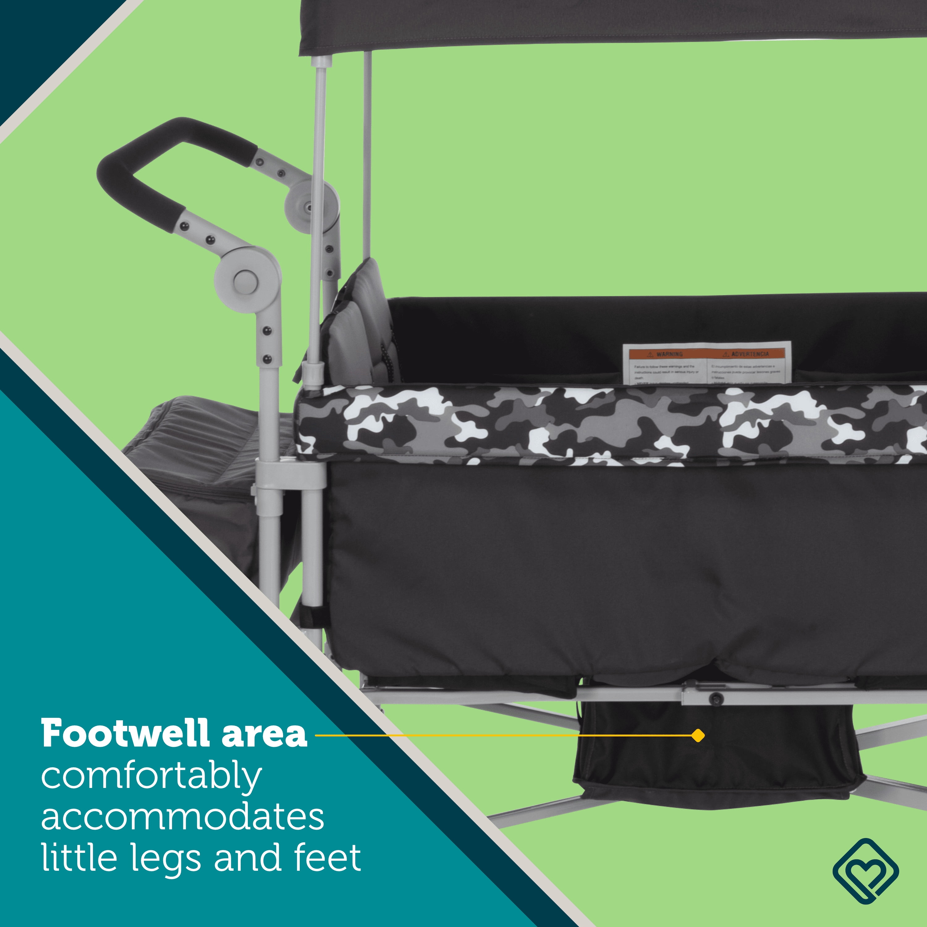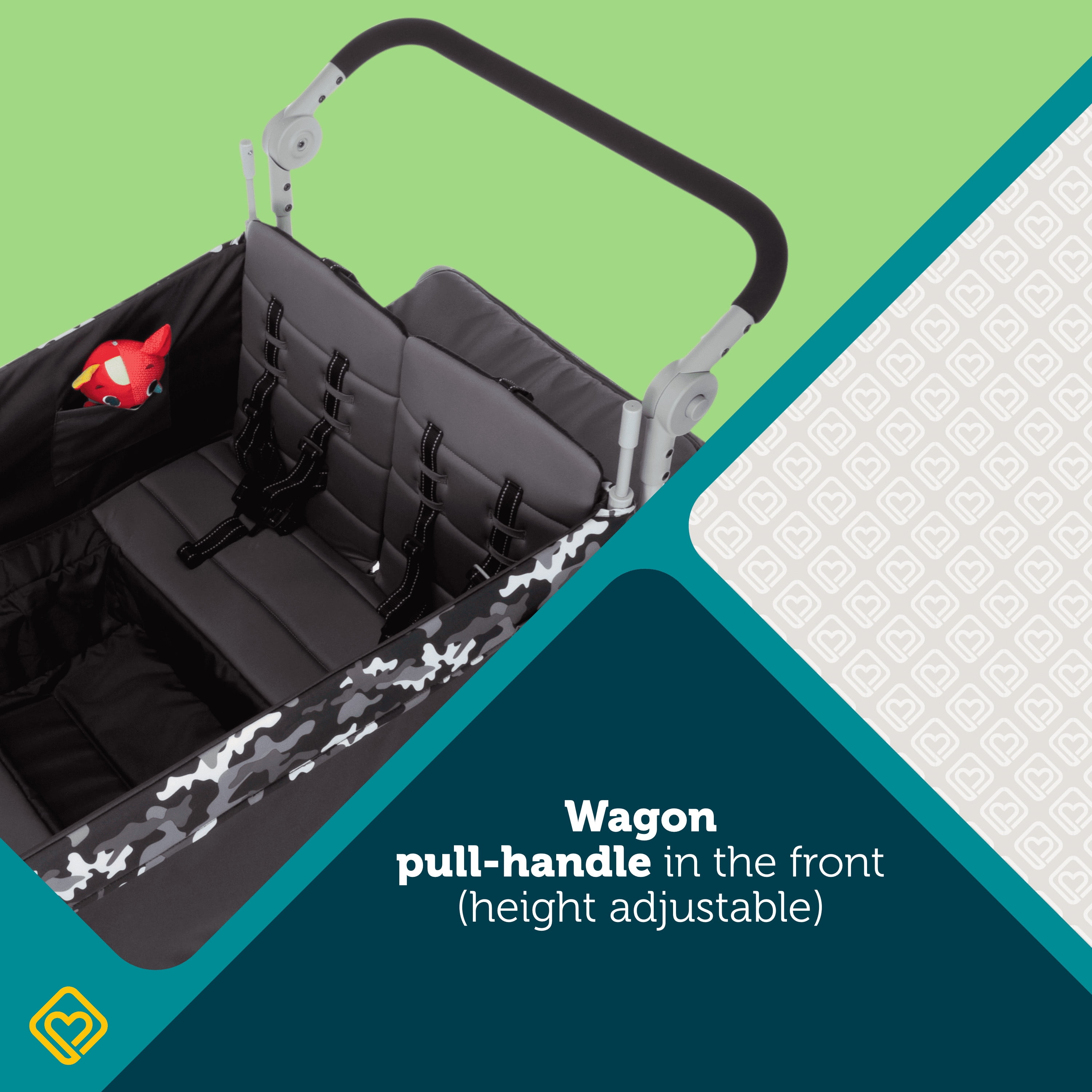 Seats up to 4 children (2 per bench) Weight limit = 40 lbs. per seat Wagon pull-handle in the front and fold-away push handlebar in the back (both are height adjustable) All-terrain wheels easily maneuver over grass, dirt, and sand 1-hand fold for quick and easy storage All 4 seats fold down individually to make room for gear or fold up to seat up to 4 kids at once Removable canopy with UV protection has adjustable poles that tilt the canopy toward the direction of the sun Extra storage in the fold-away basket 4 storage pockets on the inside and 2 on the outside Footwell area comfortably accommodates little legs and feet 5-point safety harnesses Padded, plush seats Unisex Quad Wagon Stroller