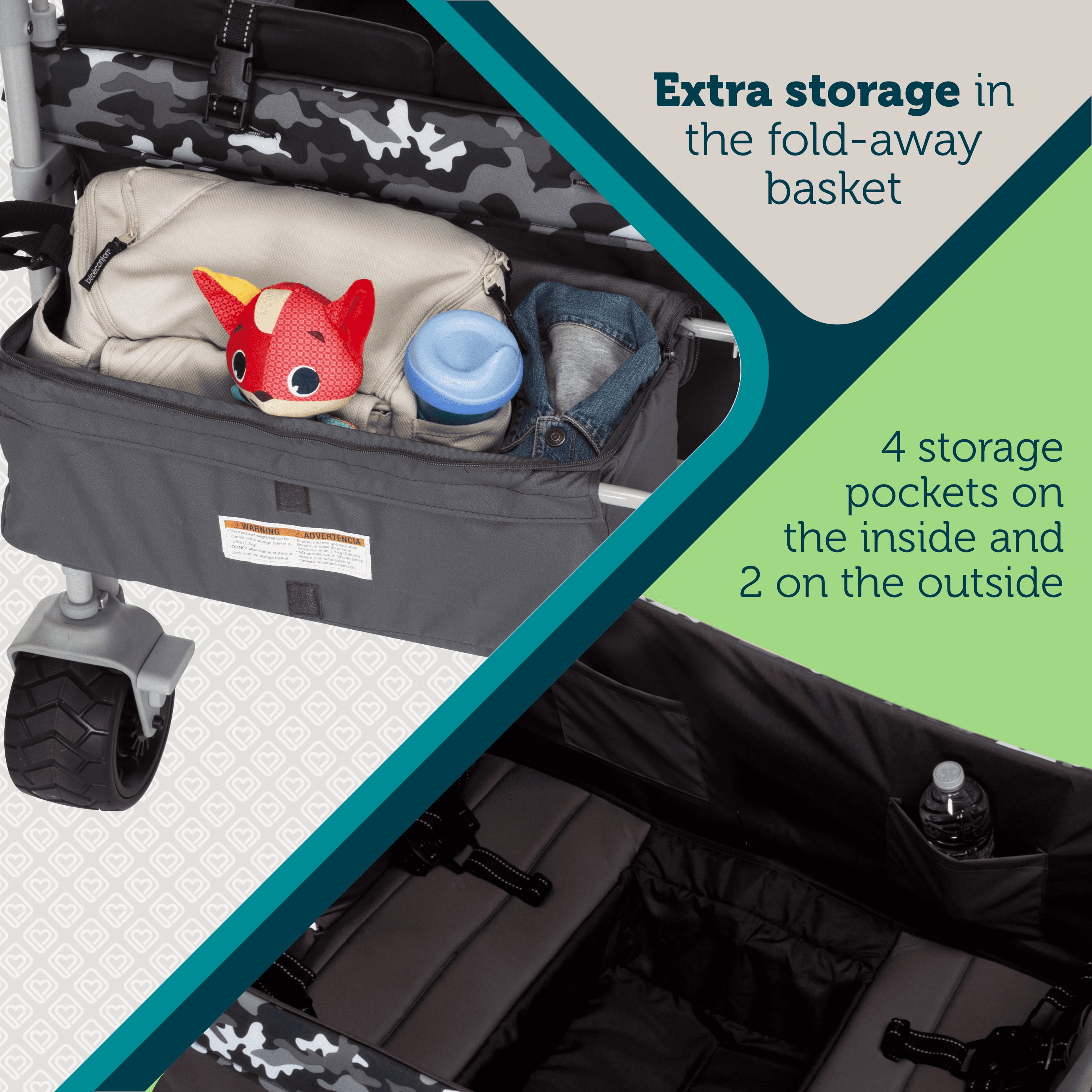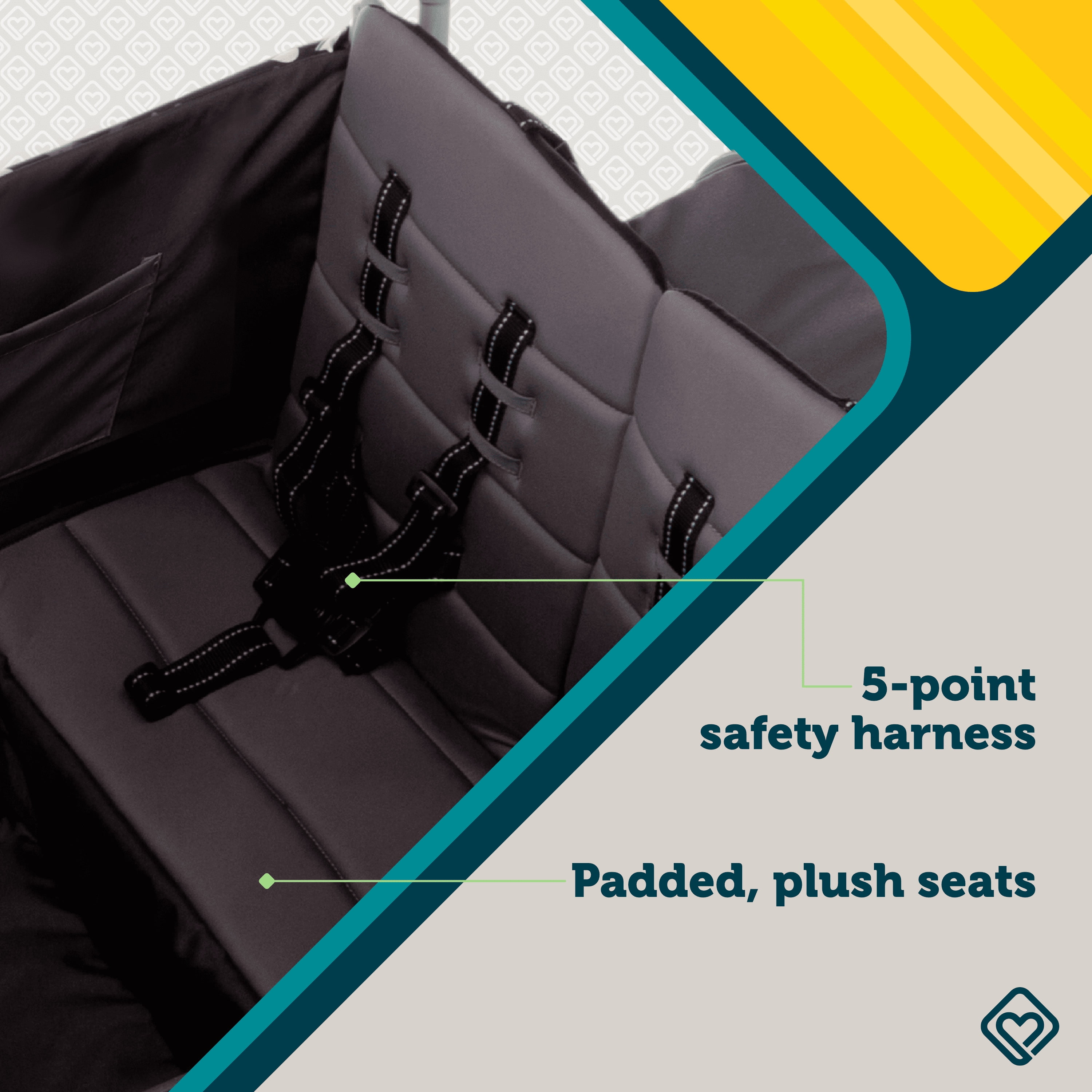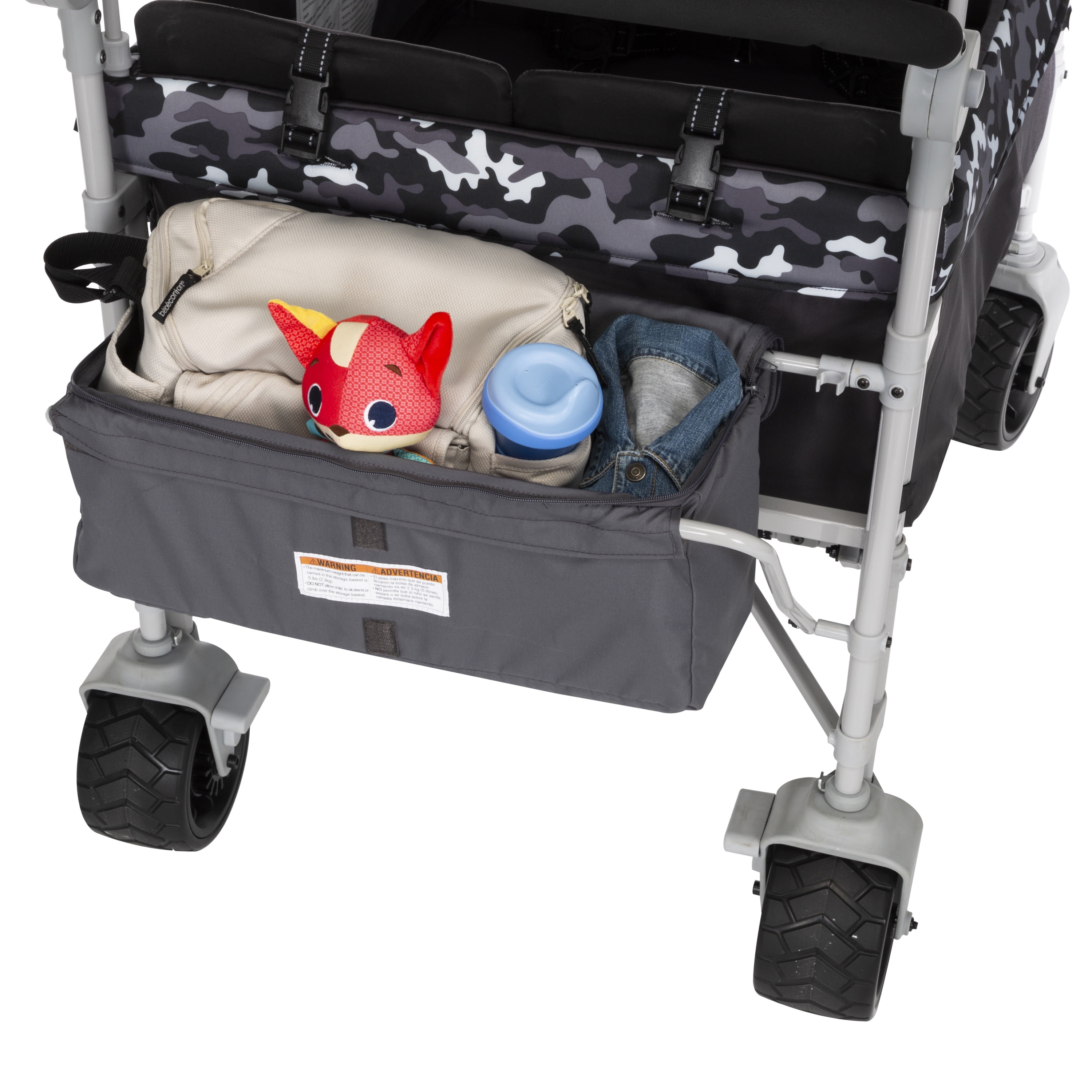 Seats up to 4 children (2 per bench) Weight limit = 40 lbs. per seat Wagon pull-handle in the front and fold-away push handlebar in the back (both are height adjustable) All-terrain wheels easily maneuver over grass, dirt, and sand 1-hand fold for quick and easy storage All 4 seats fold down individually to make room for gear or fold up to seat up to 4 kids at once Removable canopy with UV protection has adjustable poles that tilt the canopy toward the direction of the sun Extra storage in the fold-away basket 4 storage pockets on the inside and 2 on the outside Footwell area comfortably accommodates little legs and feet 5-point safety harnesses Padded, plush seats Unisex Quad Wagon Stroller