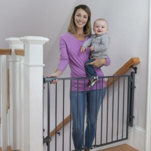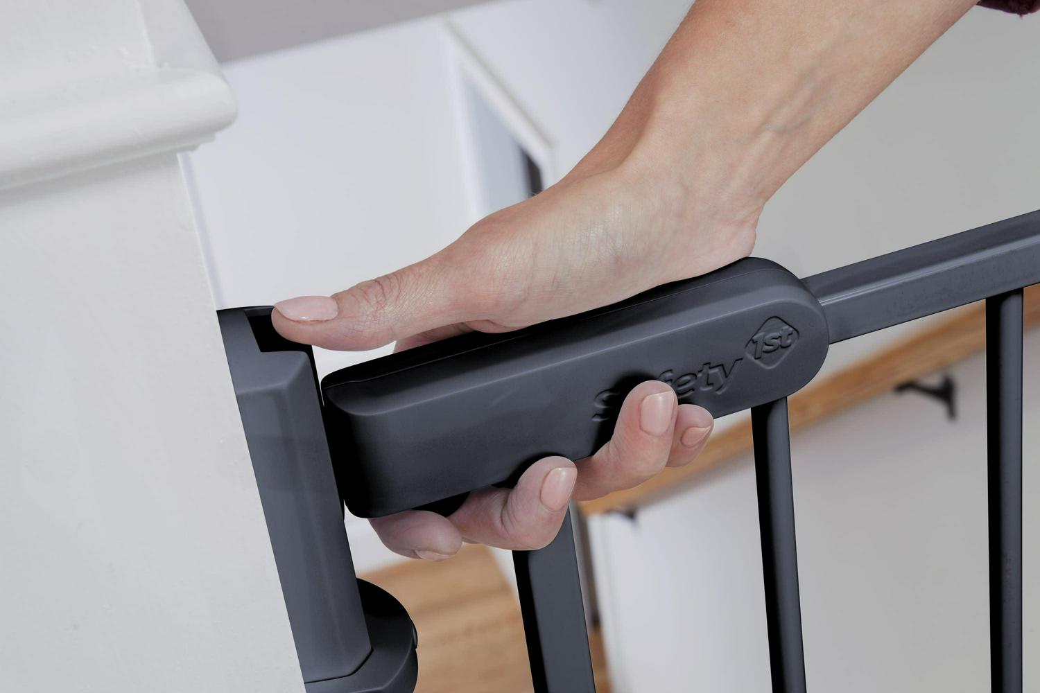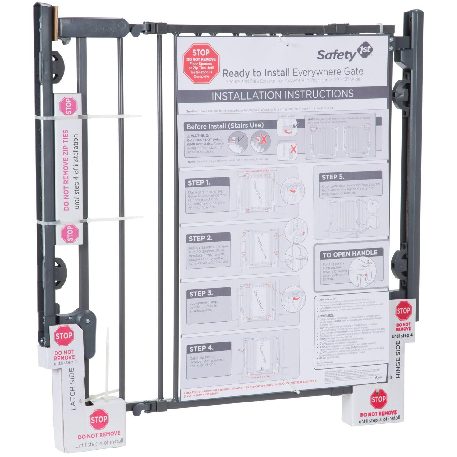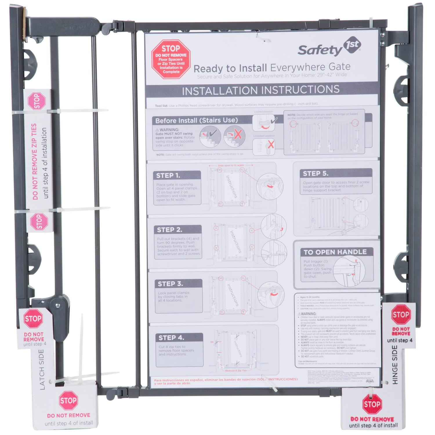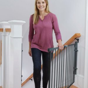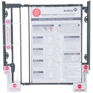 Now that baby is on the move, you can easily keep stairways off limits with the Ready to Install Gate from Safety 1st. This hardware mounted security gate with a no trip design is perfect for any room in the home including the top of stairs, bottom of stairs, and between rooms. There’s no measuring, marking or need to level thanks to the innovative packaging. The gate comes out of the box in one piece to ensure your install will be hassle free. While other gates require multiple parts, and extra steps that lead to frustration; this fully assembled gate installs easily in 15 minutes – half the time of a standard gate install. Operating this safety gate is easy too. The no threshold design means no trip hazard at the top of the stairs. One-hand operation and a swing-open door make it easier to pass through, and the gate closes with just a push, letting you get on your way. Note: Requires a flat mounting surface at least 3.5″ wide.