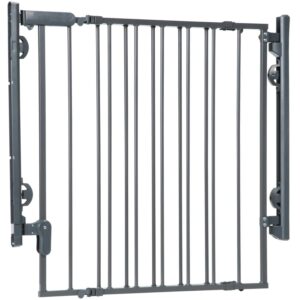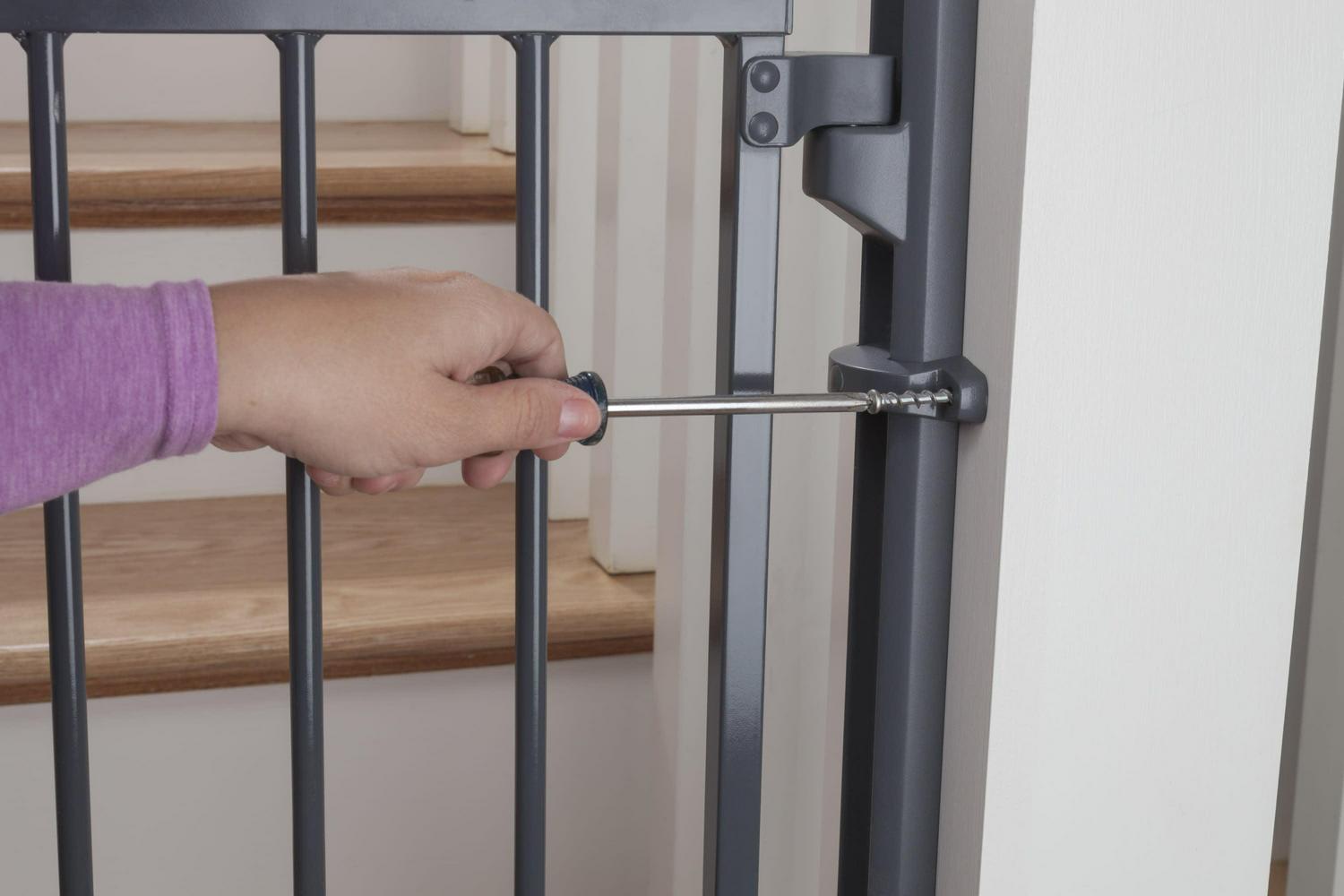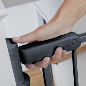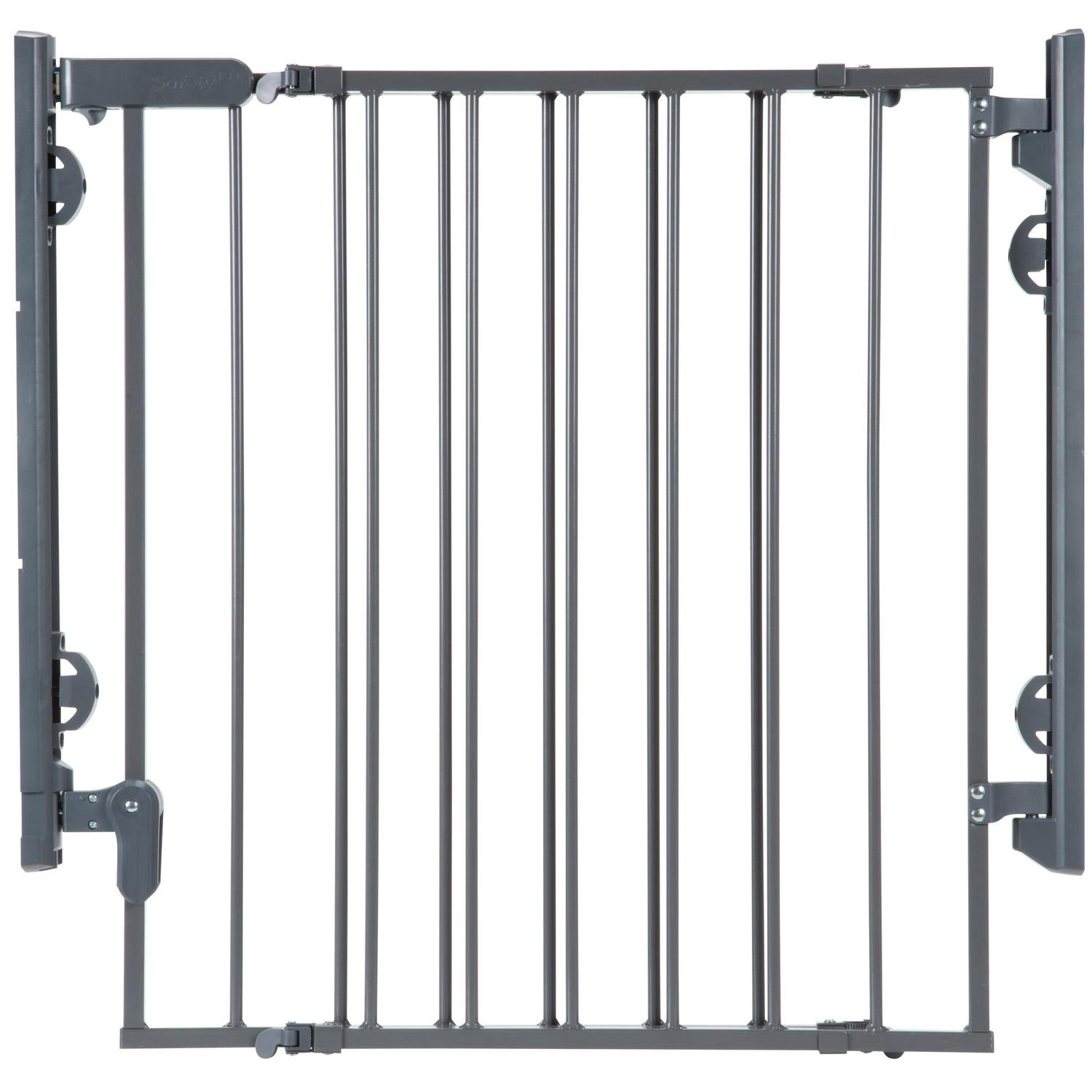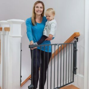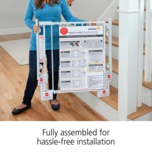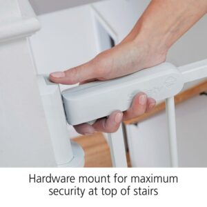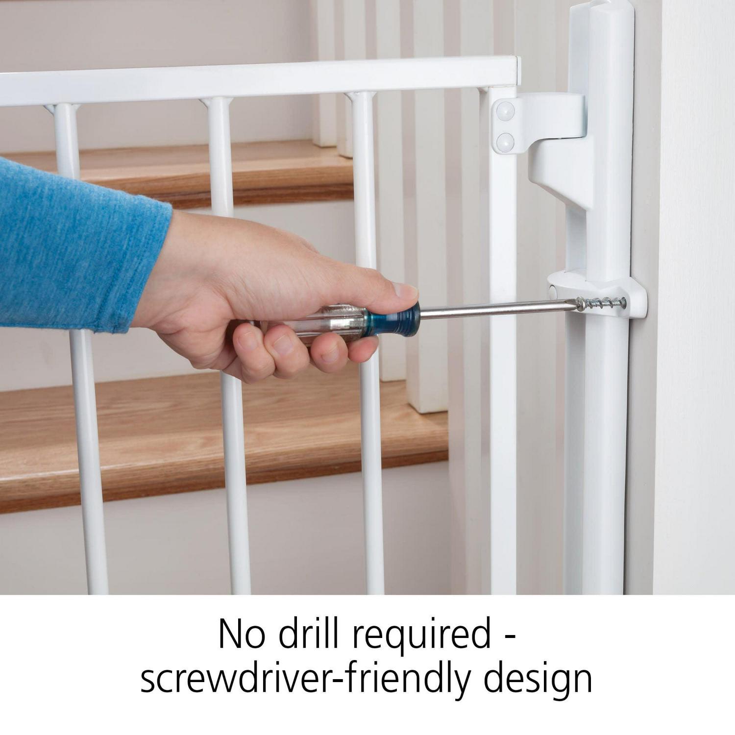 Now that baby is on the move, you can easily keep stairways off limits with the Ready to Install Gate from Safety 1st. This hardware mounted security gate with a no trip design is perfect for any room in the home including the top of stairs, bottom of stairs, and between rooms. There’s no measuring, marking or need to level thanks to the innovative packaging. The gate comes out of the box in one piece to ensure your install will be hassle free. While other gates require multiple parts, and extra steps that lead to frustration; this fully assembled gate installs easily in 15 minutes – half the time of a standard gate install. Operating this safety gate is easy too. The no threshold design means no trip hazard at the top of the stairs. One-hand operation and a swing-open door make it easier to pass through, and the gate closes with just a push, letting you get on your way. Note: Requires a flat mounting surface at least 3.5″ wide.
