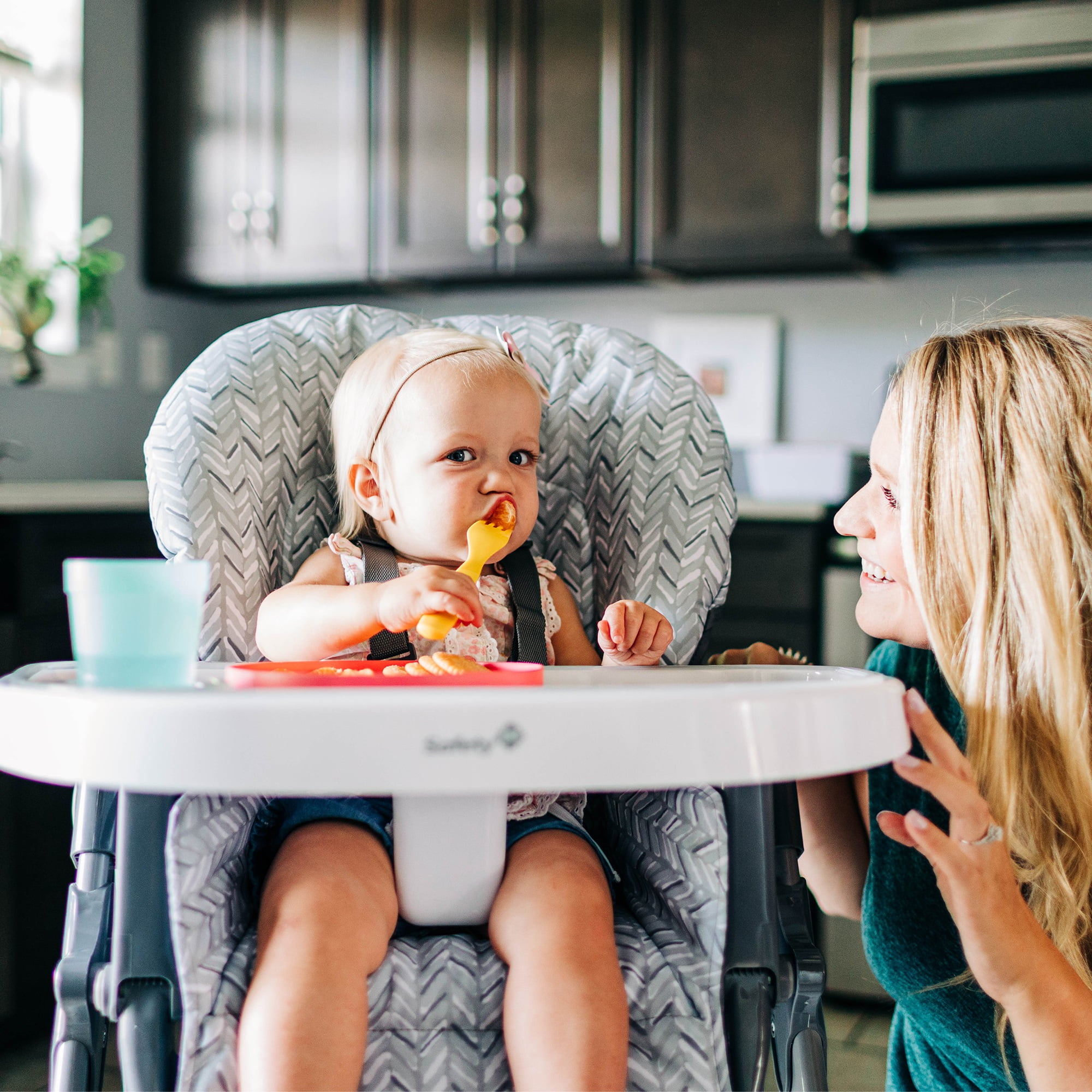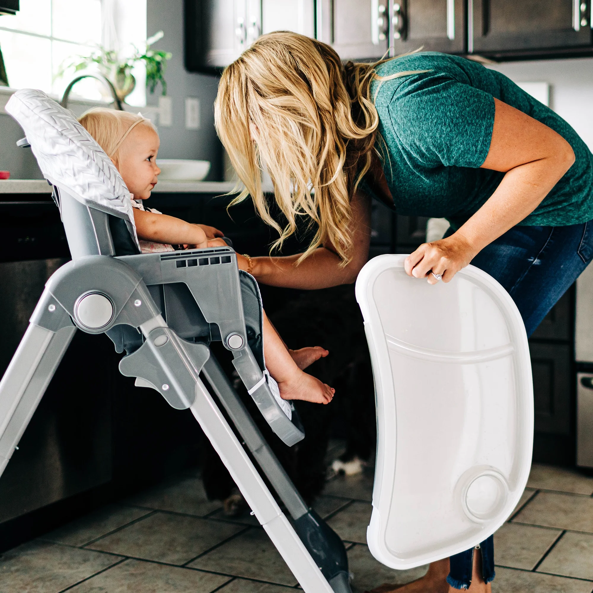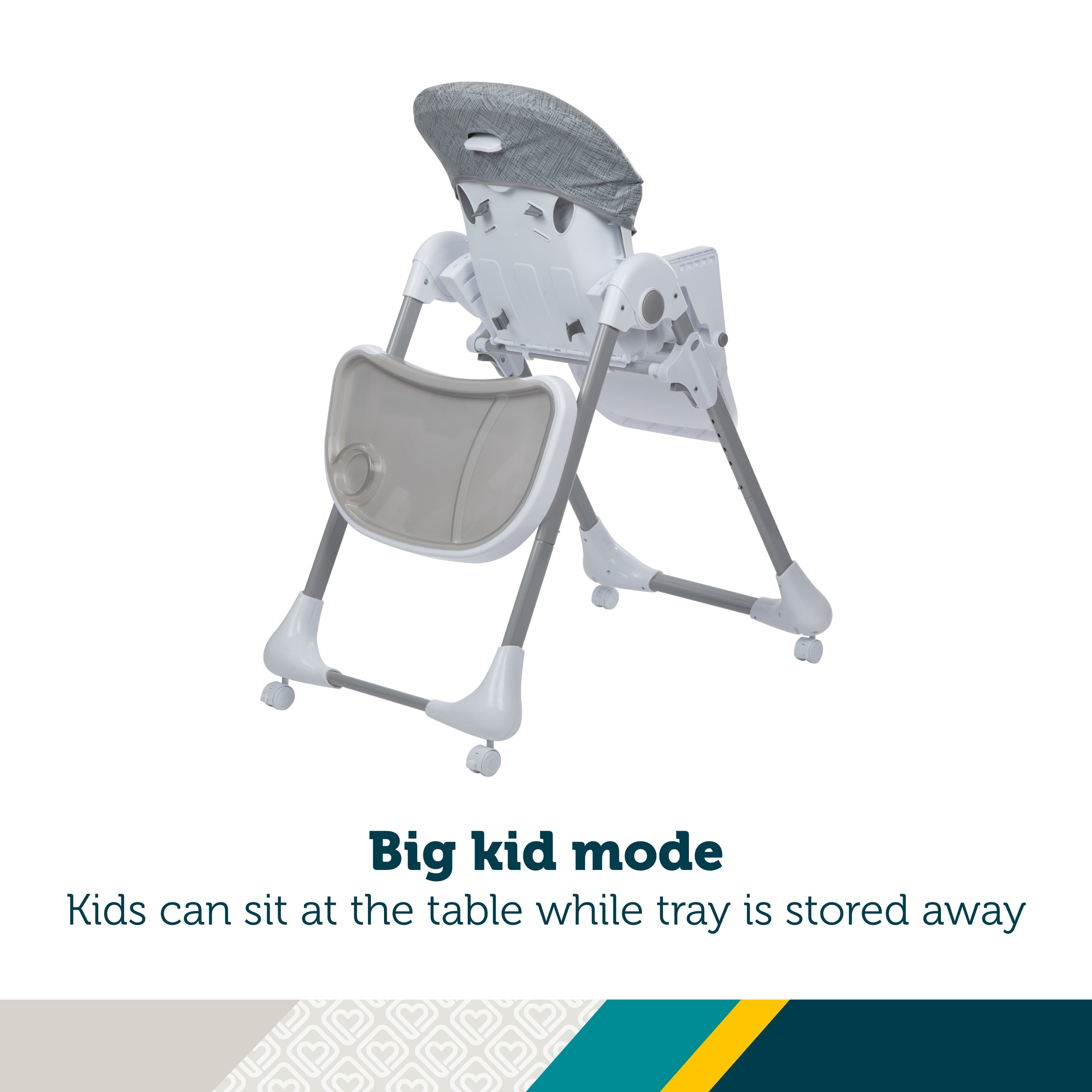 The latest addition to our Grow and Go Collection rolls right up to the kitchen table with ease. This 3-in-1 high chair grows as your child goes…and smears yogurt, fruit, mac n’ cheese and everything else all over it. With 3 modes of use, it seats babies and toddlers, from their first spoon-fed meal to their first spoon-held fling across the room. The infant recliner has 3 positions to accommodate babies. The toddler high chair has 6 height positions and an adjustable footrest for your growing child. And when your little one becomes a “big kid”, the tray removes so your child can join you at the table.Kitchen cleanup can be exhausting, but you can take comfort in knowing that the insert tray is dishwasher safe and the seat cover comes off for an easy wipe down. If you need to free up some space, you can easily roll the high chair out of the way and store it upright. Enjoy meals together while your baby or toddler sits comfortably at the table, as you sit sporting a fancy spaghetti wig.