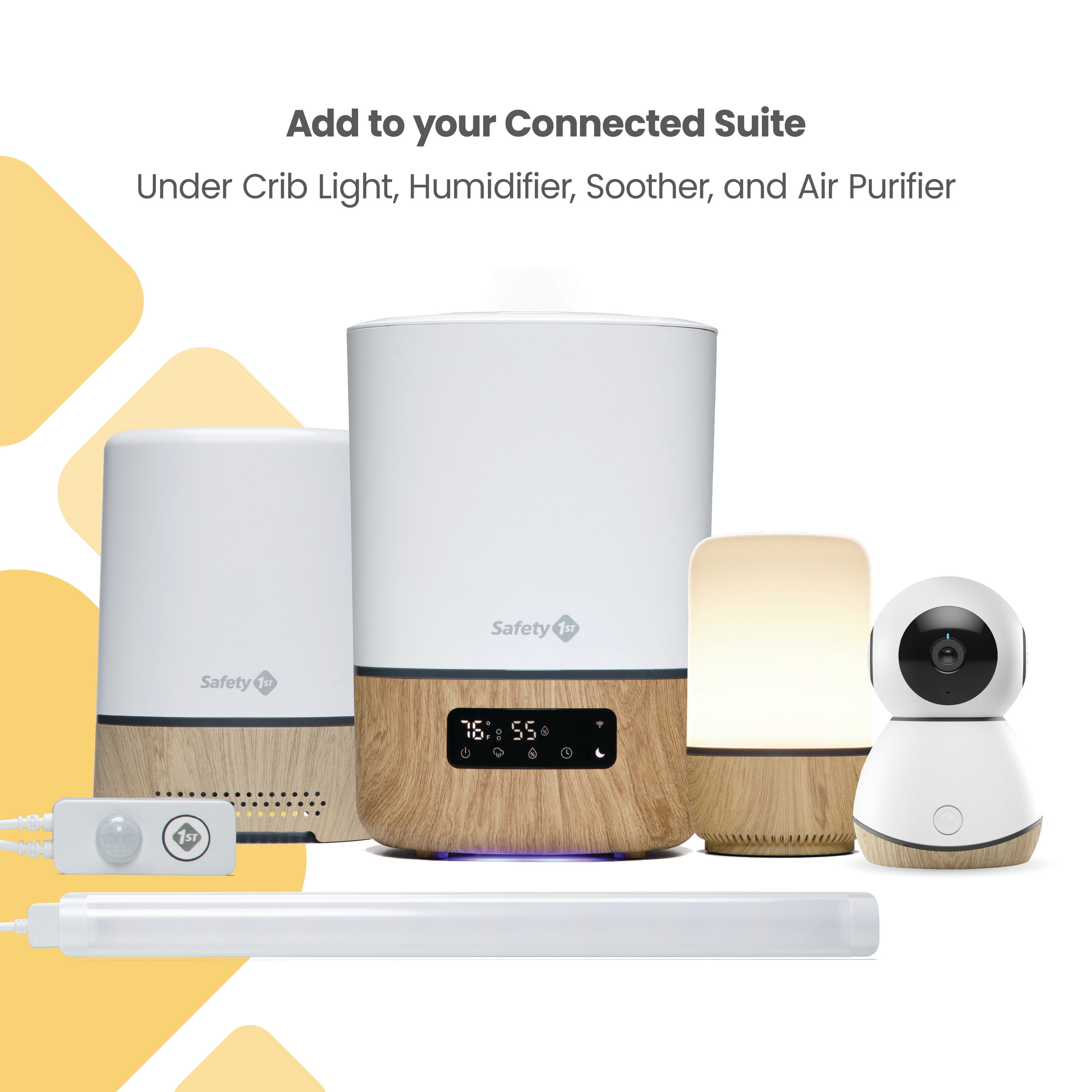 Stay connected to your child, even when you’re apart with the 360° Smart Baby Monitor from Safety 1st. This 1080p HD live-streaming Wi-Fi monitor features crystal-clear daytime color and advanced night vision, with remote-controlled full-motion pan, tilt, and zoom. With a built-in soother that includes lullabies and white noise, cry detection, temperature and humidity sensors, and two-way talk, it’s more than just a monitor. As part of the Safety 1st Connected Suite, the 360° Monitor pairs with Safety 1st’s free and easy-to-use, family-friendly Connected app, which seamlessly controls and manages every device in the suite. Create the optimal environment, set the mood, monitor, and comfort your child—anytime, from anywhere.