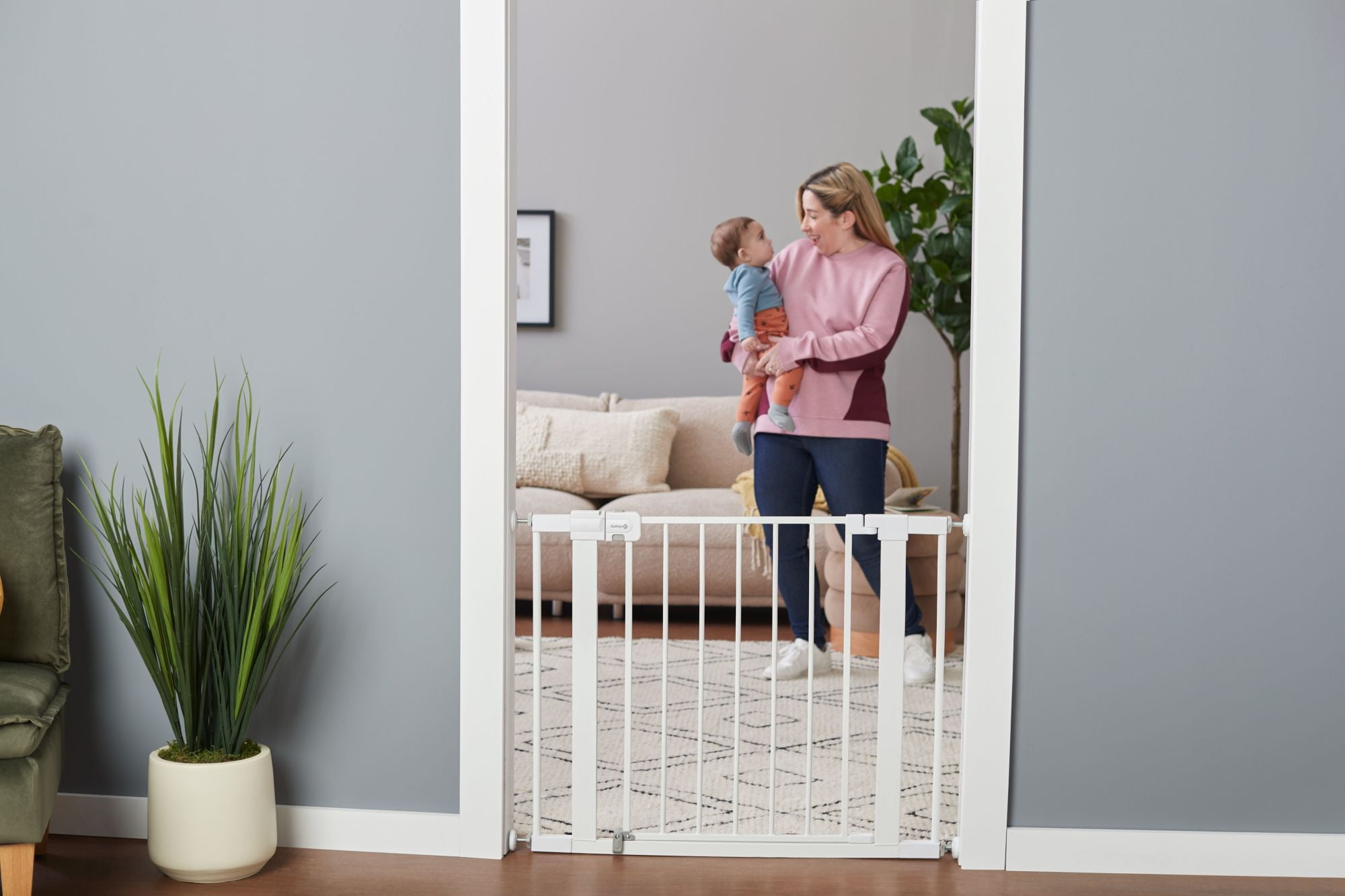 Now that baby is on the move, the Safety 1st Easy Install Walk-Through Gate is a simple way to create child friendly areas within your home. For use between rooms, this walk-through gate makes it easy to babyproof and get around the house without the need to reinstall it each time you pass by. This gate features SecureTech®, our red-to-green indicator on the top rail that allows you to see when your gate is securely locked. Pressure-installed gates are a great way to provide flexibility while using them throughout your home. Wall cups stay installed to the wall while the gate itself can be easily removed for the times it isn’t needed. The gate is 28” high and can be adjusted from 29”–38” for doorways of varying widths throughout your home. The Safety 1st Easy Install Walk-Through Gate isn’t just for kids either. It comes in handy when you’re trying to keep pets out of certain rooms as well.