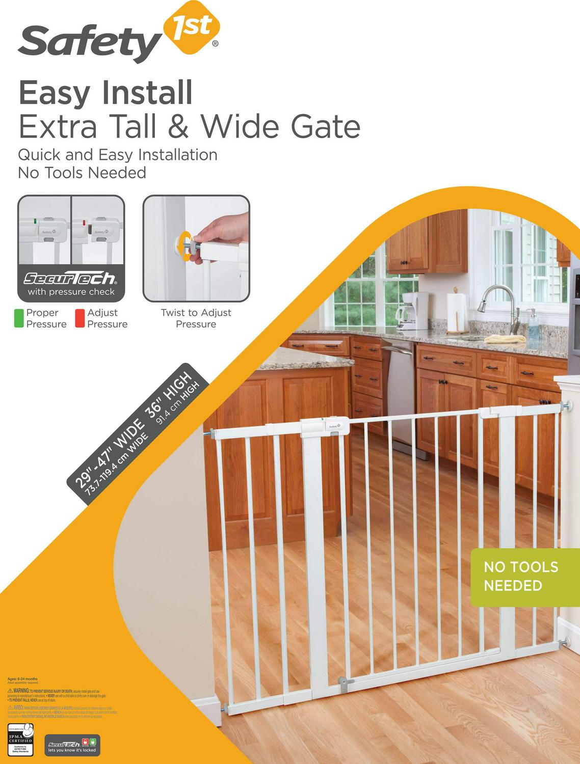 Now that baby is on the move, the Safety 1st Easy Install Extra Tall & Wide Baby Gate makes it simple to create child friendly areas within your home. For use between rooms, a walk-through gate makes it easy to get around the house, with no need to reinstall it each time you pass by. This gate features SecureTech, our red-to-green indicator on the top rail allows you to see when your gate is securely locked. Pressure-installed gates provide flexibility in usage around the home. Wall cups stay installed to the wall while the gate can easily be removed for periods of non-use. An extra-wide gate lets you easily block off the larger throughways in your home. The gate is 36 high and can be adjusted from 29 47 . The Safety 1st Easy Install Extra Tall & Wide gate isn’t just for kids either. It comes in handy when you’re trying to keep pets out of certain rooms as well.